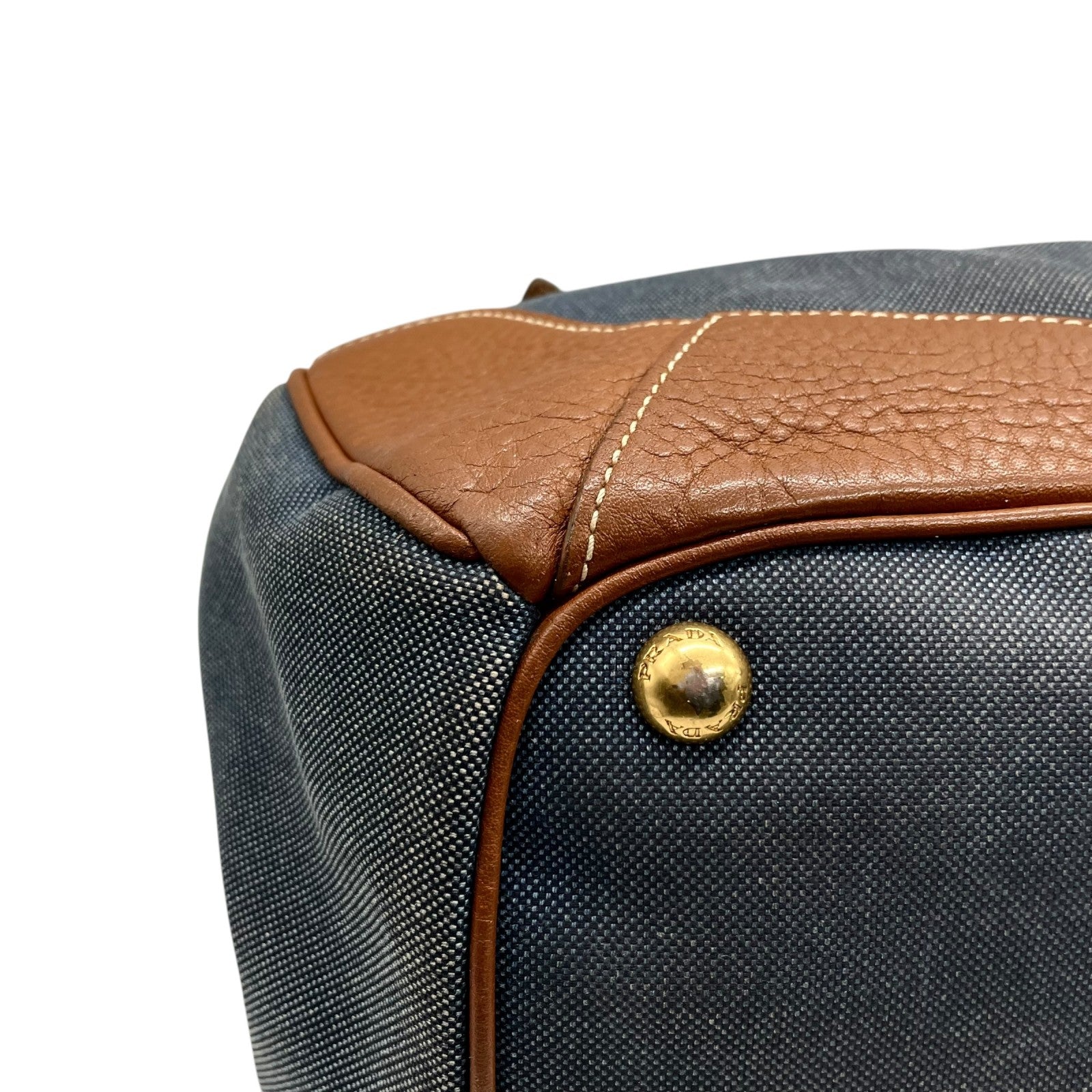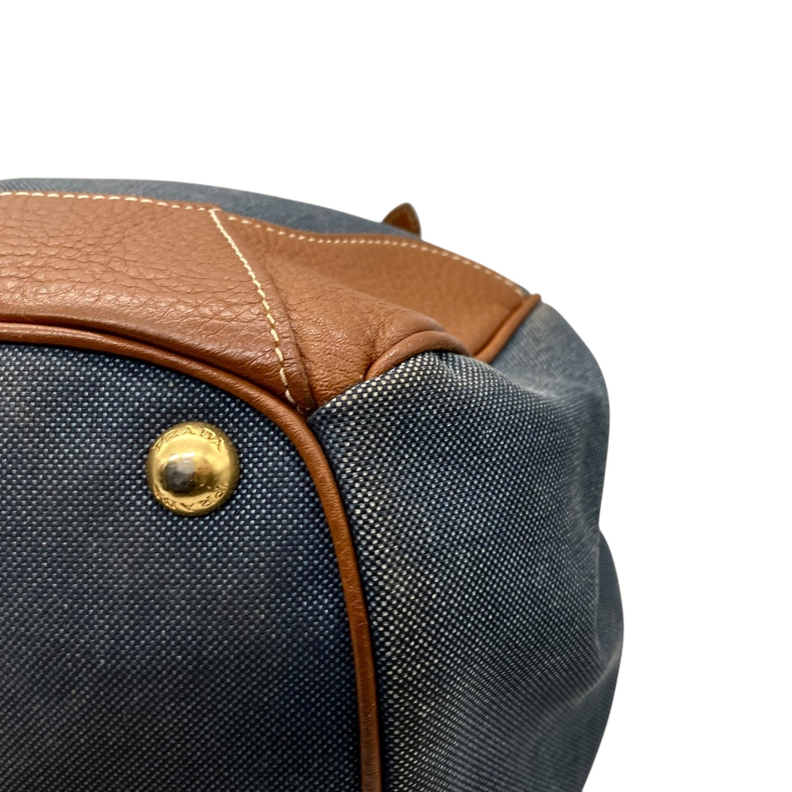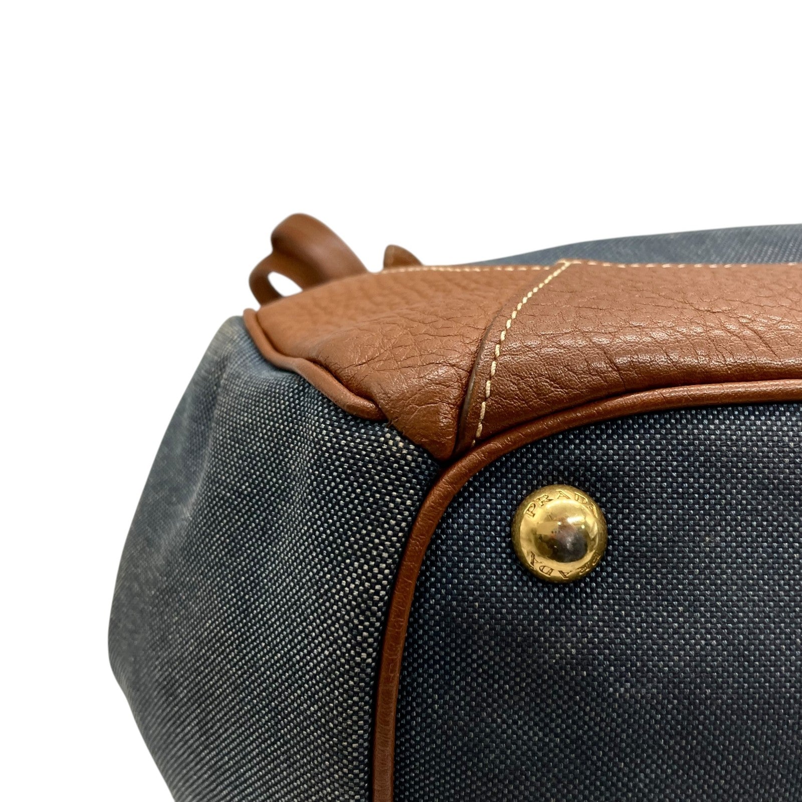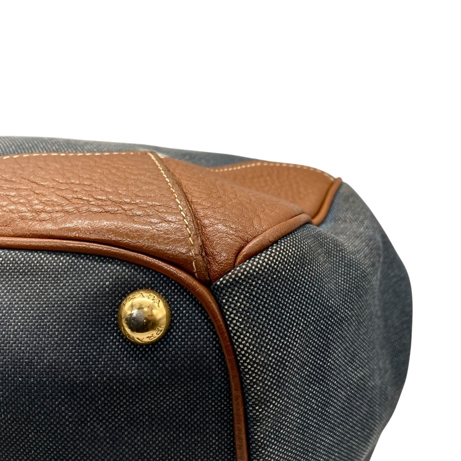 美品 PRADA プラダ ロゴ ジャガード トートバッグ ショルダー デニム レザー ブルー ブラウン ゴールド金具 D5