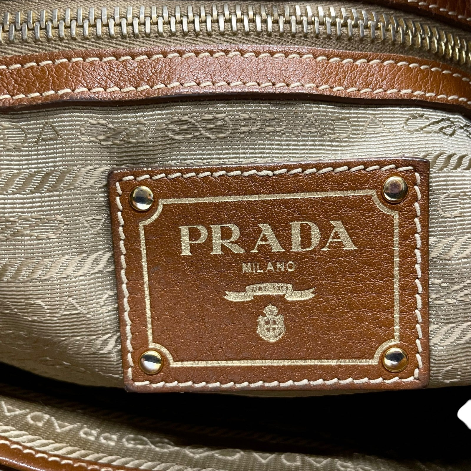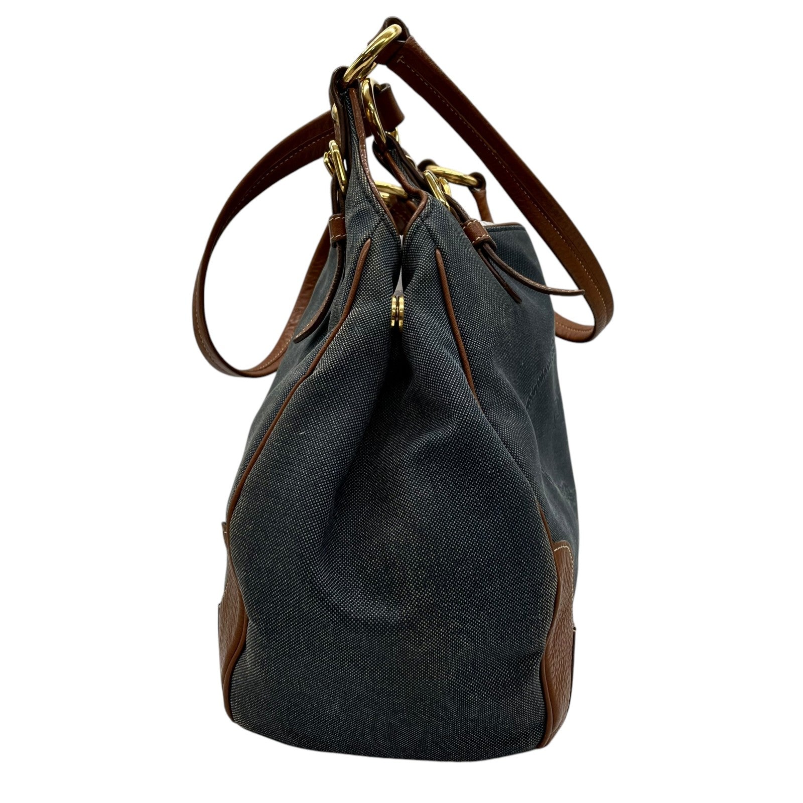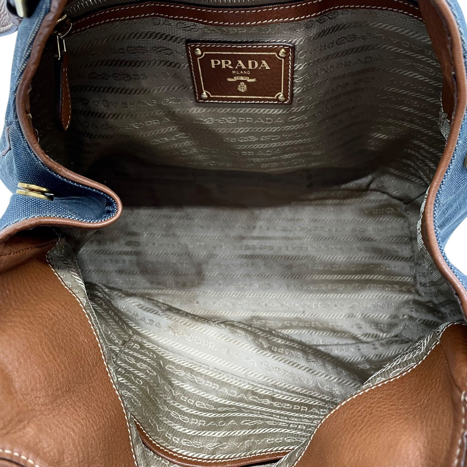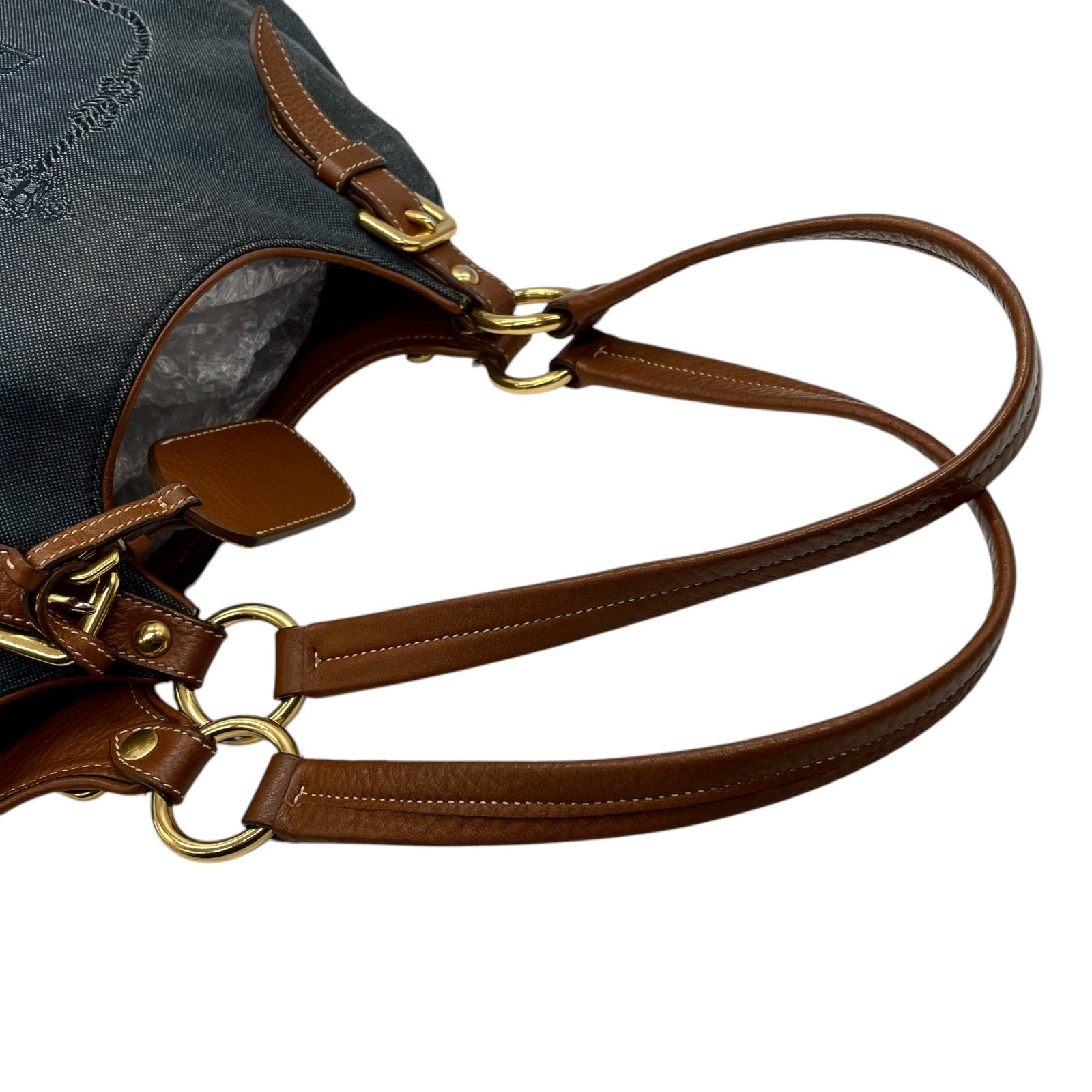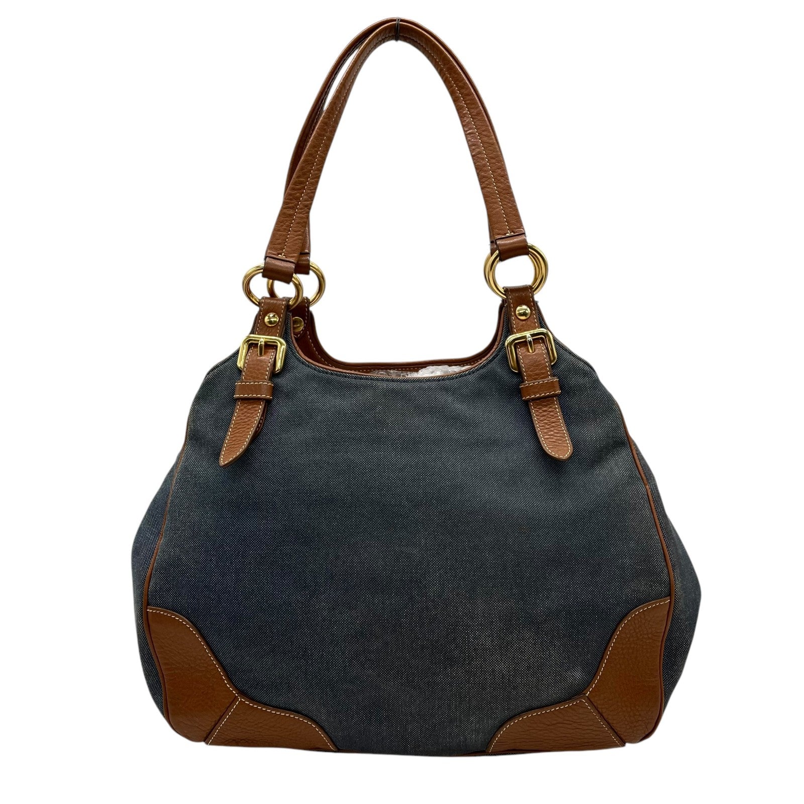 美品 PRADA プラダ ロゴ ジャガード トートバッグ ショルダー デニム レザー ブルー ブラウン ゴールド金具 D5