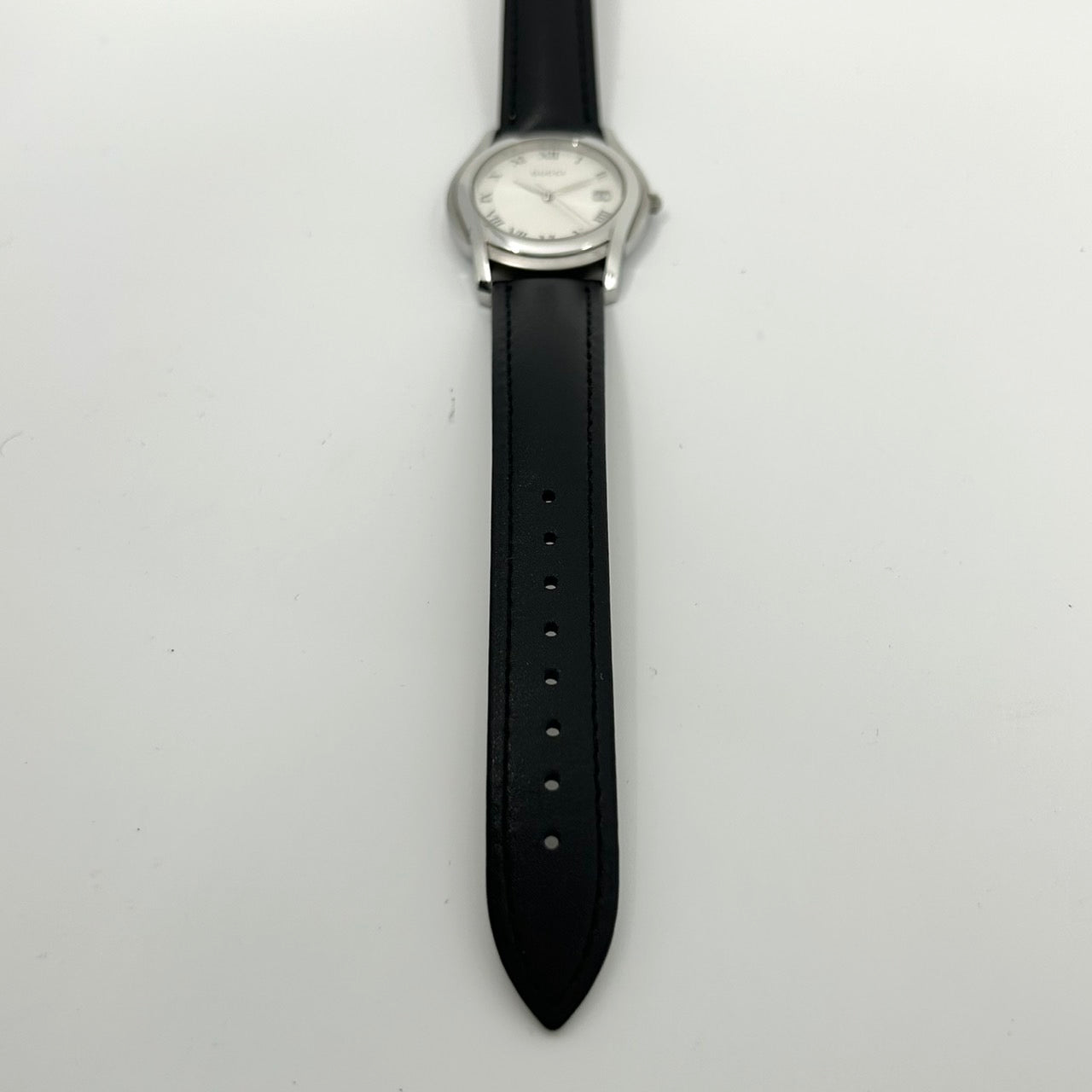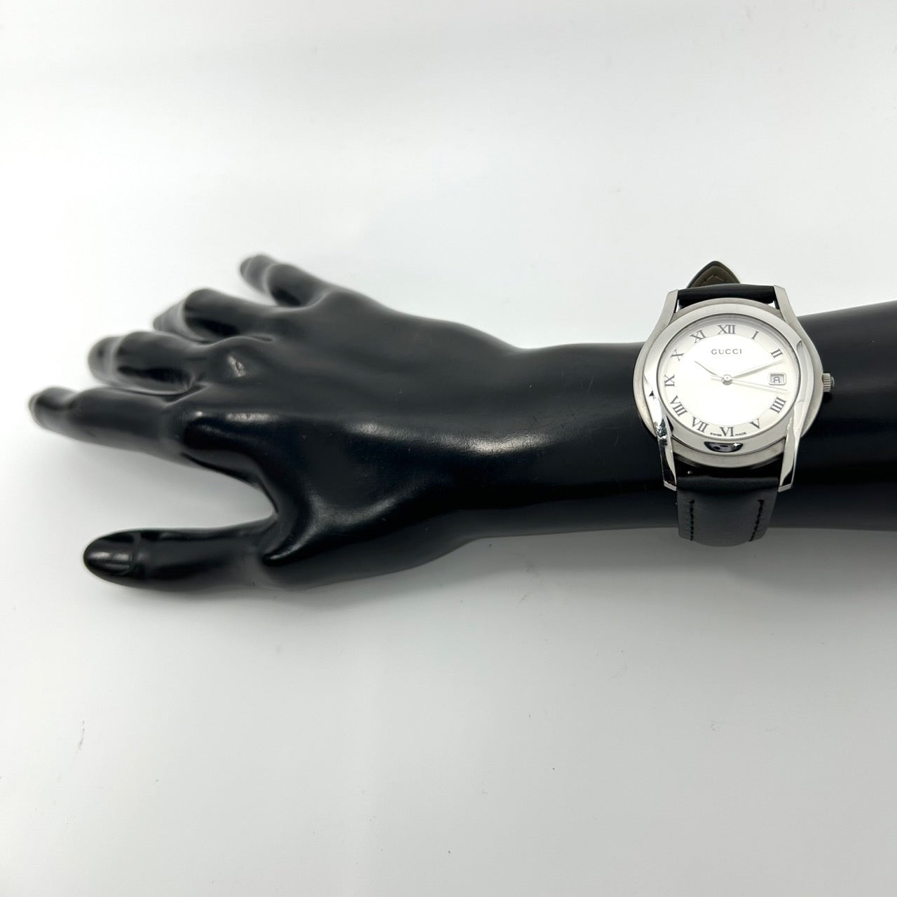 【稼働品】グッチ GUCCI 5500M 腕時計 メンズ アナログ クオーツ シルバー文字盤 ローマ数字 デイト表示 レザーベルト ブラック クラシック エレガント ドレスウォッチ ビジネスシーン 人気モデル クリーニング済み G1