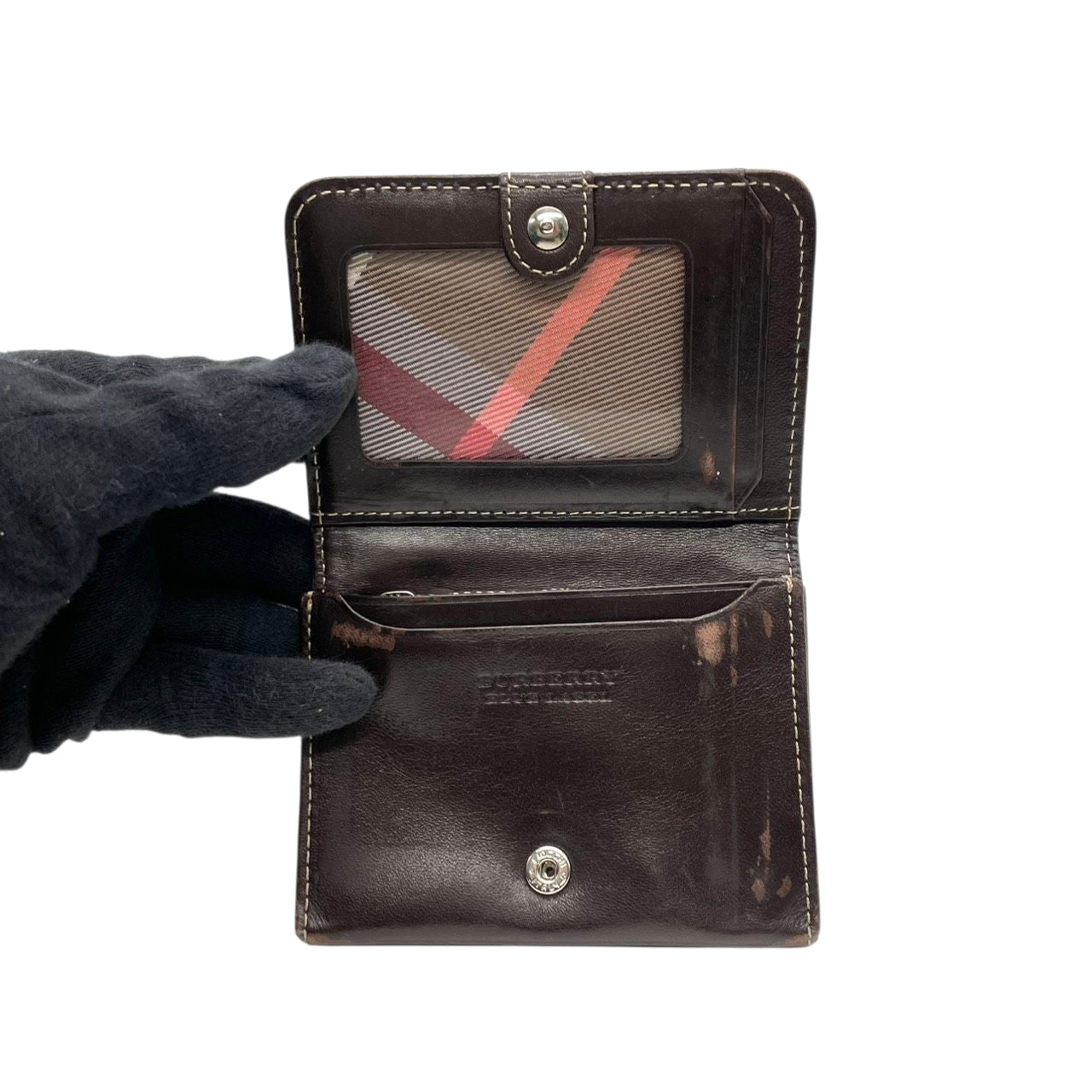 BURBERRY BLUE LABEL バーバリーブルーレーベル 三つ折り財布 コンパクトウォレット チェック柄 プレートロゴ シルバー金具 ナイロン レザー ブラウン マルチカラー レディース クラシック m2