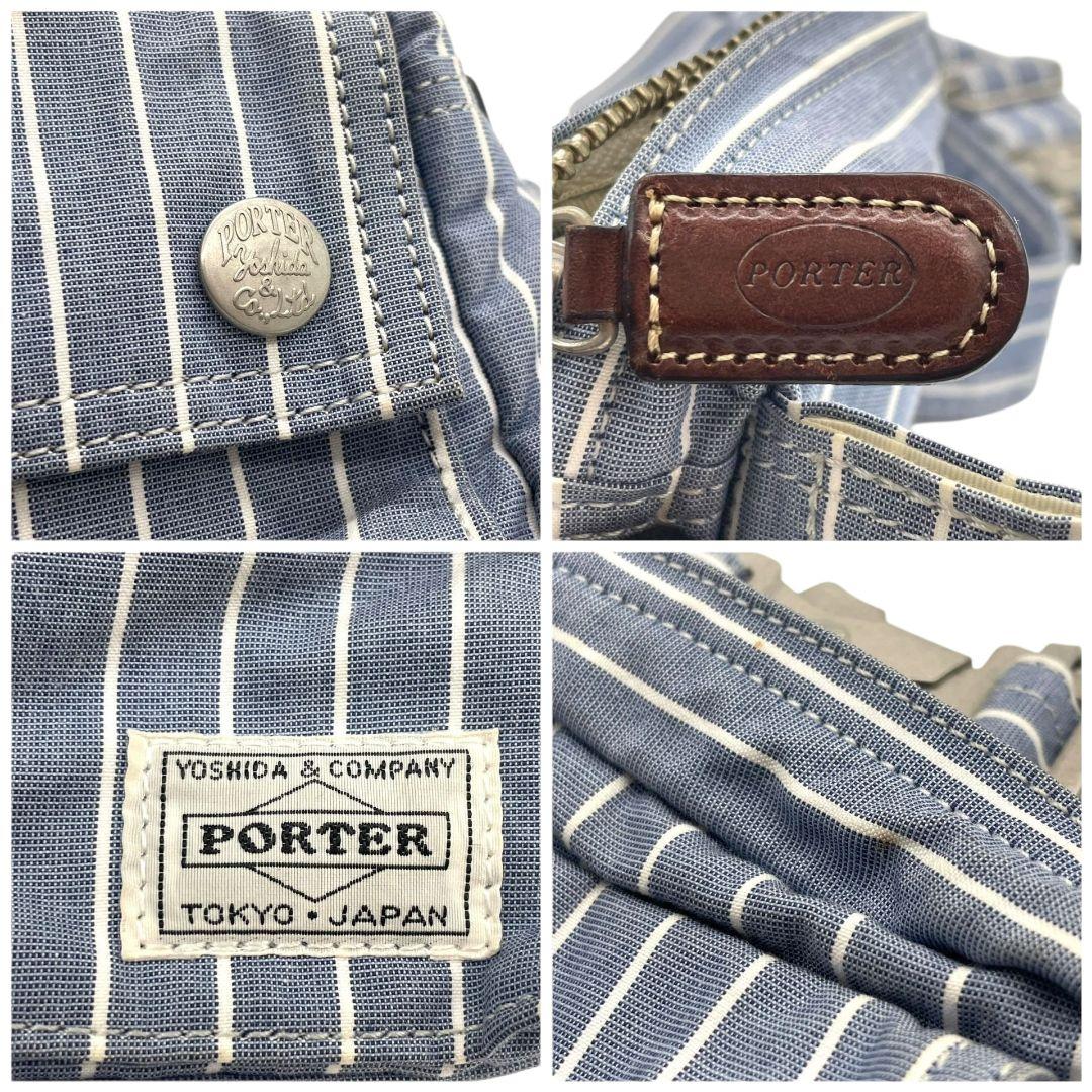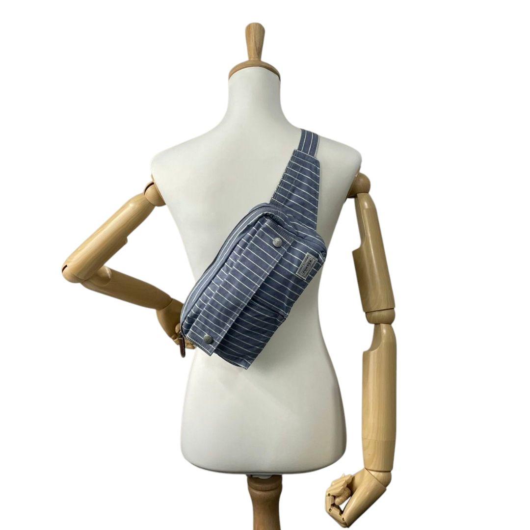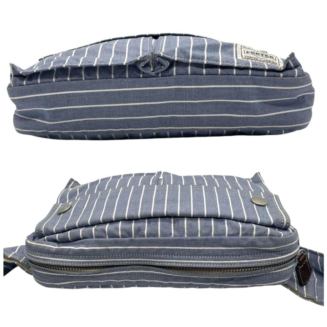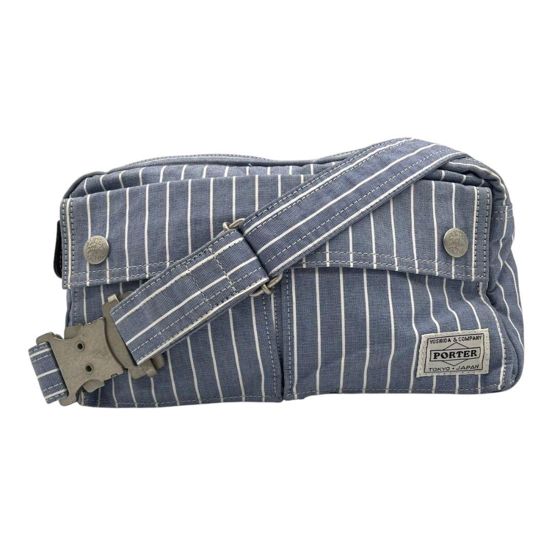 美品 ポーター ショルダーバッグ 水色 ブルー ヒッコリーストライプ ロゴ キャンバス 斜め掛け可 ウエストポーチ シルバー金具 PORTER オシャレ 本物保証 鑑定済 スピード発送