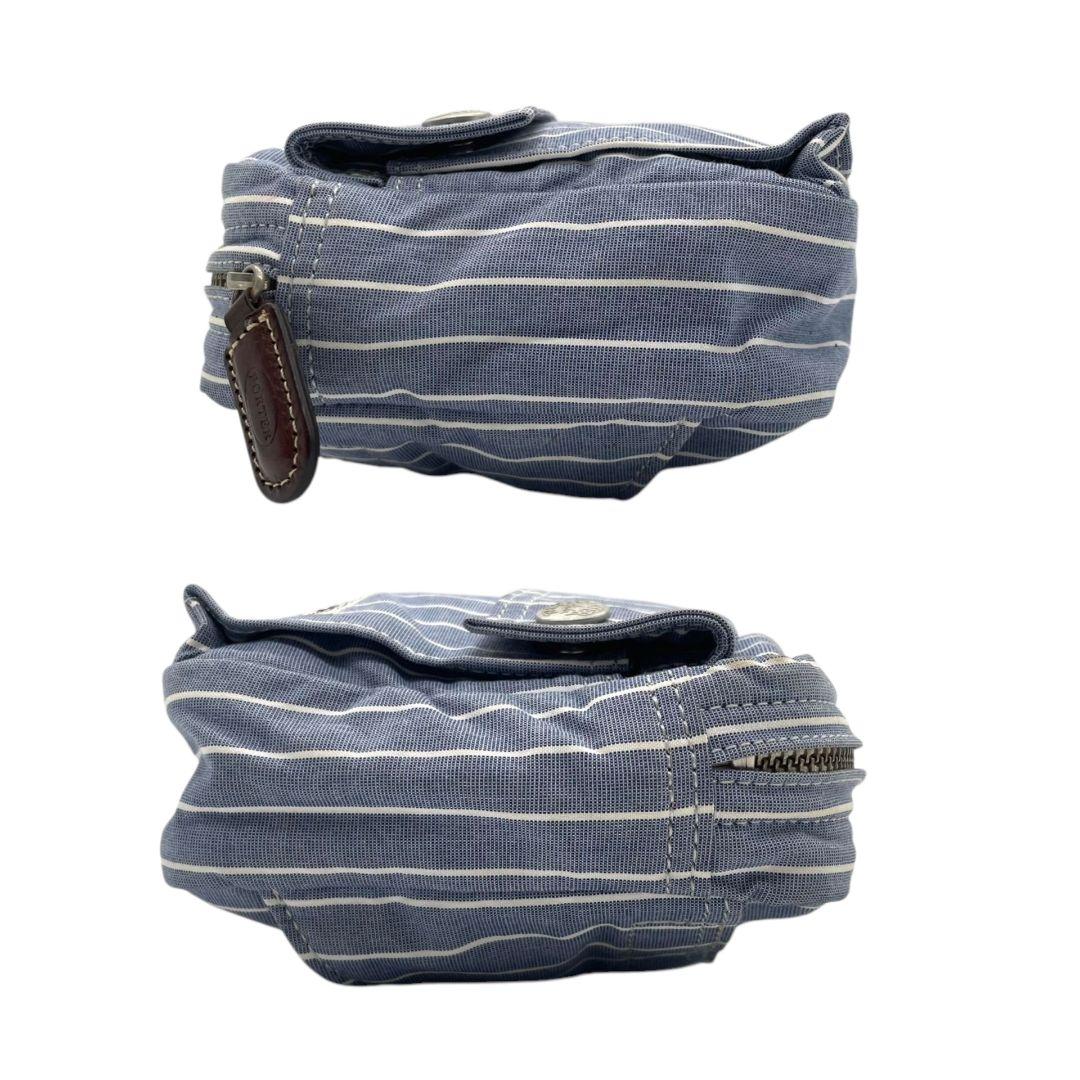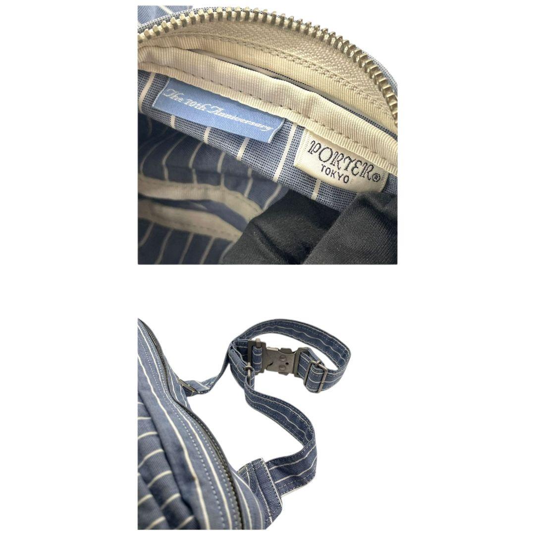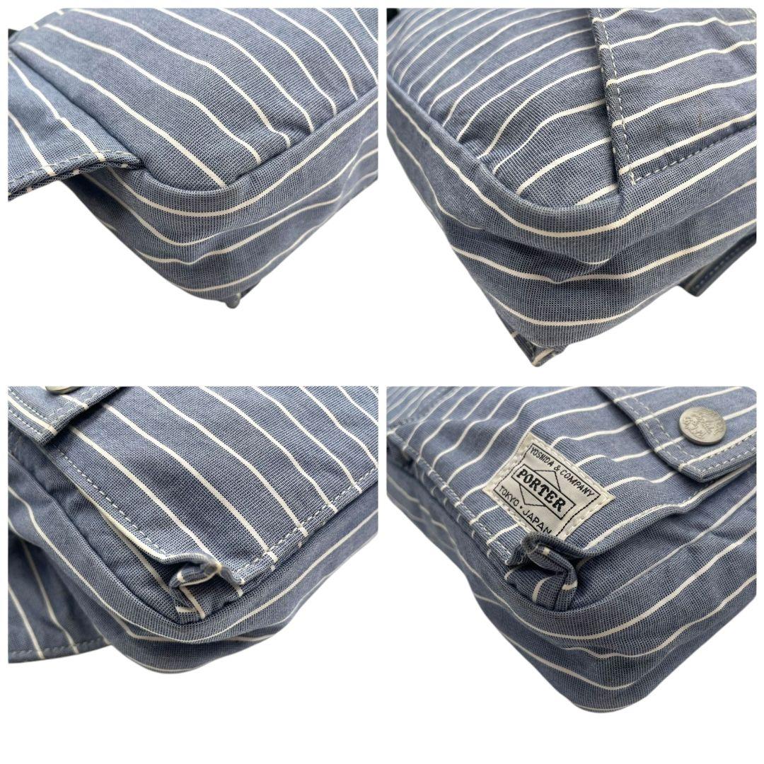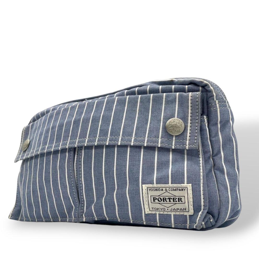 美品 ポーター ショルダーバッグ 水色 ブルー ヒッコリーストライプ ロゴ キャンバス 斜め掛け可 ウエストポーチ シルバー金具 PORTER オシャレ 本物保証 鑑定済 スピード発送