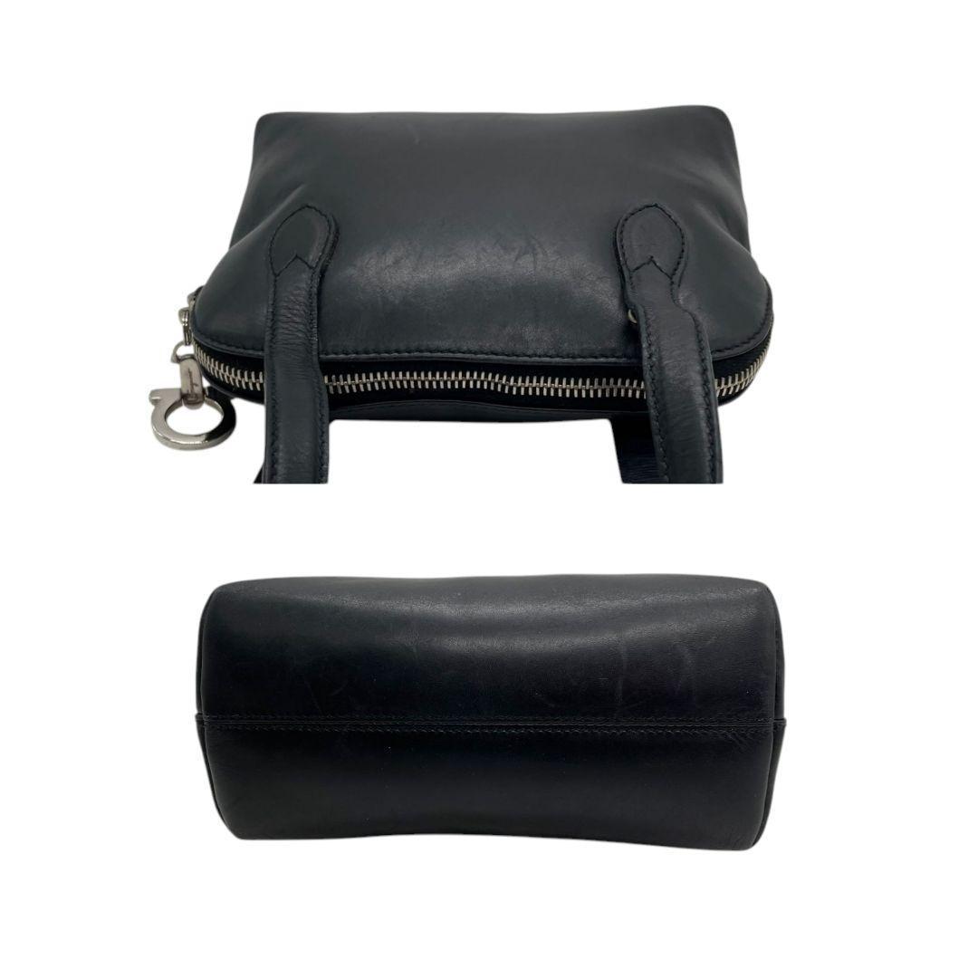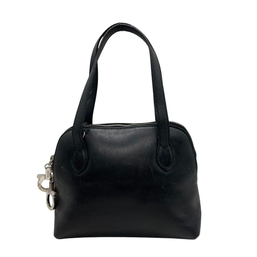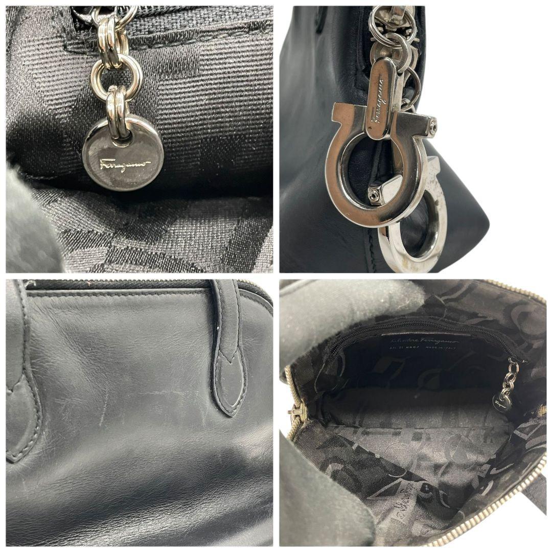 美品 フェラガモ ハンドバッグ 2way 黒 ガンチーニ チャーム付き レザー 本革 ショルダーバッグ 斜め掛け可 自立可 シルバー金具 Salvatore Ferragamo ブラック E6 6664