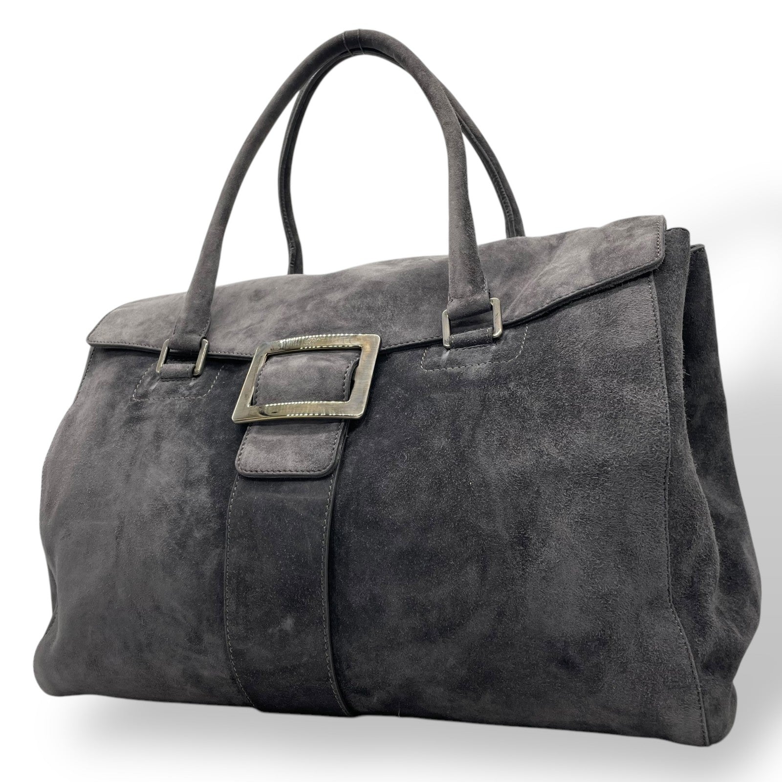 Authentic Roger Vivier Handbag Tote Grey Suede Black Hardware Spacious Women's