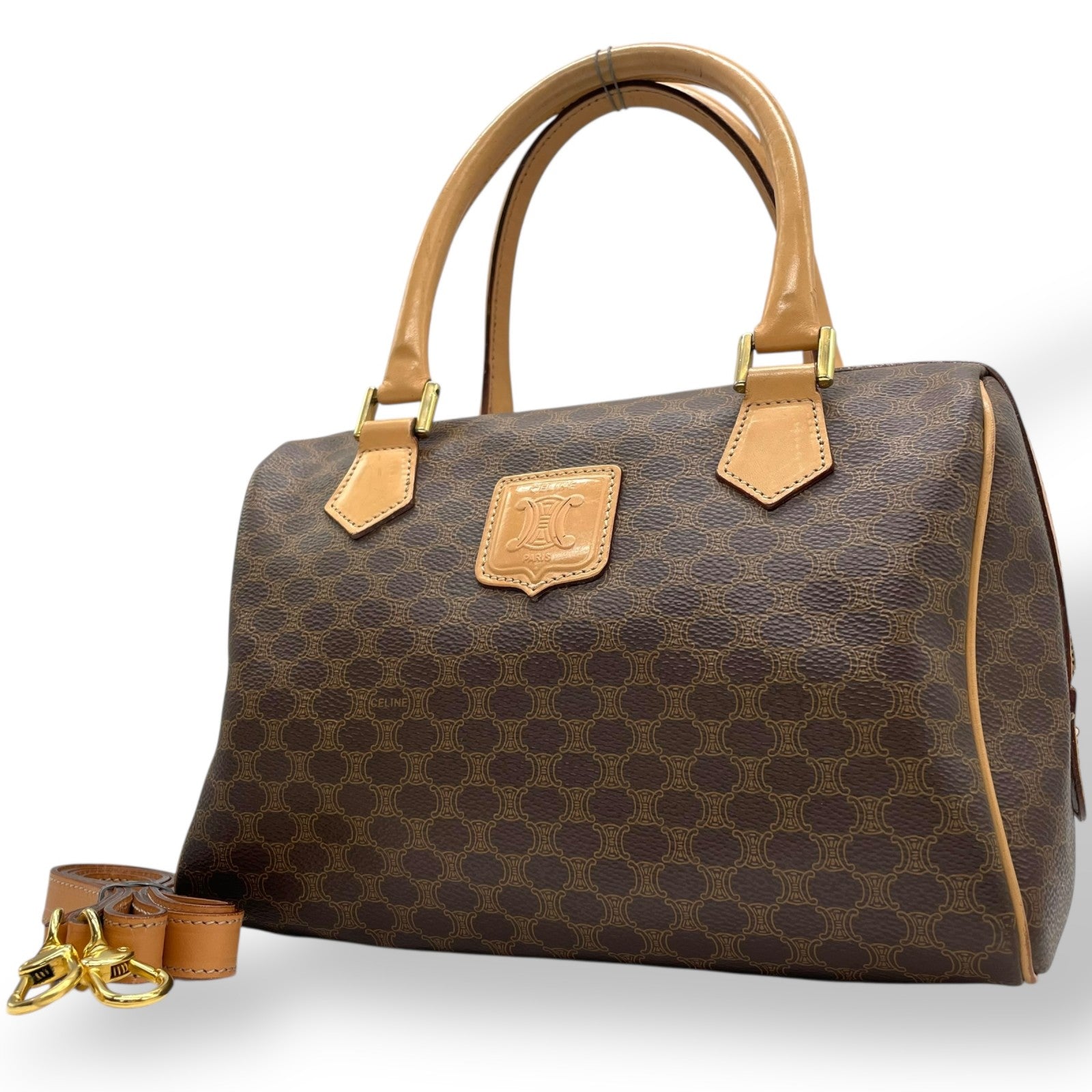 Authentic CELINE Trionf Monogram 2WAY Handbag Mini Boston Bag Shoulder Bag Leather Brown Gold Hardware Zipper Crossbody Women's