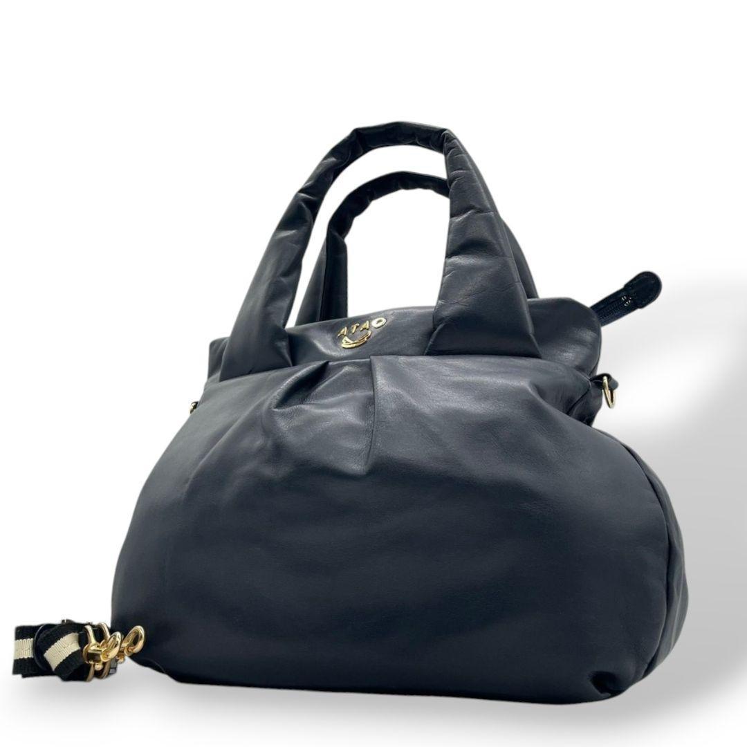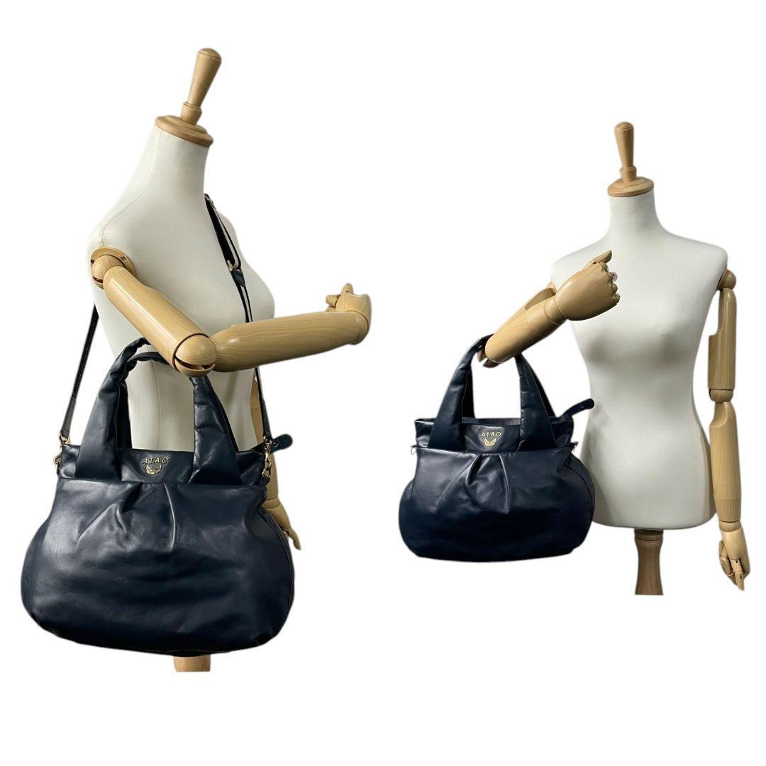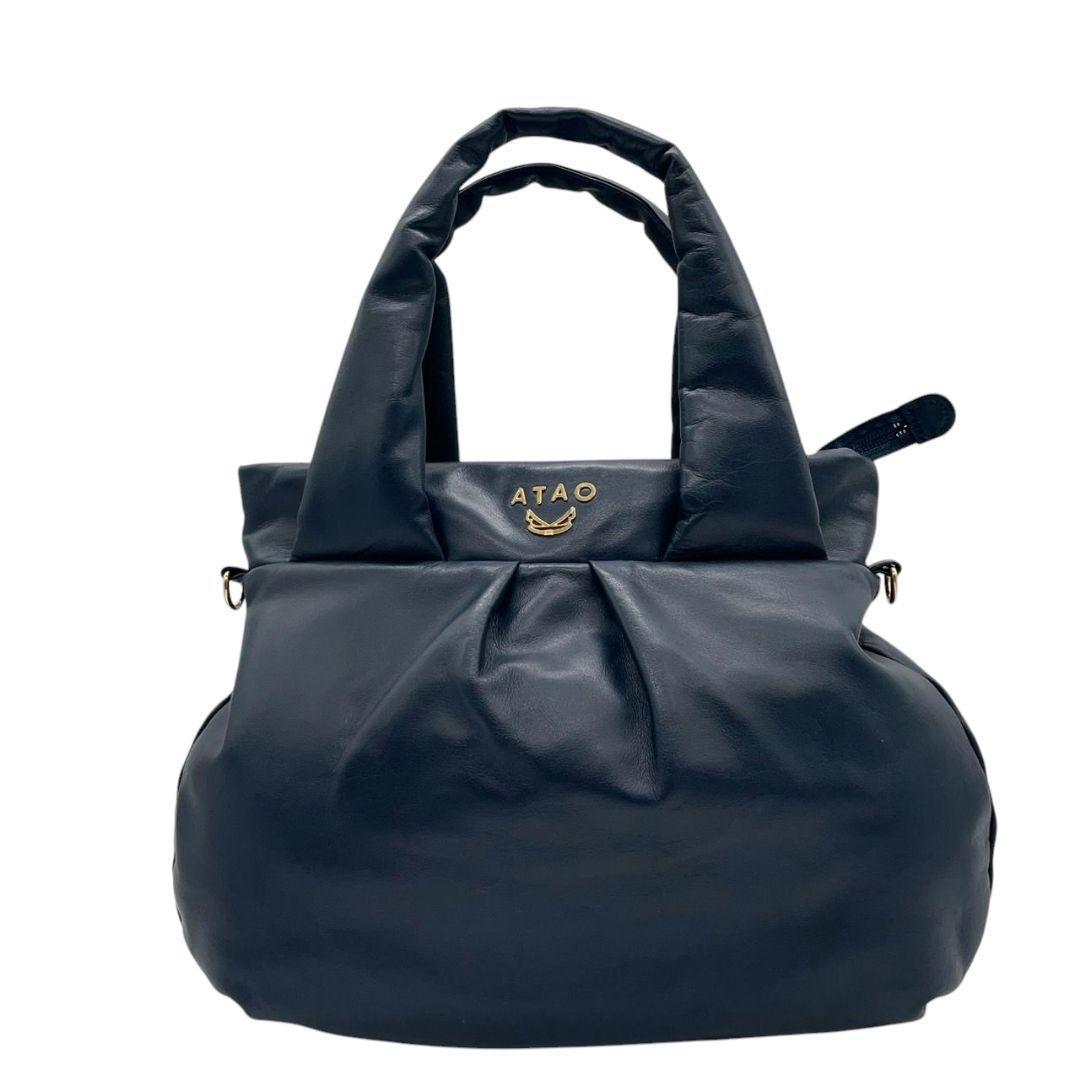アタオ ハンドバッグ 2way 紺 エミュ レザー ギャザー A4収納 斜め掛け可 ゴールド金具 ロゴプレート 自立可 ATAO ショルダーバッグ トートバッグ