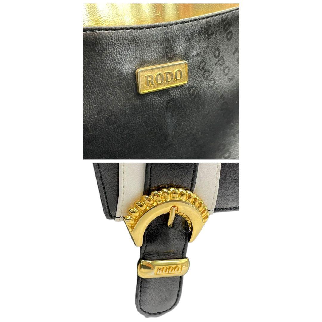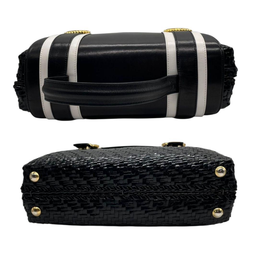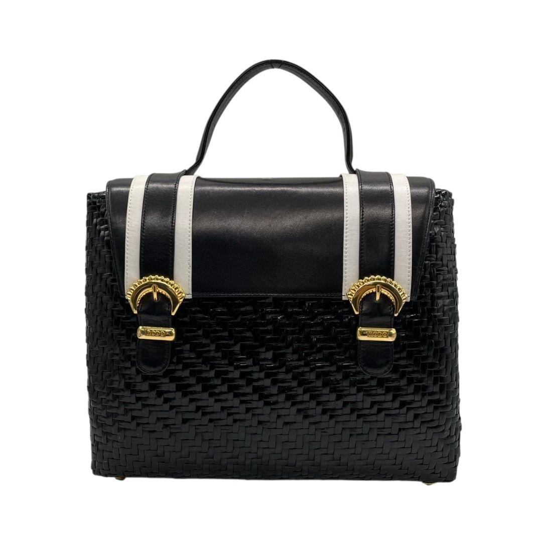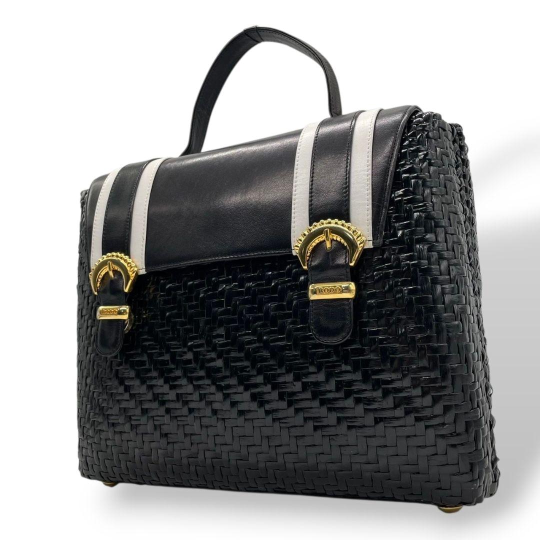 ロド ハンドバッグ 黒 白 編み込み カゴバッグ バイカラー トートバッグ レザー 本革 自立可 ゴールド金具 ロゴプレート RODO