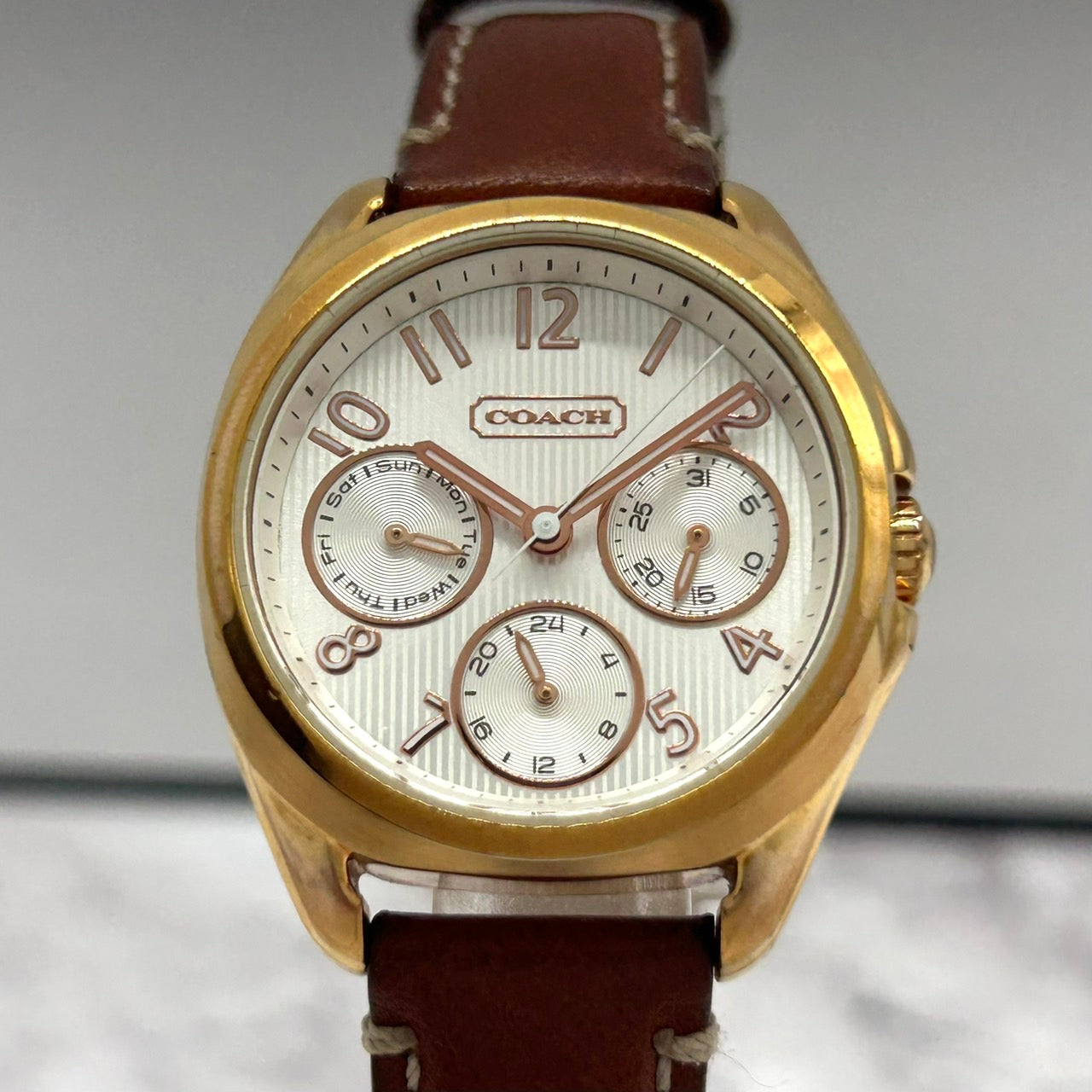 Authentic COACH Chronograph Gold Ladies Watch White Dial Brown Leather Strap