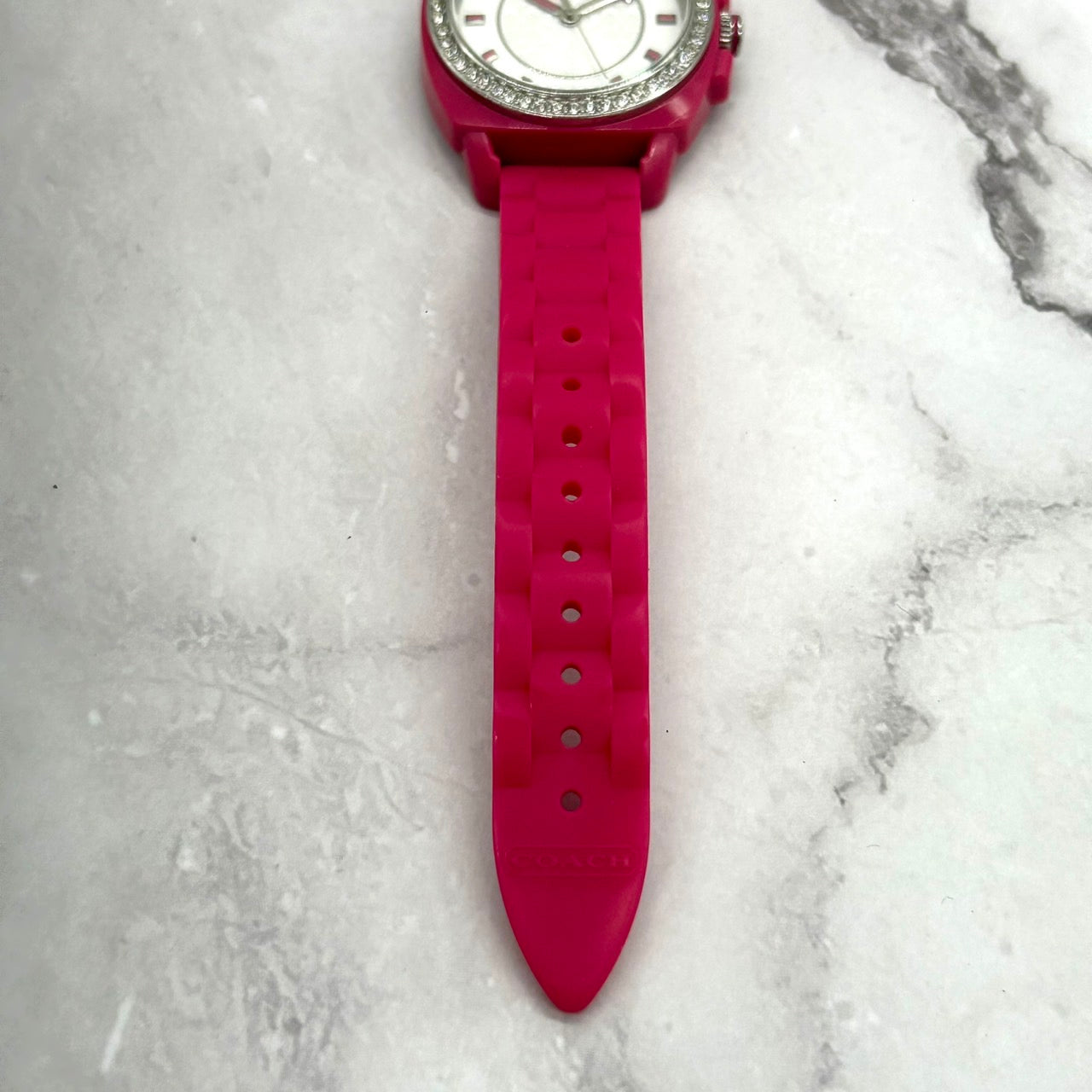 COACH Women's Watch CA.93.7.29.0627S, Stone Bezel, Signature Pink, White Dial, Quartz, Analog, Rubber Strap, Fashion Watch, Pop, Casual, Cute, 3 ATM Water Resistance, Cleaned, i10