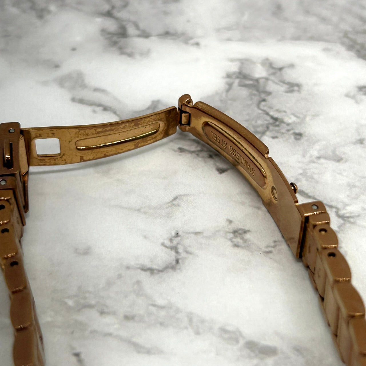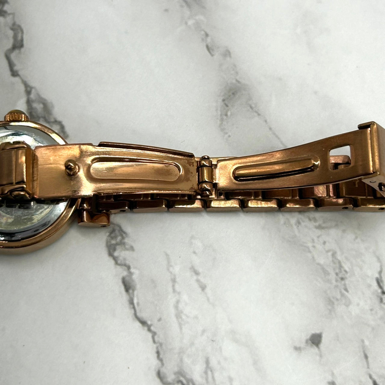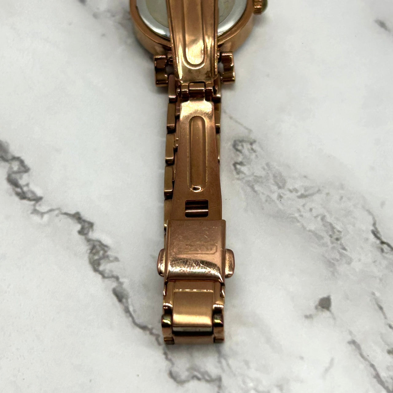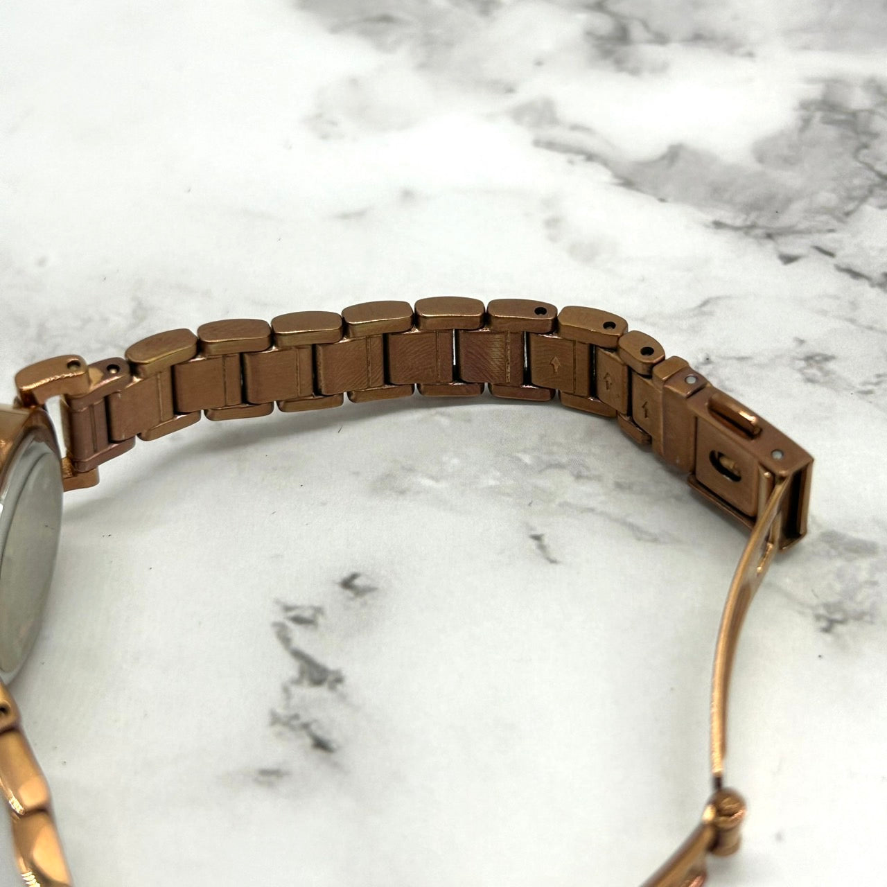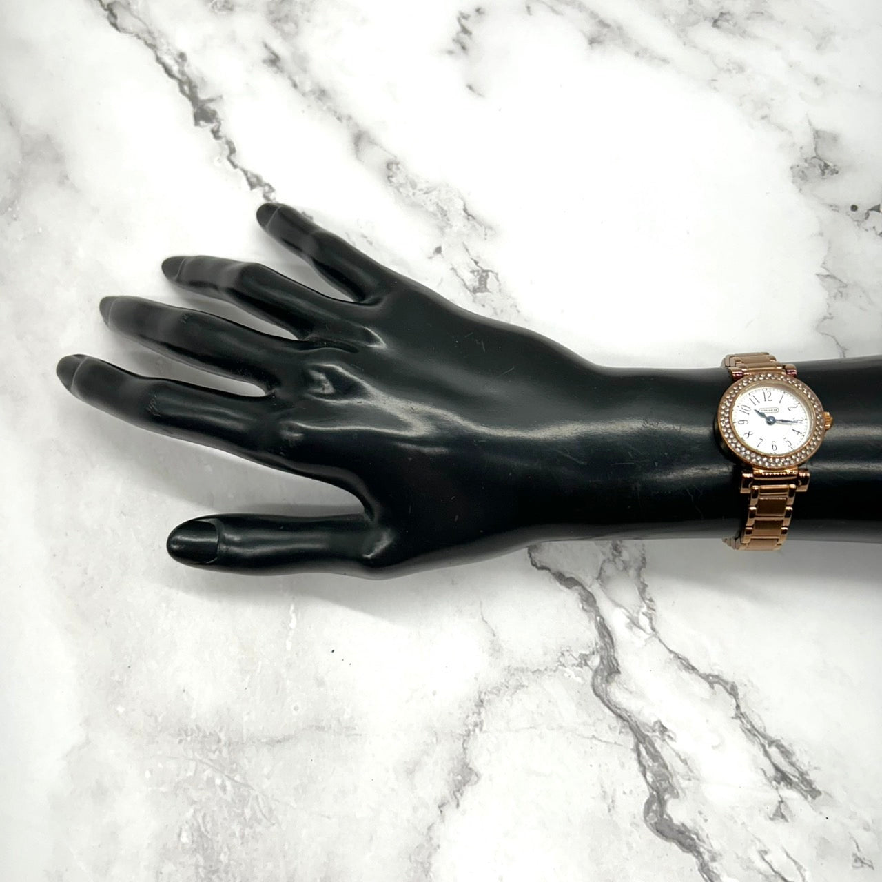 | Production features | [Working item] This product is a COACH ladies' watch. It features a very elegant and gorgeous design with rhinestones lavishly studded on the bezel. Feature Brand: COACH Model number: CA.72.7.34.0816S Movement: Quartz Case Shape: Round Case color: Pink gold Dial Color: Silver Material: Stainless steel Specifications: Rhinestone bezel / Analog display / 3ATM water resistant Condition: Working / Cleaned The pink gold coloring adds a touch of glamour to your hand, making this a piece that can be worn like an accessory. It is perfect for dressy styles and parties, as well as adding a touch of glamour to everyday outfits. It has been cleaned and is ready to use immediately. Recommended for those looking for a sophisticated and luxurious watch that is unique to COACH. |