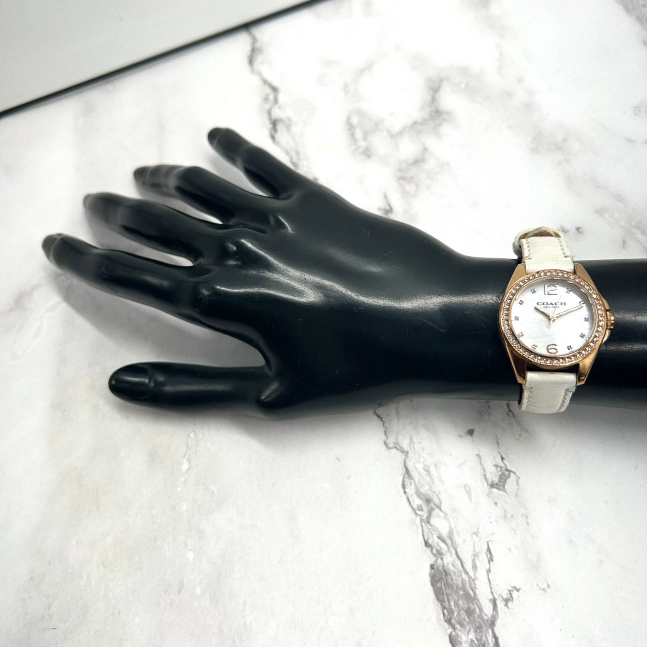 [Working/With Box] COACH Women's Watch CA.67.34.0904S with Rhinestone Bezel, Shell Dial, Gold, and White Leather Strap. Elegant Dress Watch with Luxury Analog Quartz Movement. Cleaned.