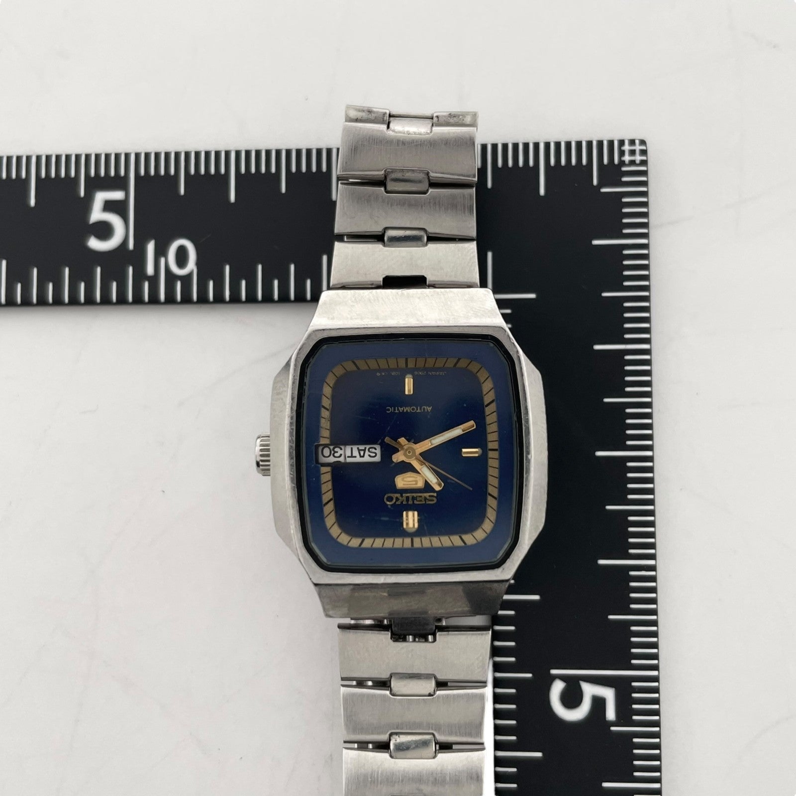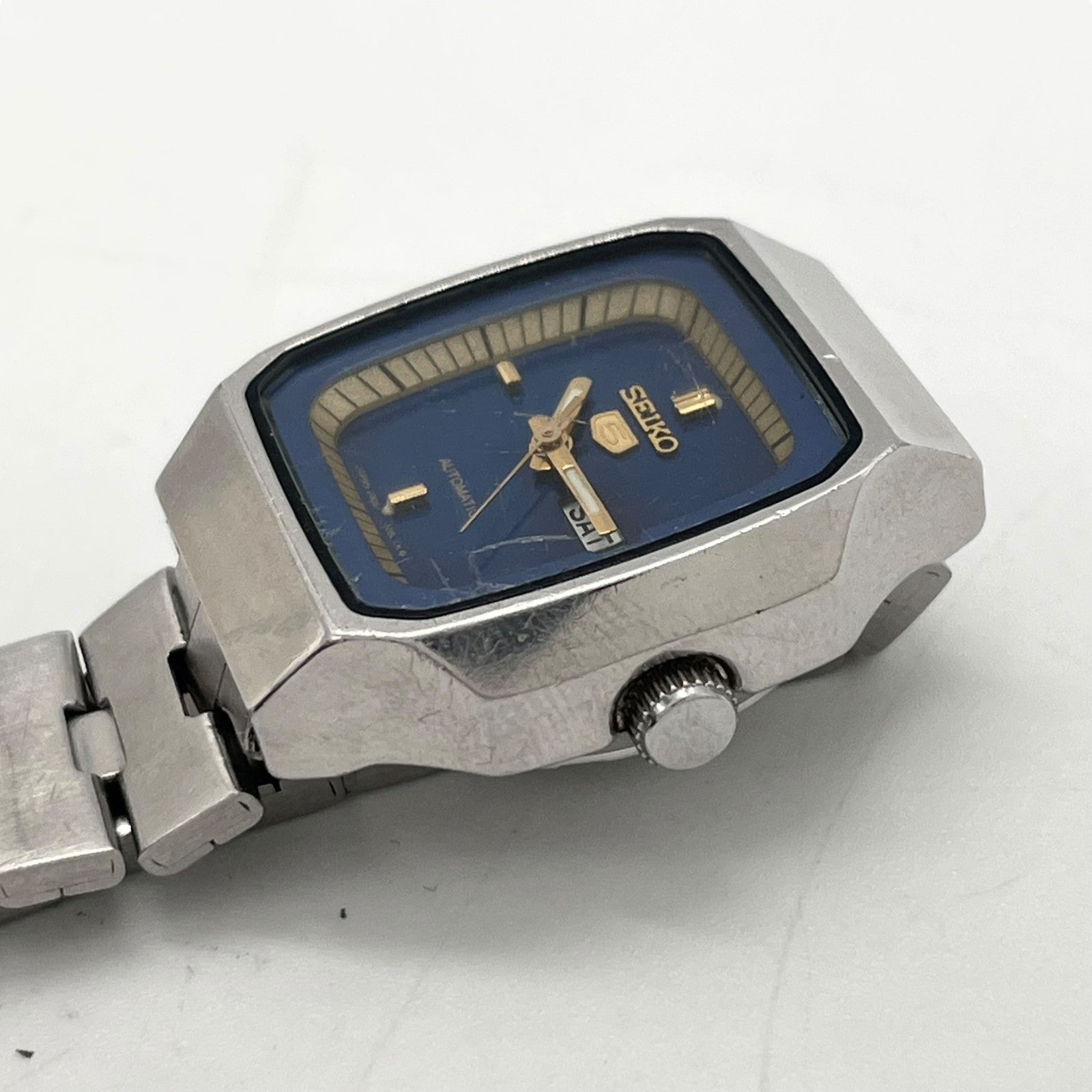 【稼働品】seiko セイコー 腕時計 2906-5250 レディース 自動巻き オートマチック ヴィンテージ アンティーク 青文字盤 デイデイト アナログ スクエア クラシック エレガント ドレスウォッチ ステンレス クリーニング済 G