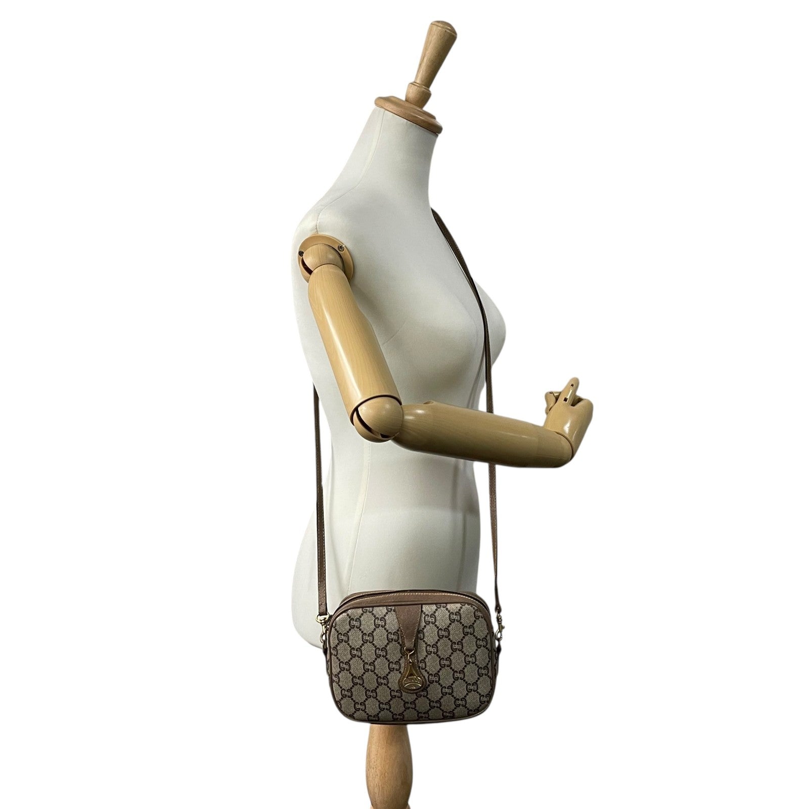 美品 GUCCI オールドグッチ GGプラス ショルダーバッグ PVC レザー グレー ブラウン ゴールド金具 ロゴ 斜め掛け可 カメラバッグ GGスプリーム ヴィンテージ レディース C3