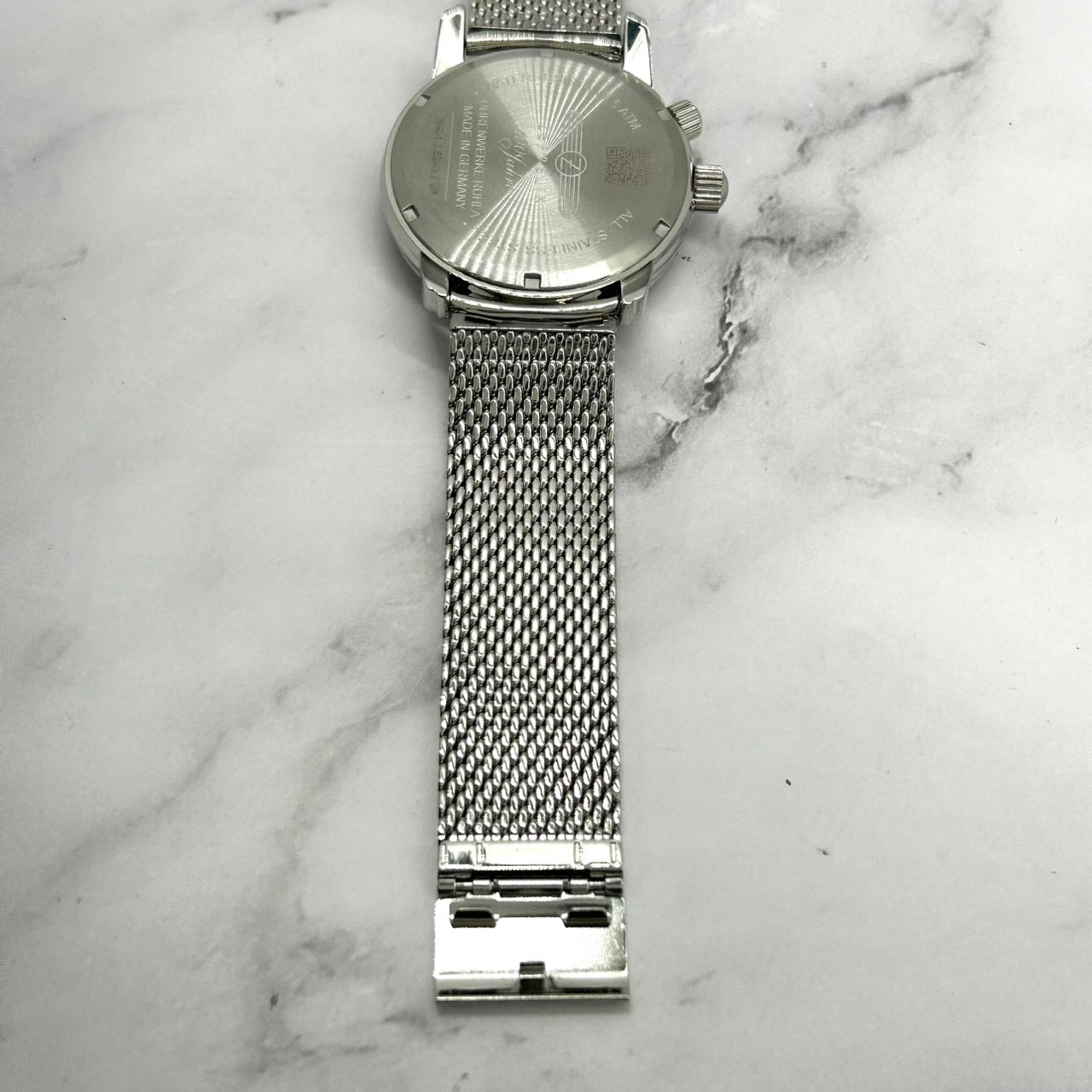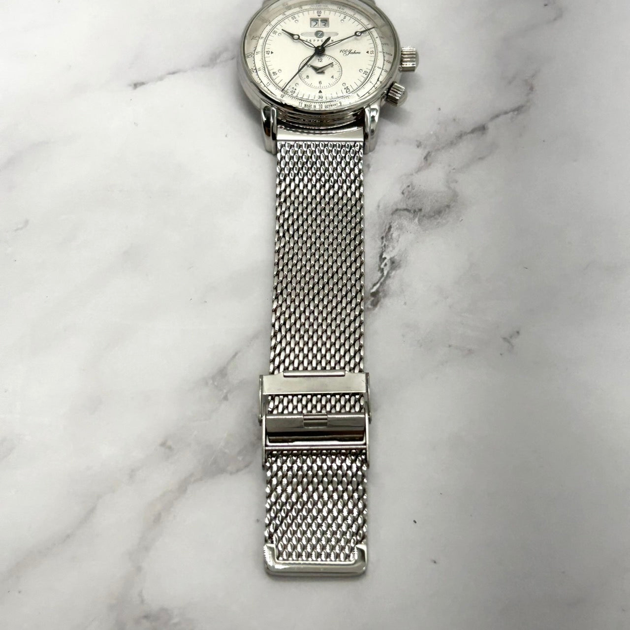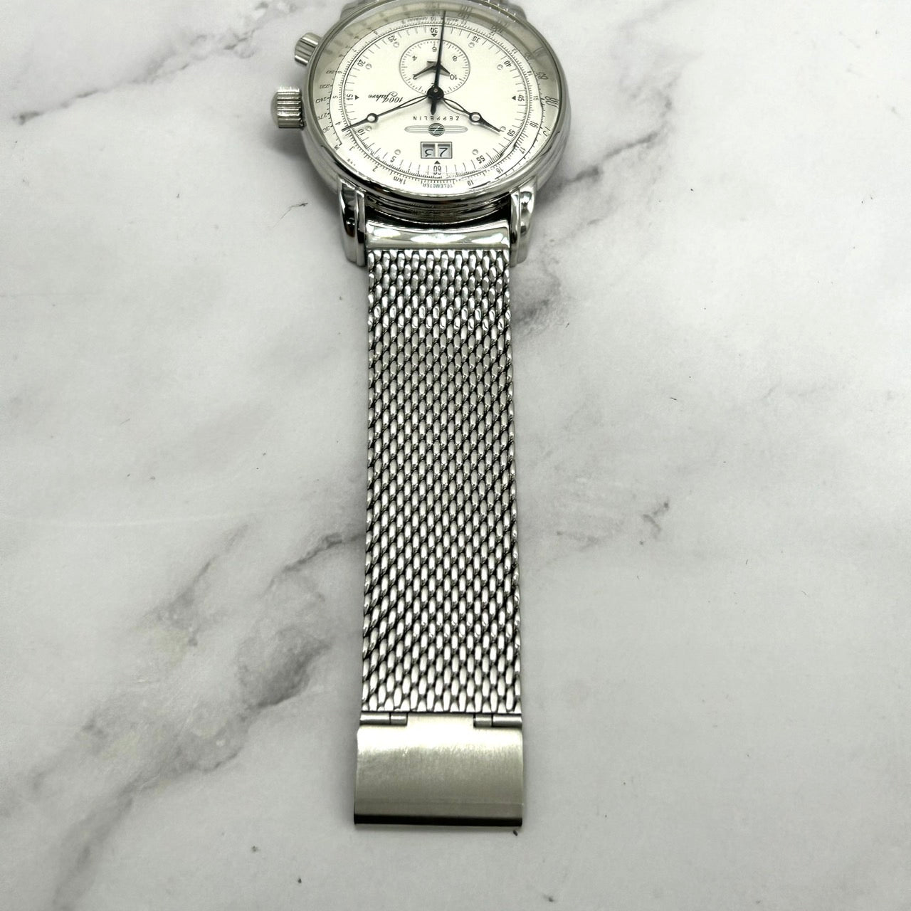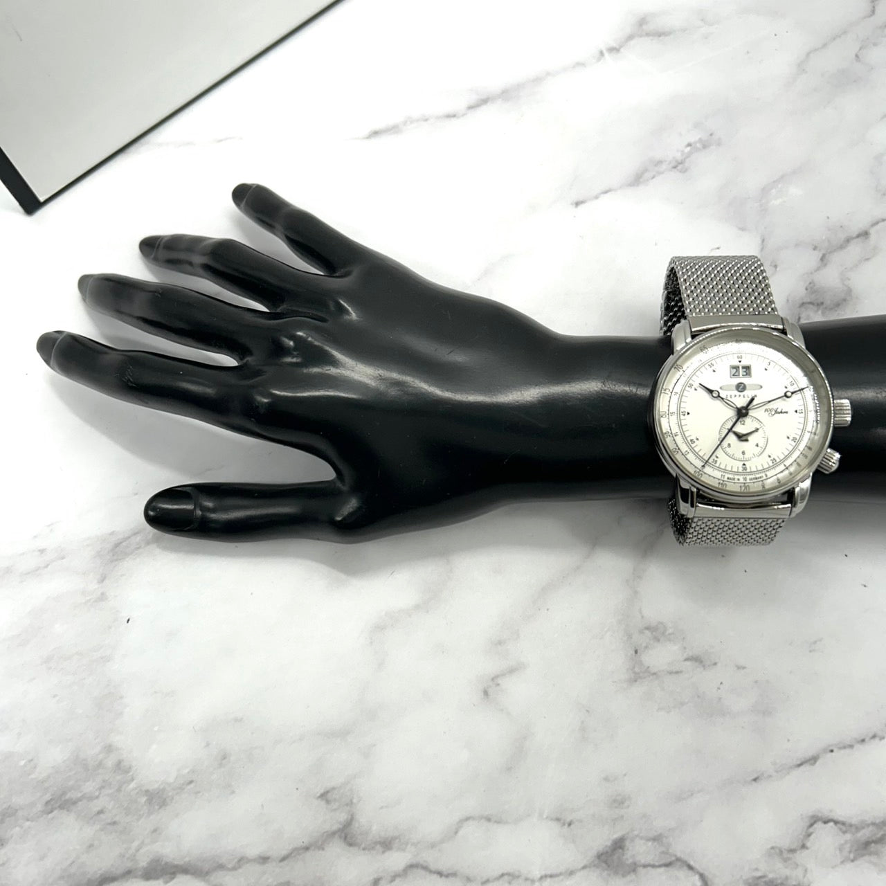 [Working/Like New] ZEPPELIN 100th Anniversary Model Watch 7640-1 Men's Chronograph with Big Date, Alarm, Silver Mesh Strap, Tachymeter, and Telemeter. Classic Pilot's Watch. Cleaned and in Excellent Condition. Fashion Watch i9