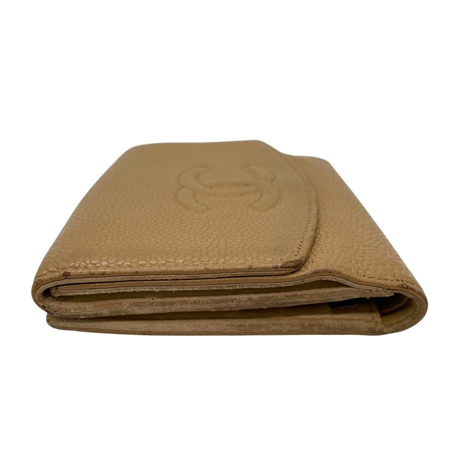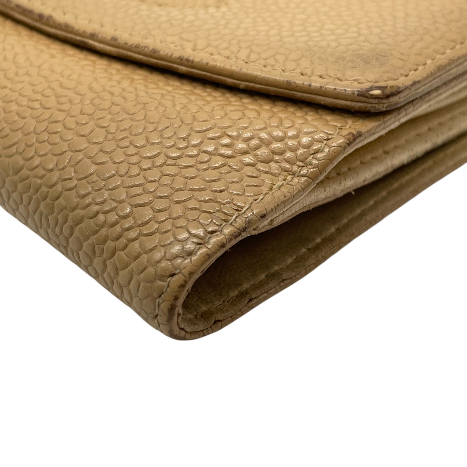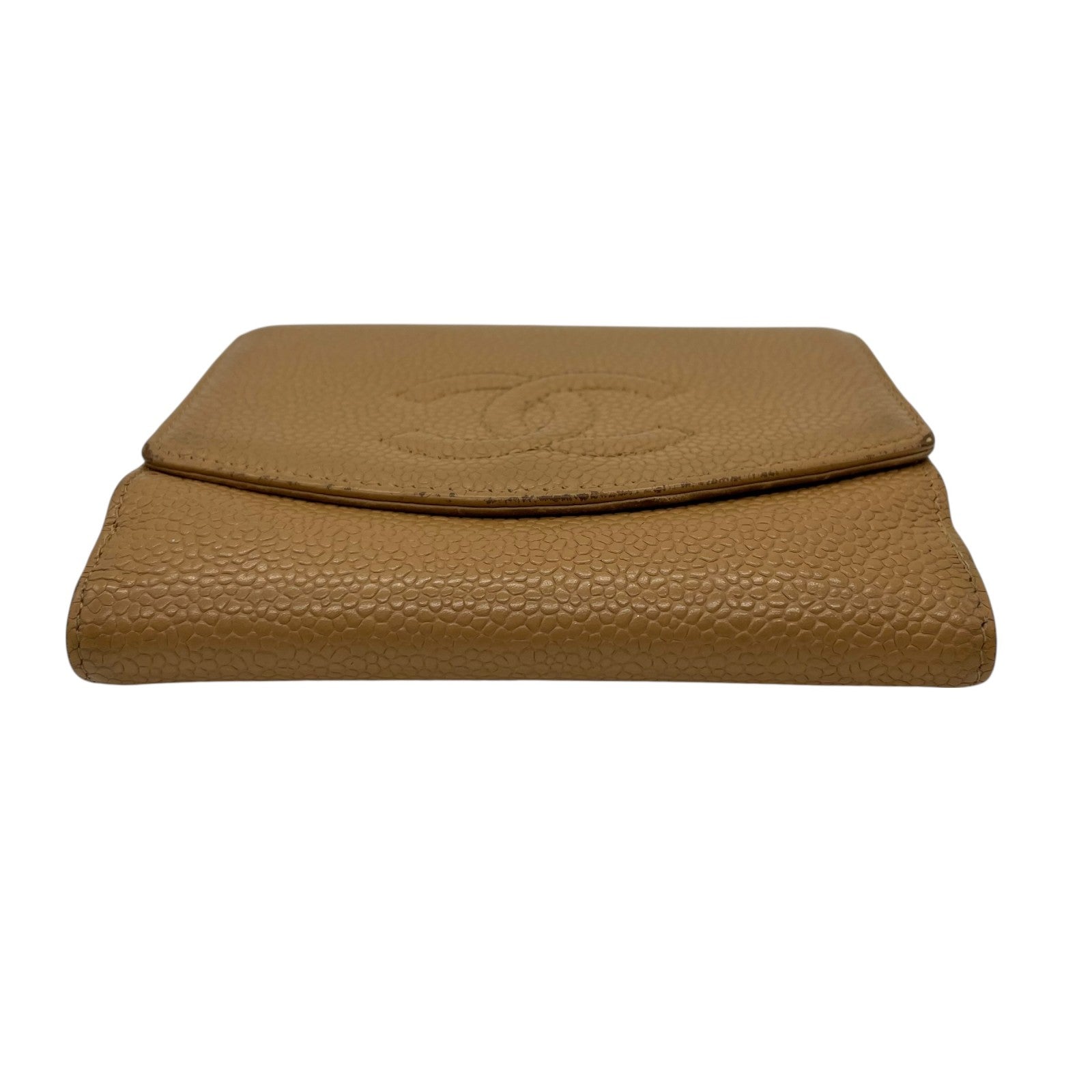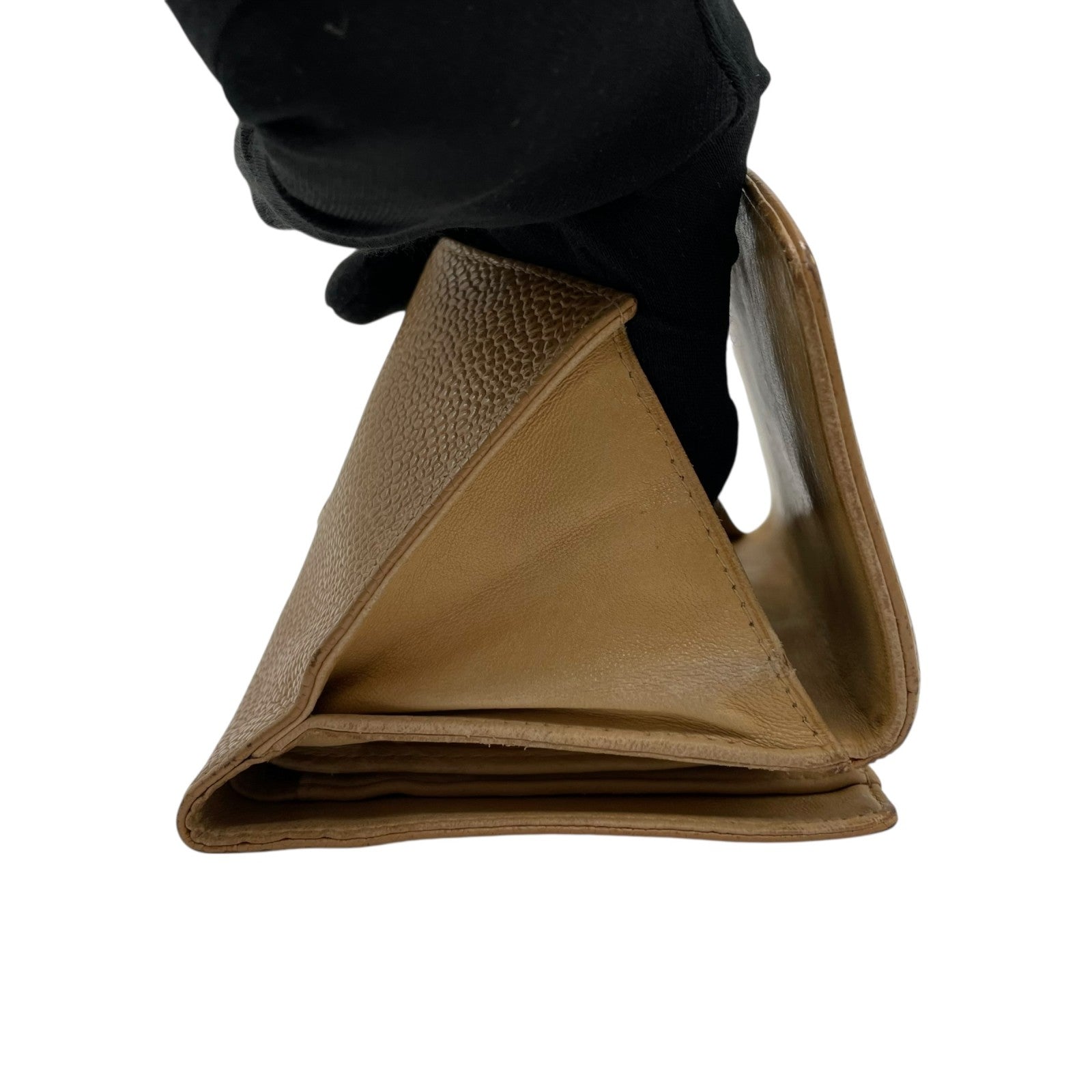 シャネル CHANEL 三つ折り財布 キャビアスキン調 レザー ココマーク 型押し キャメル ゴールド金具 金金具 箱・カード付 シール付 W2