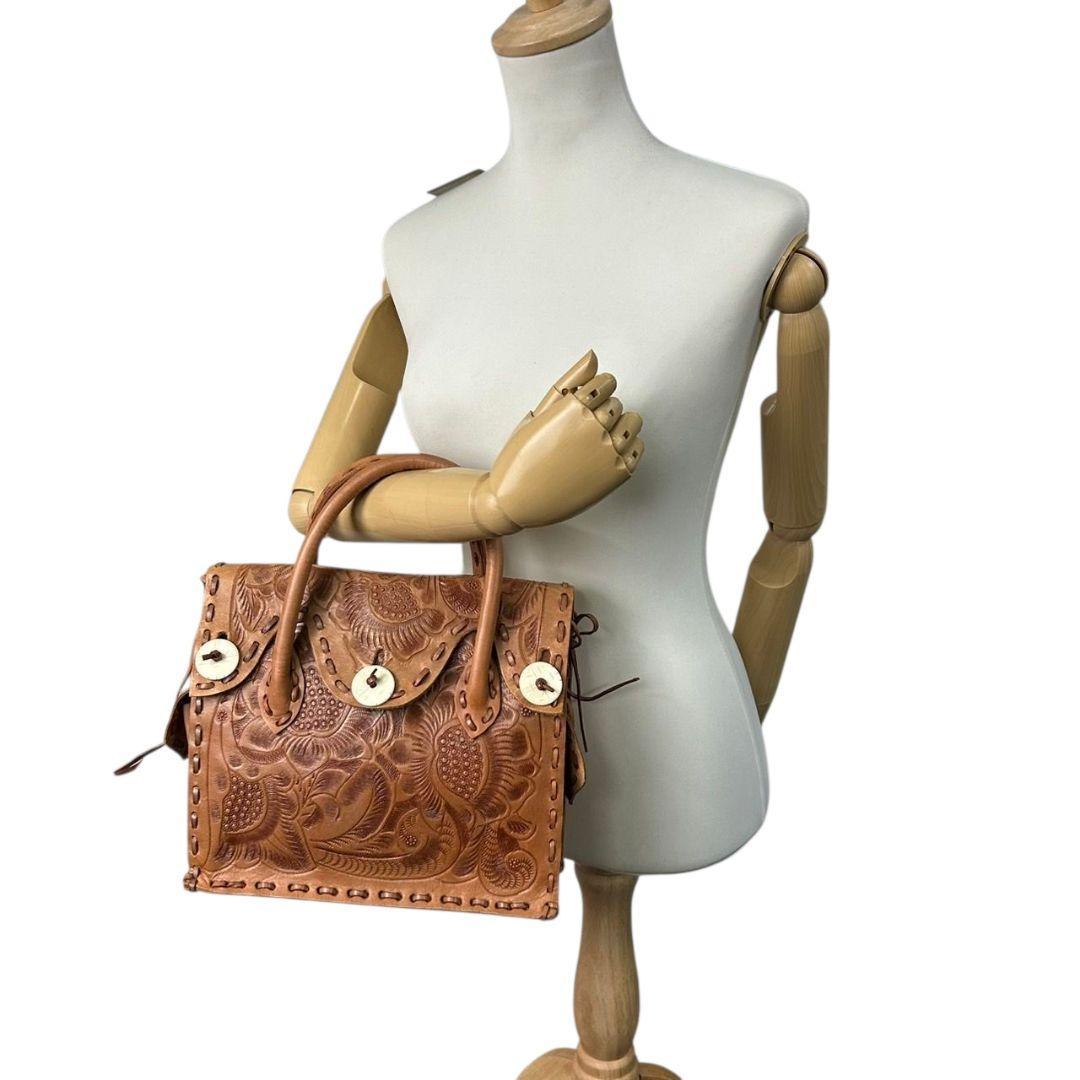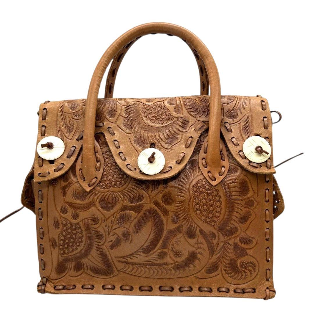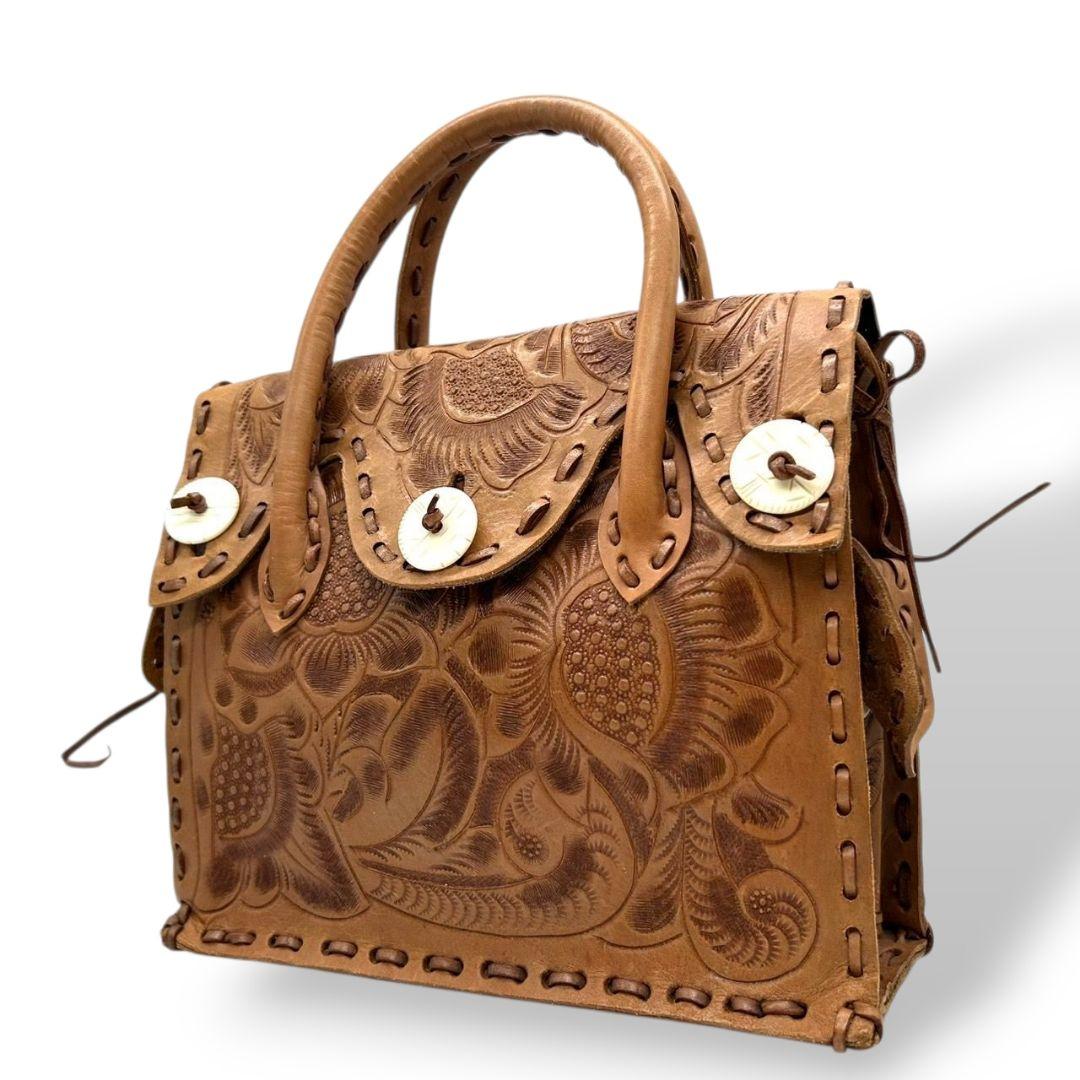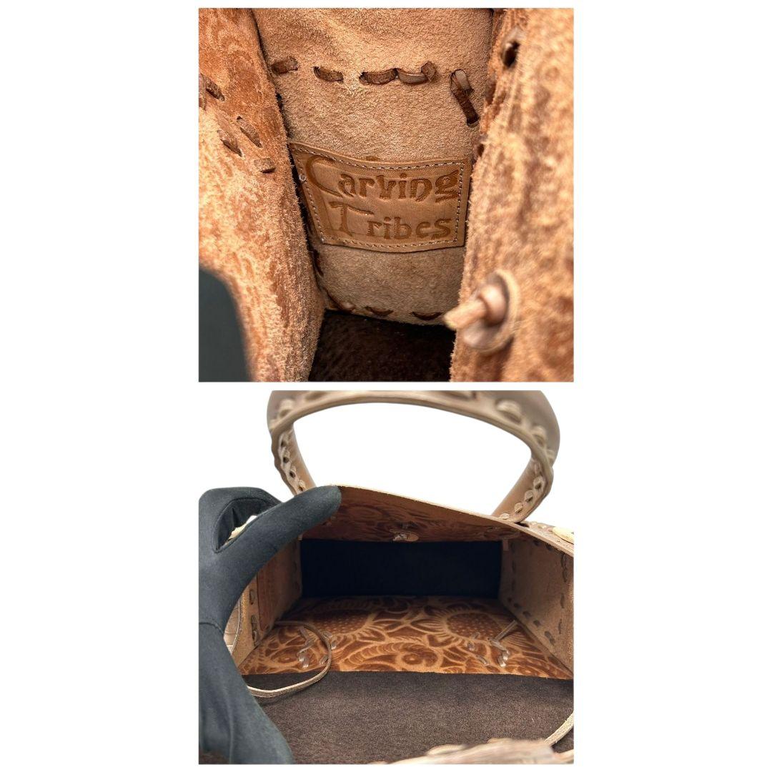美品 カービングトライブス ハンドバッグ 茶 カービングバッグ 型押し レザー 本革 フラップ トートバッグ 自立可 ブラウン Carving Tribes H 上品デザイン オシャレ
