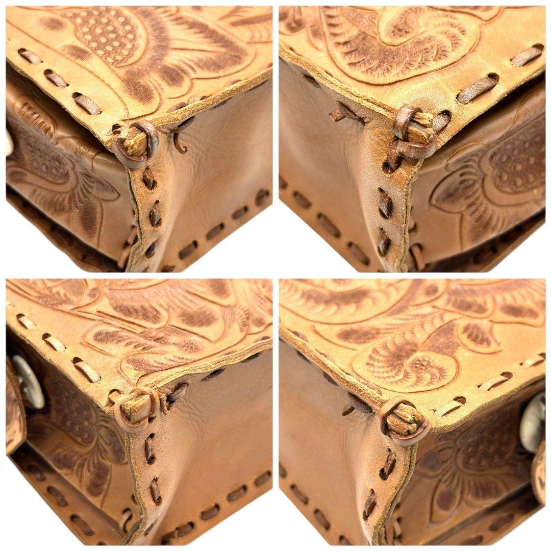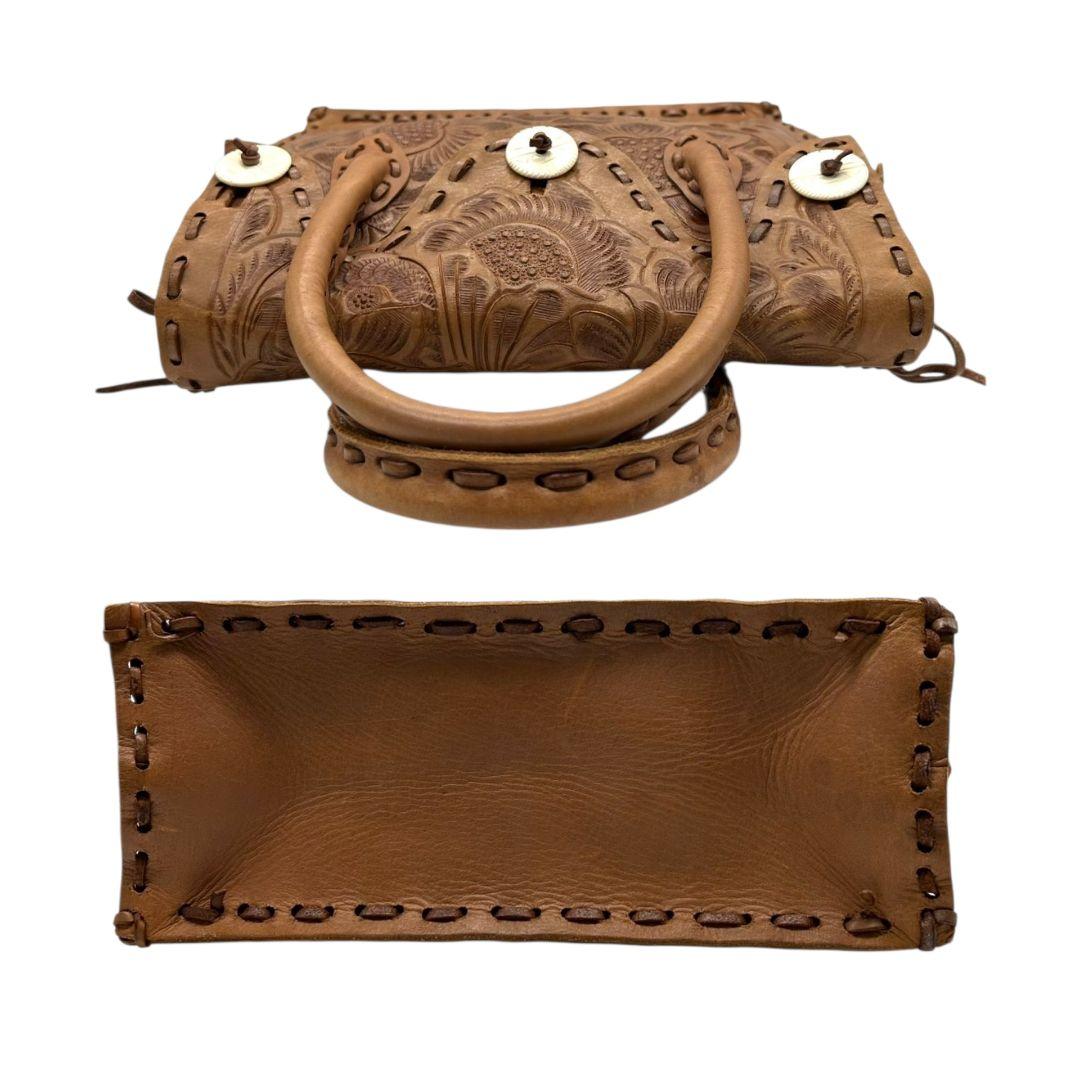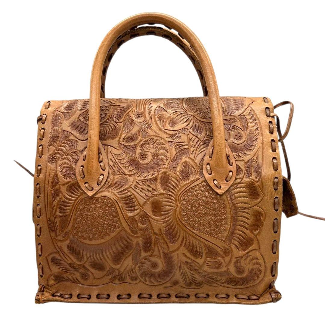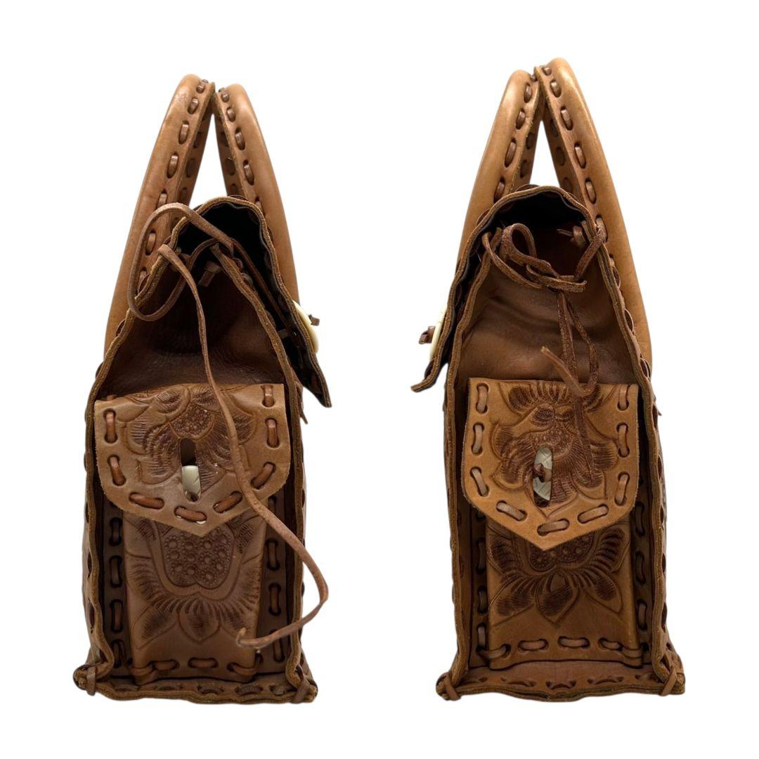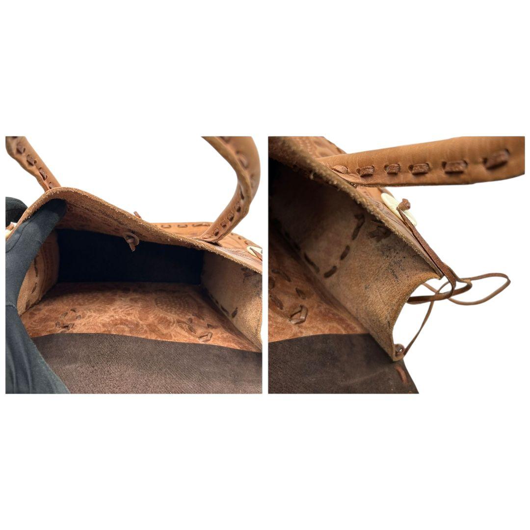 美品 カービングトライブス ハンドバッグ 茶 カービングバッグ 型押し レザー 本革 フラップ トートバッグ 自立可 ブラウン Carving Tribes H 上品デザイン オシャレ