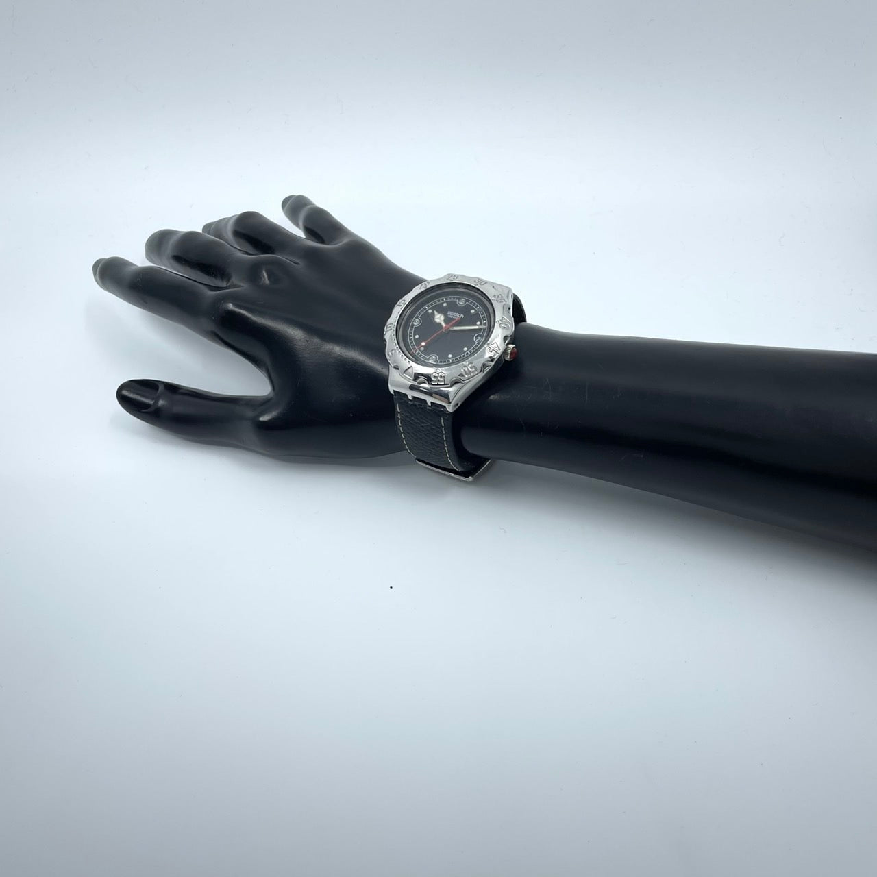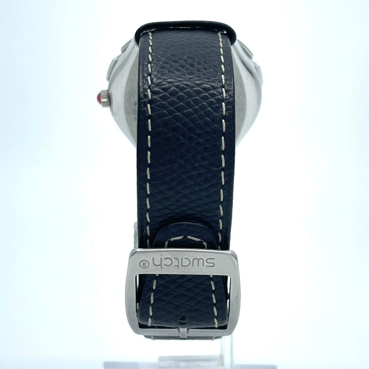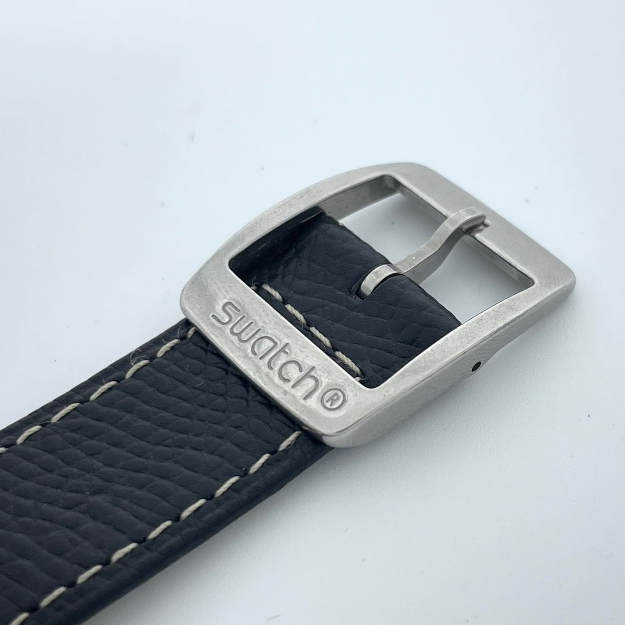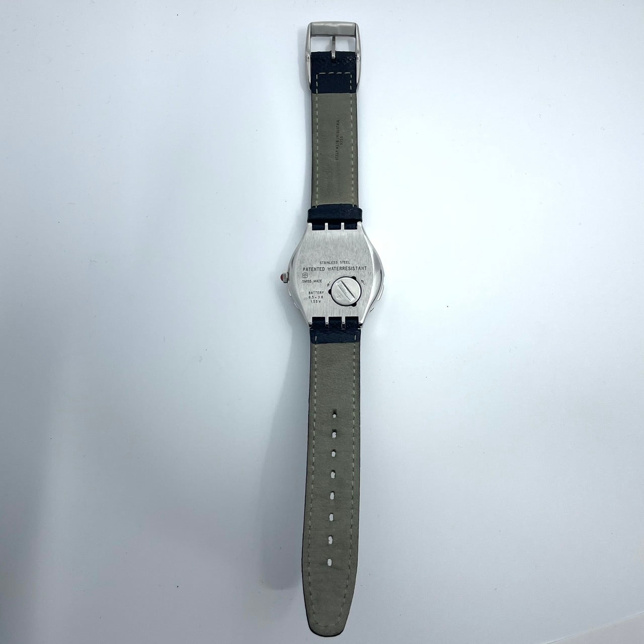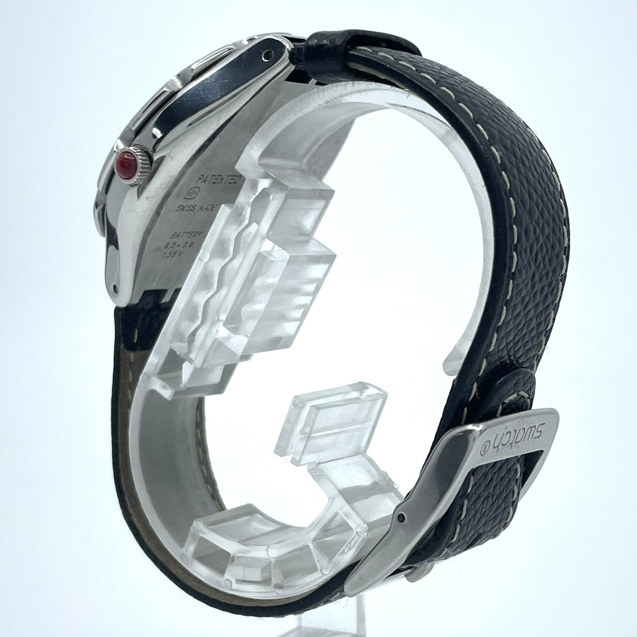 [Battery replaced/Excellent condition] Swatch YDS401 IRONY 1994 Vintage Men's Quartz Analog Watch with Date Function and Leather Strap. Classic, Sporty, Rare, Black Silver. Cleaned.