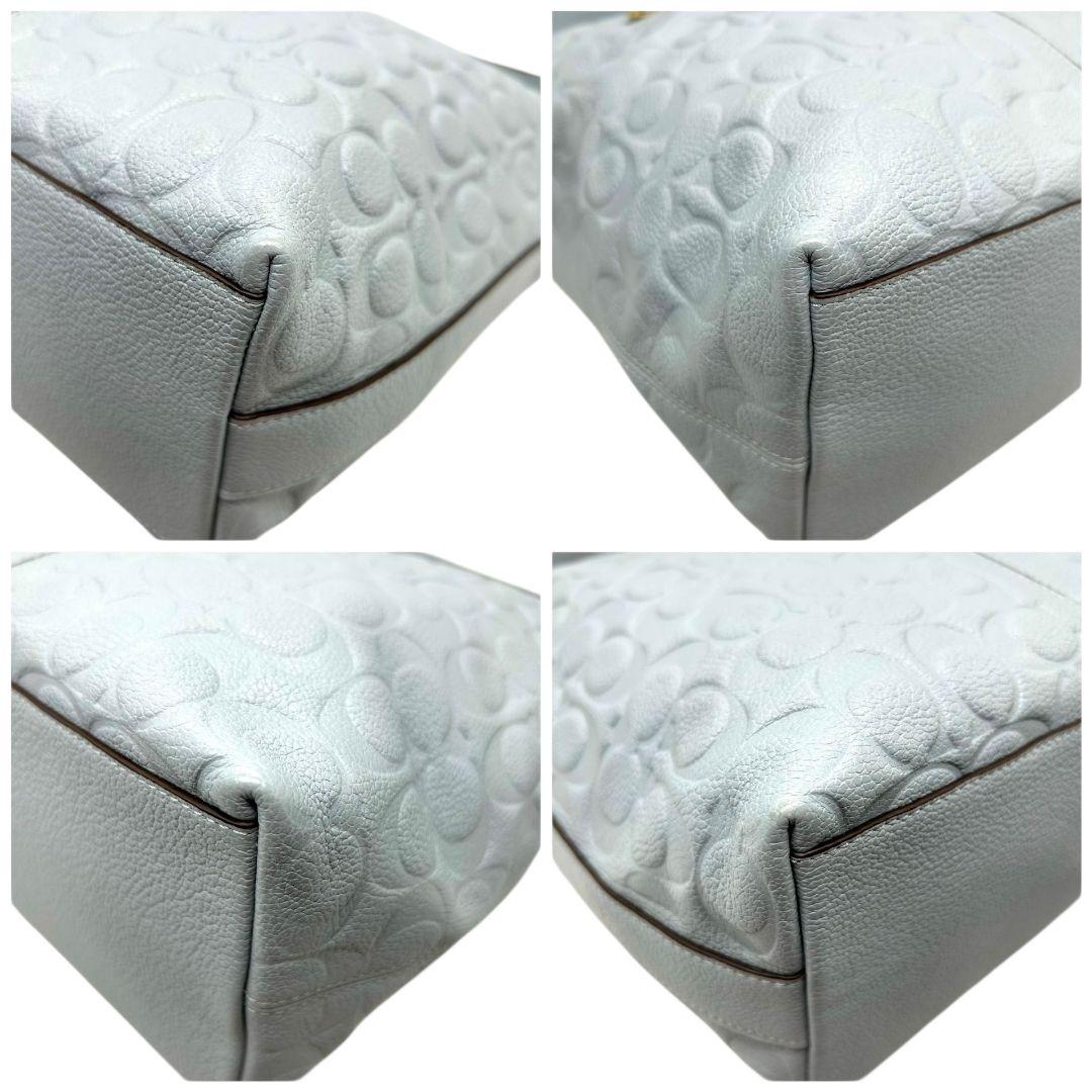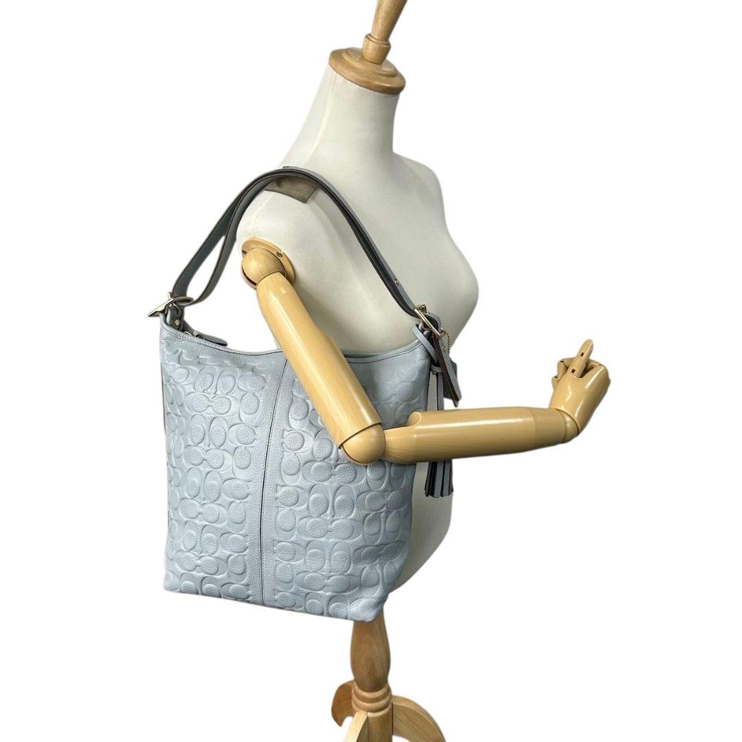 美品 COACH コーチ ショルダーバッグ トート 2way シグネチャー エンボス 斜め掛け可 ワンショルダー レザー 本革 グレー×ライトブルー ロゴタグ タッセル ゴールド金具 T6