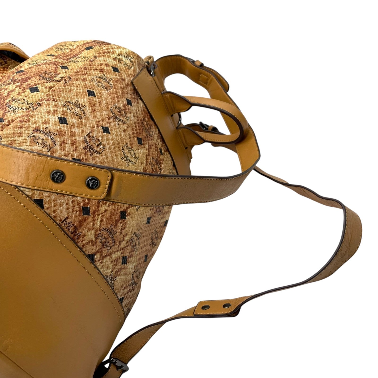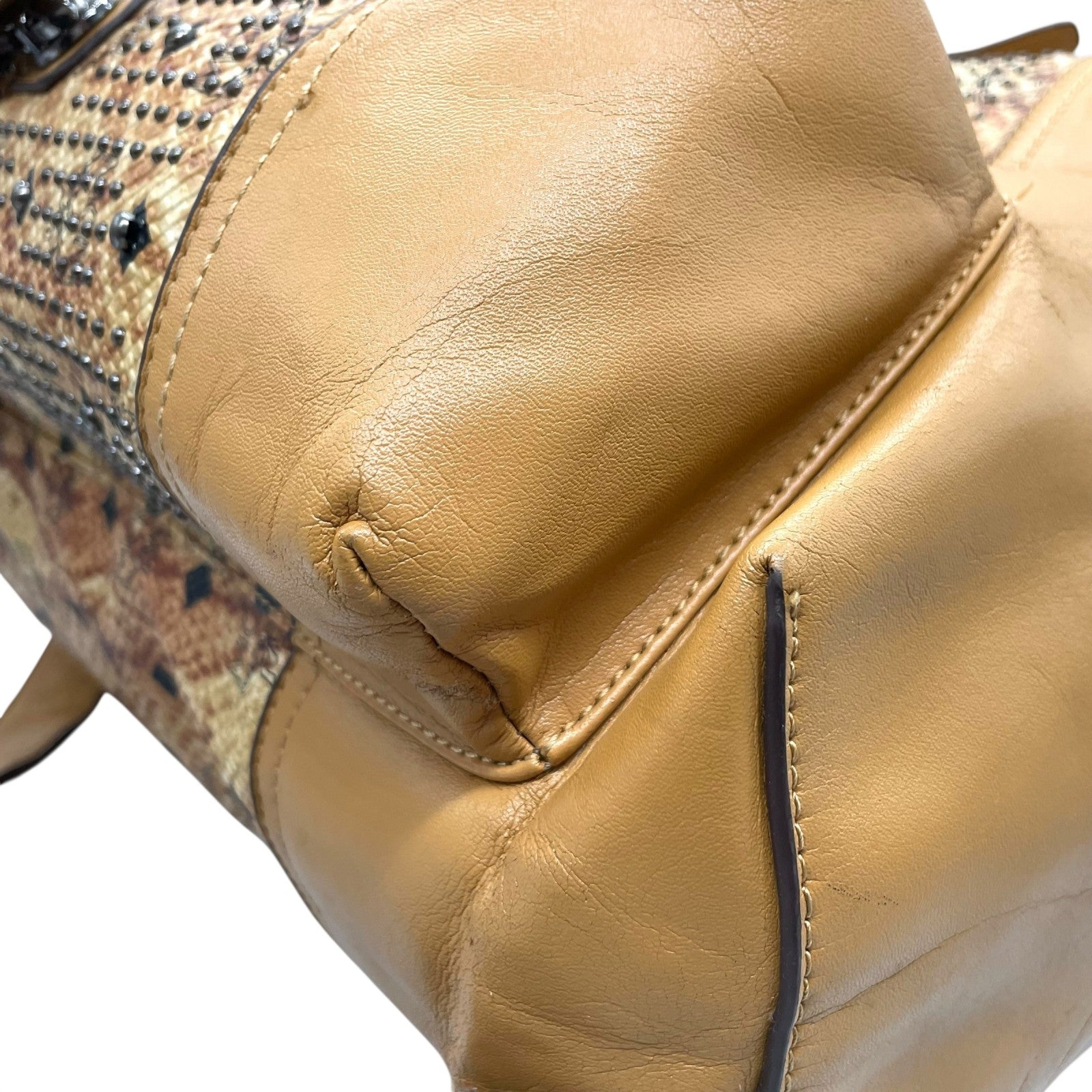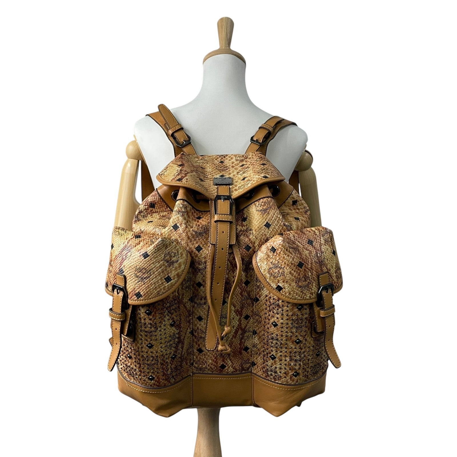 希少 MCM エムシーエム ヴィセトス ロゴグラム リュックサック バックパック 型押し スタッズ ダブルポケット 茶 ブラウン コニャック レザー ブラック金具 レディース R