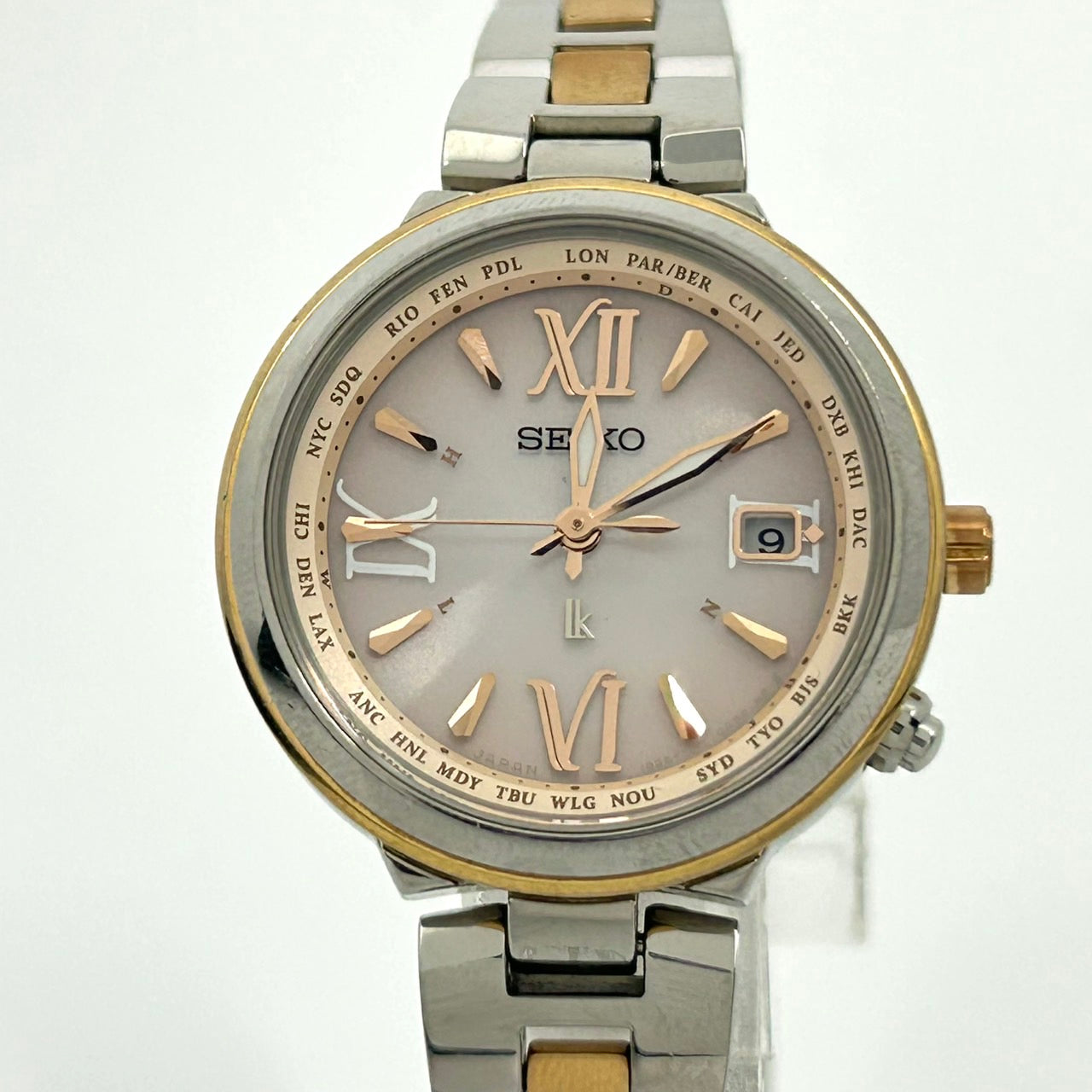 【稼働品】SEIKO LUKIA セイコー ルキア レディース腕時計 ソーラー電波 1B25-0AK0 ワールドタイム デイト ピンク文字盤 シルバー ゴールド コンビカラー エレガント ビジネス クラシックデザイン クリーニング済み G6