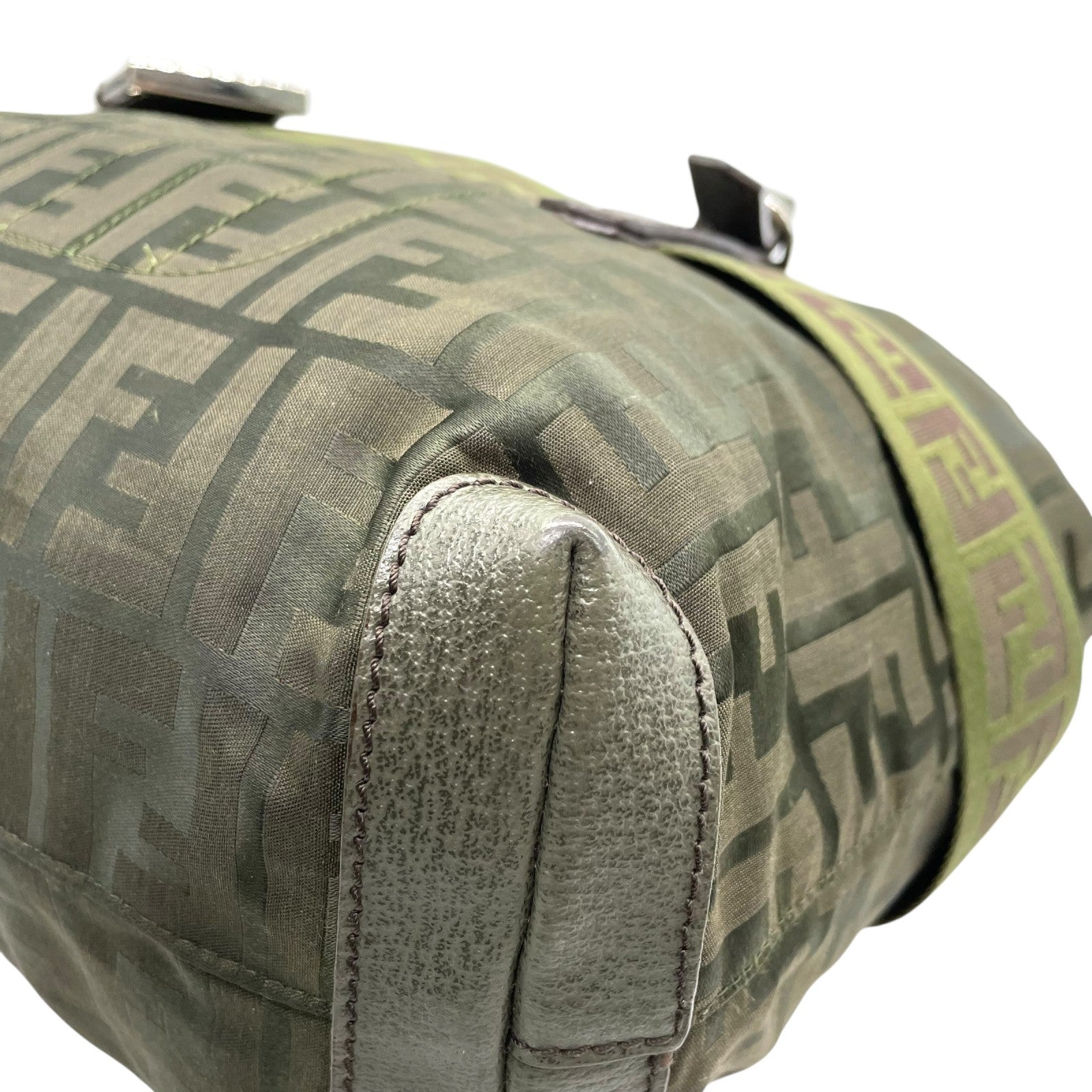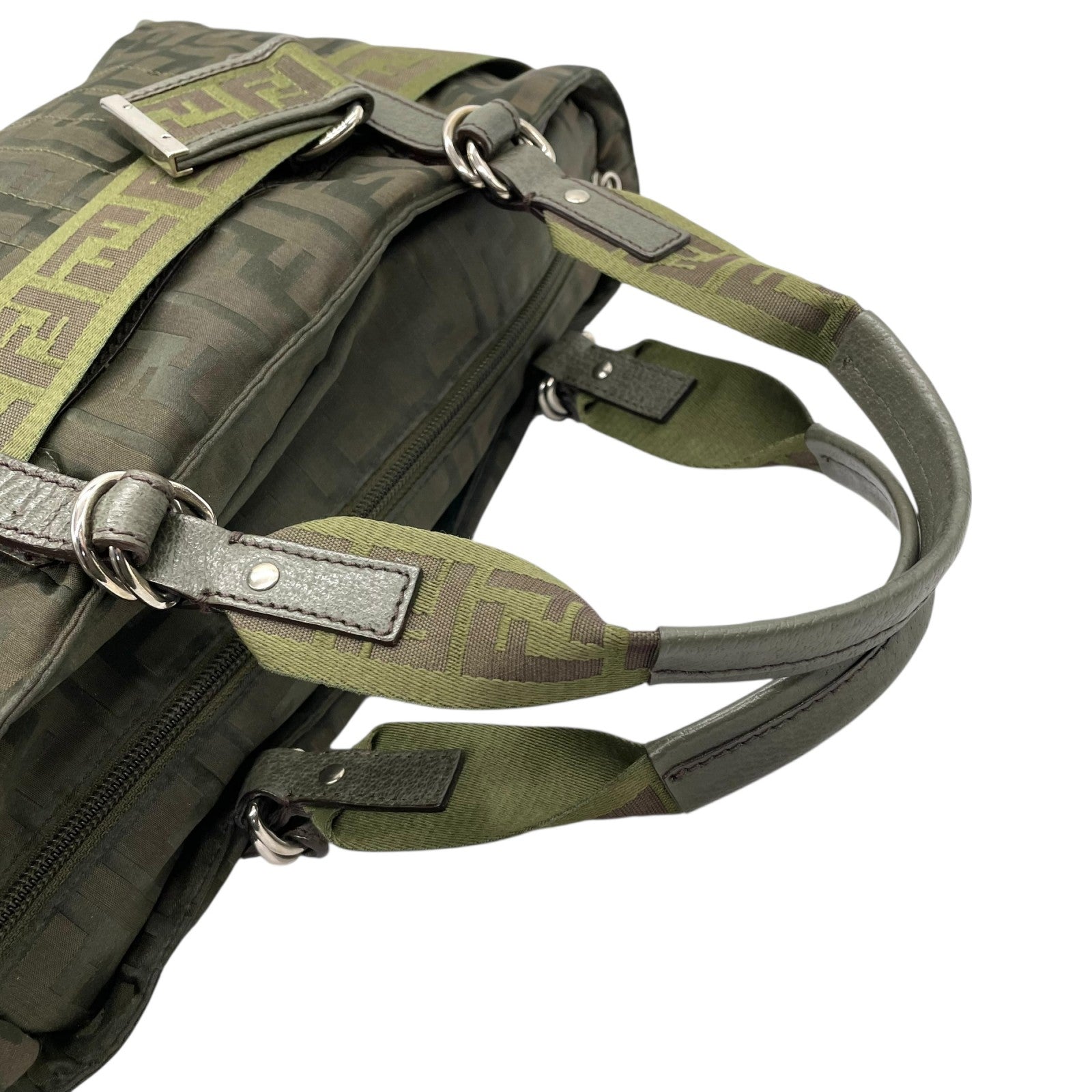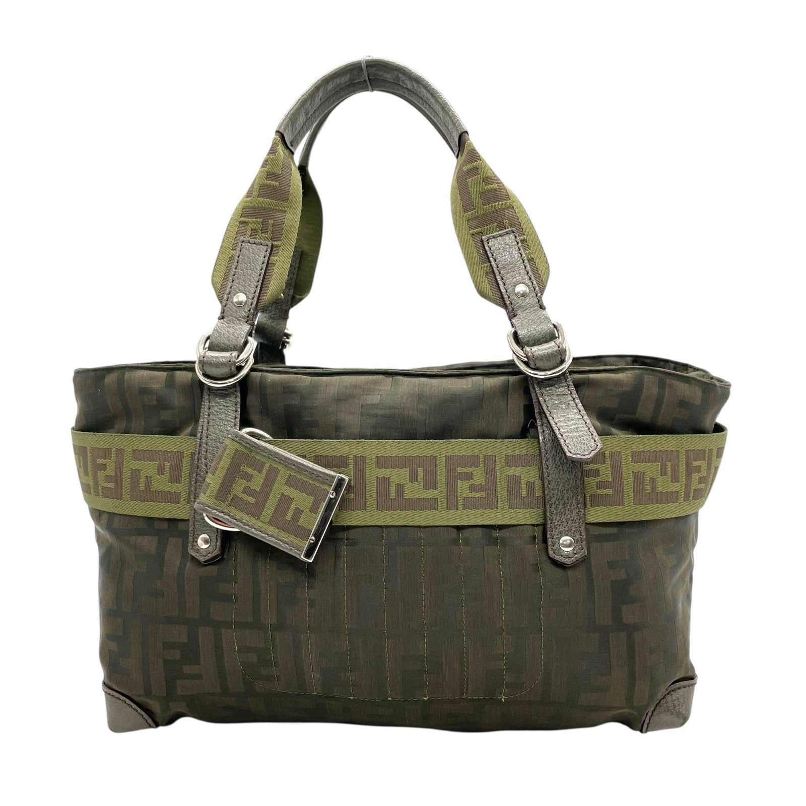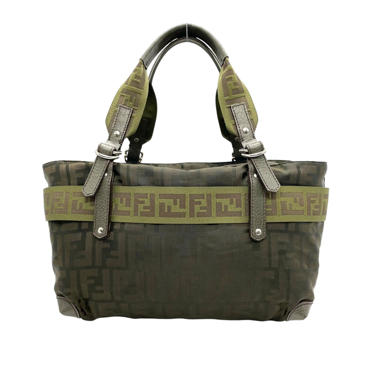 美品 FENDI フェンディ ズッカ柄 ナイロントート バッグ カーキ グリーン FF柄 ベルトデザイン シルバー金具 8BH143 ハンドバッグ レディース B1