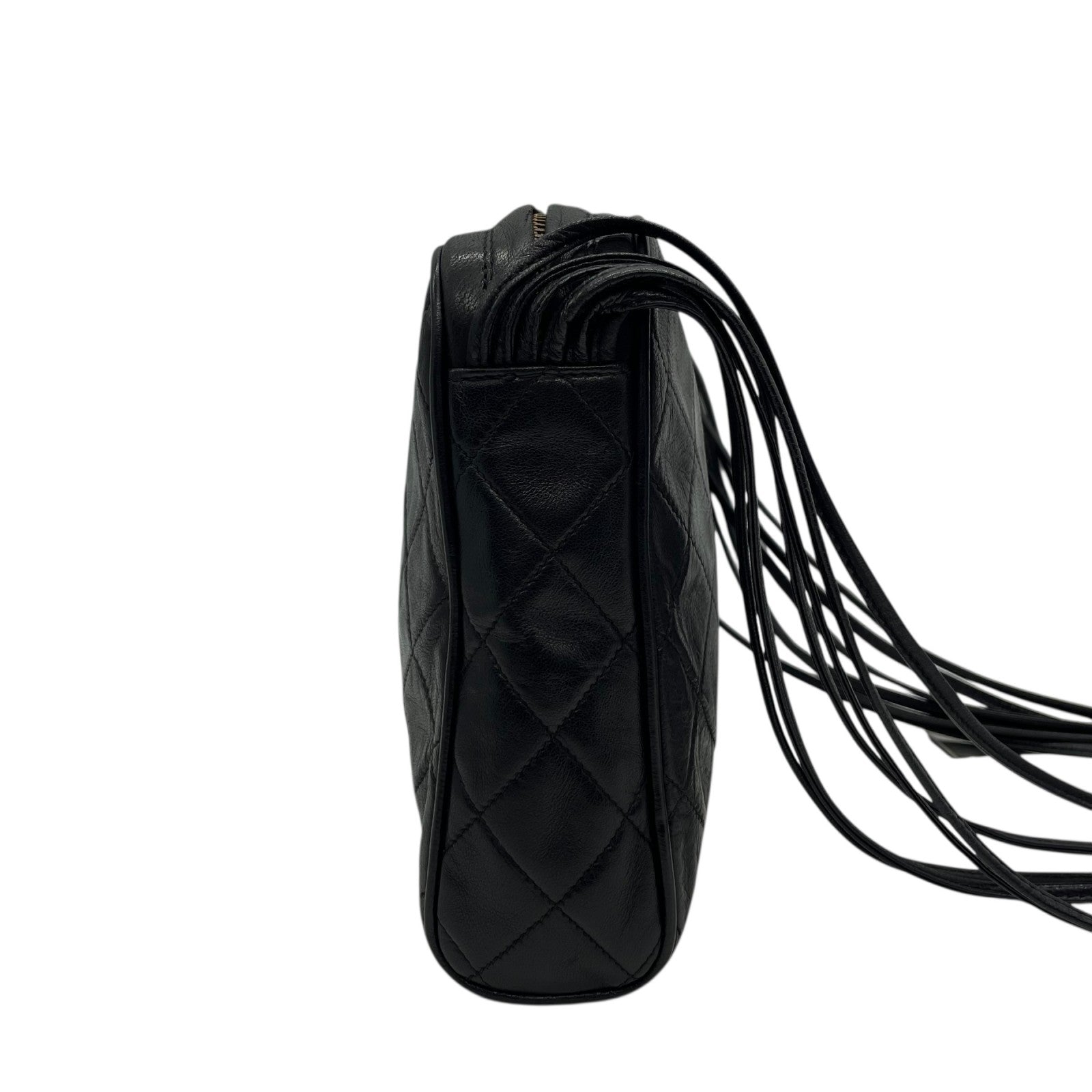 Excellent condition CHANEL Matelasse Fringe Shoulder Bag in black leather with gold metal accents. Vintage COCO Mark A crossbody bag for women.