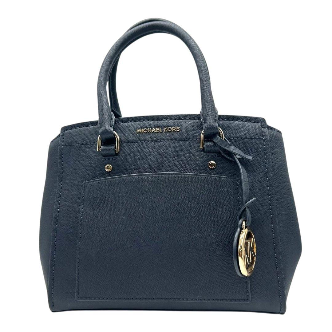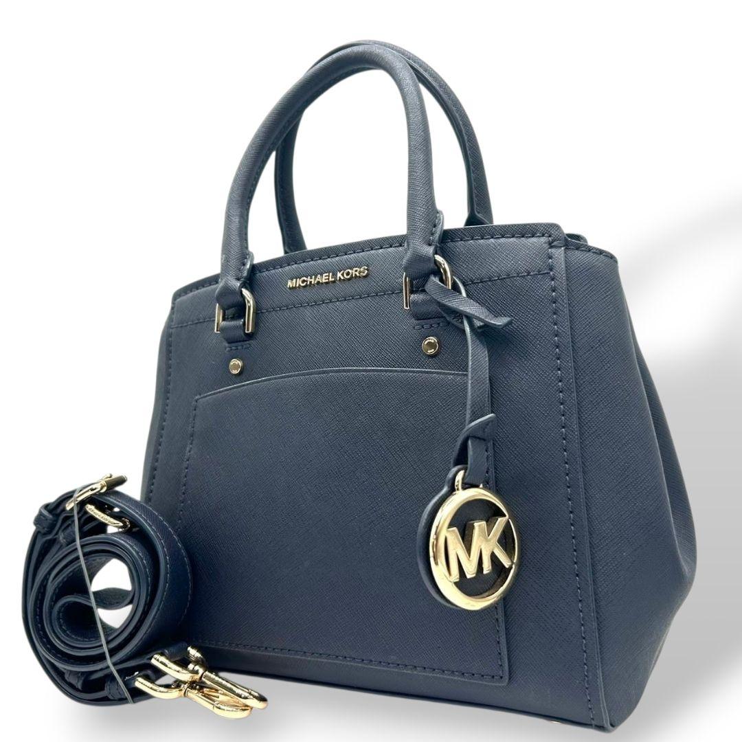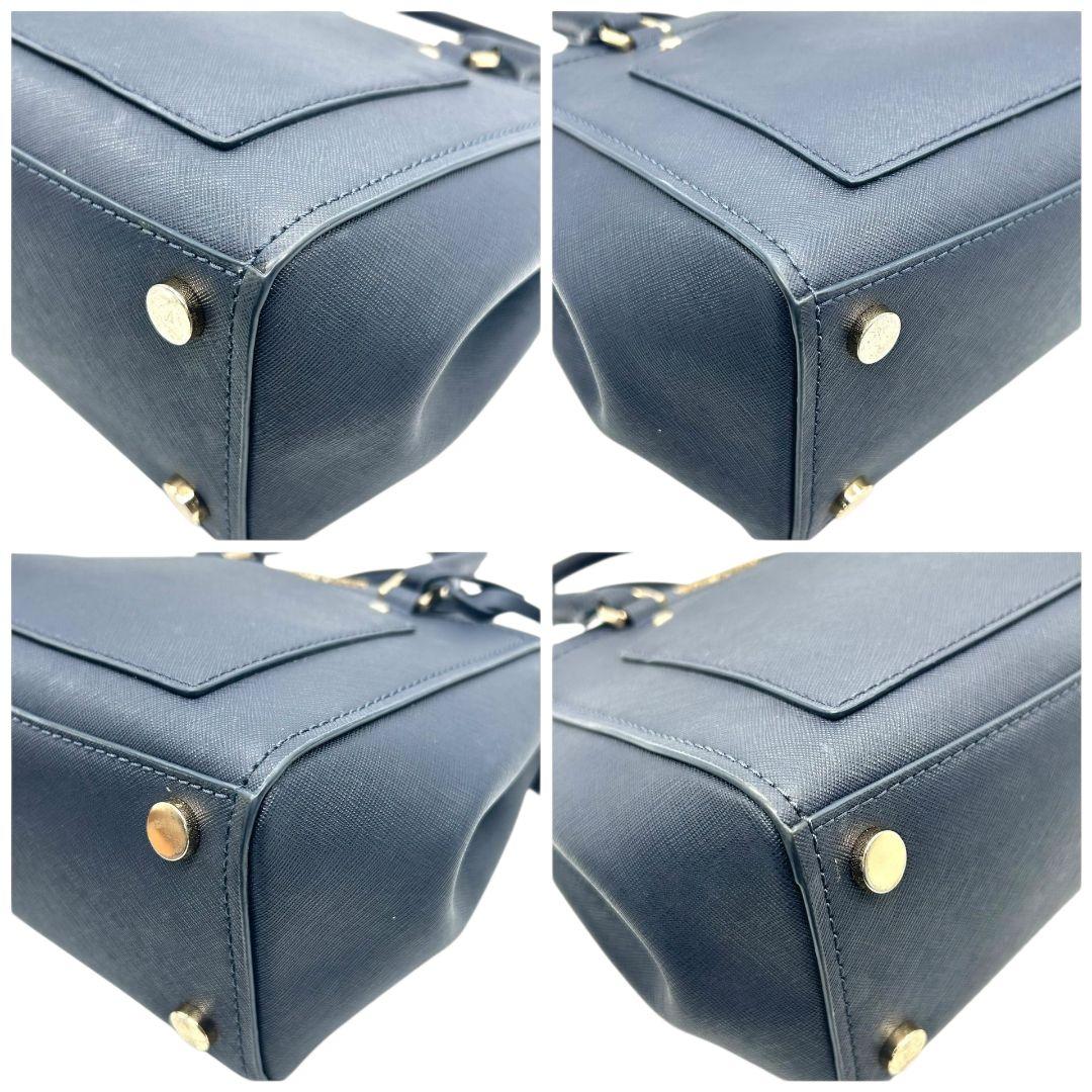 美品 マイケルコース ハンドバッグ 紺 ロゴ 2way 斜め掛け可 s77 トートバッグ ショルダーバッグ 自立可 サフィアーノ PVC レザー ゴールド金具 ロゴプレート チャーム付き ネイビー MICHAEL KORS