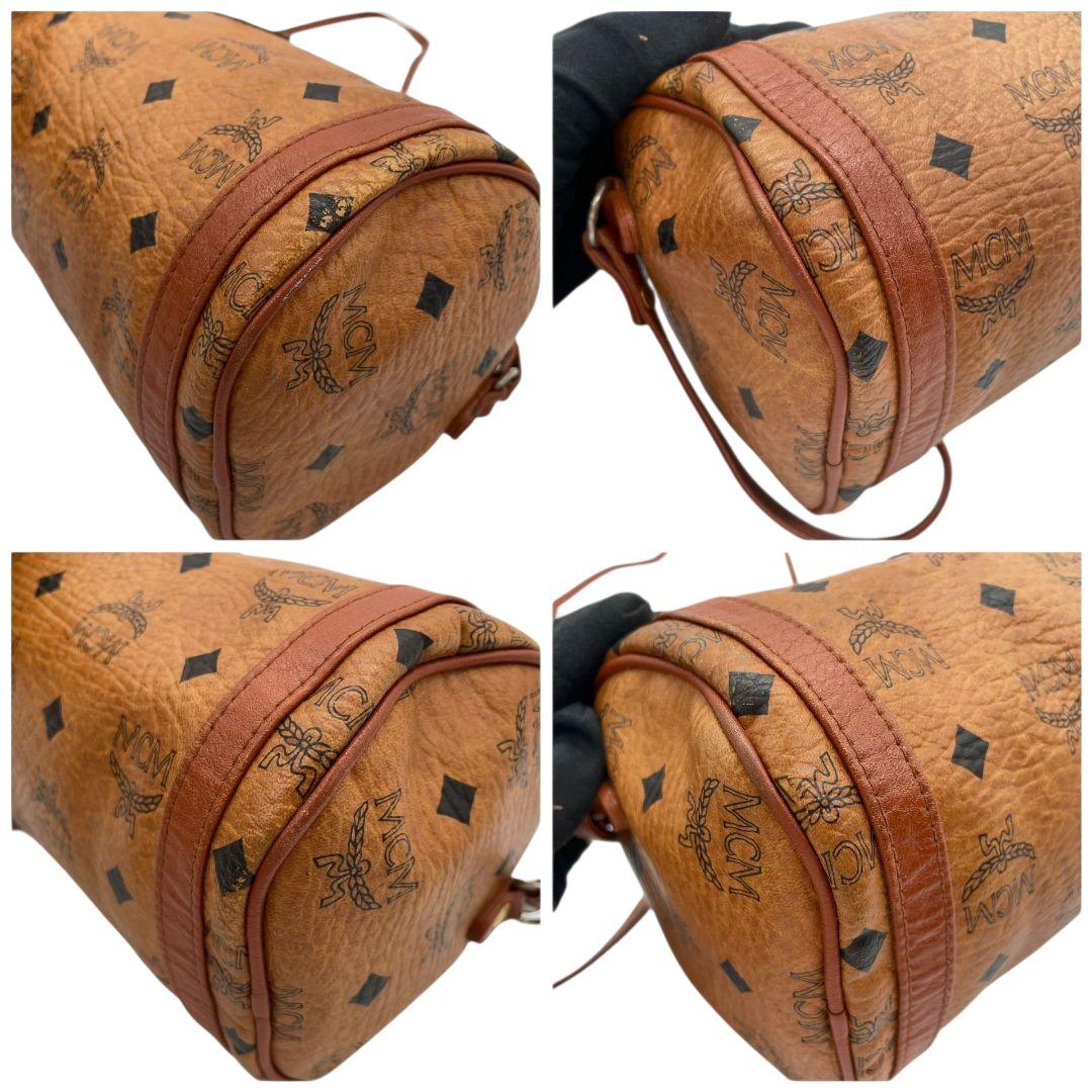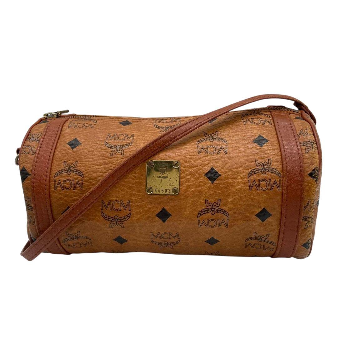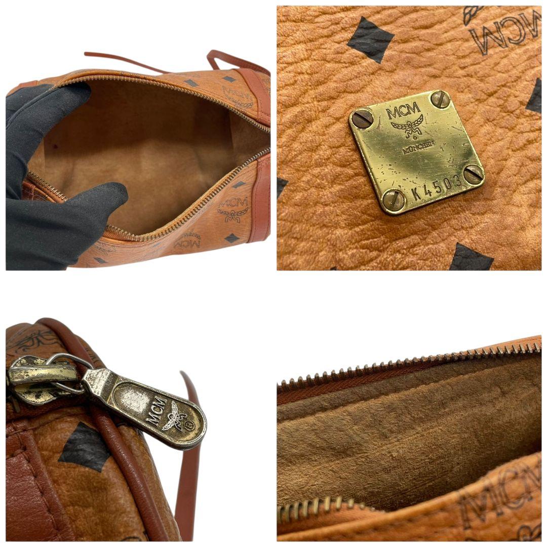 エムシーエム ショルダーバッグ 茶 ヴィセトス柄 ミニボストン 斜め掛け可 MCM ハンドバッグ レザー 本革 ブラウン ゴールド金具 ロゴプレート K4503 自立可