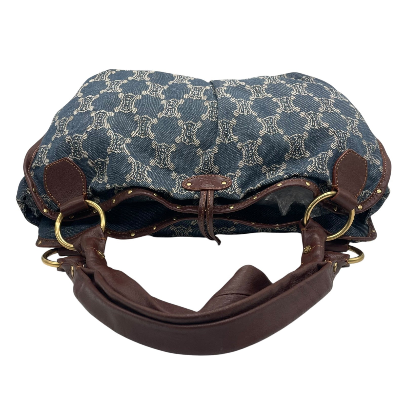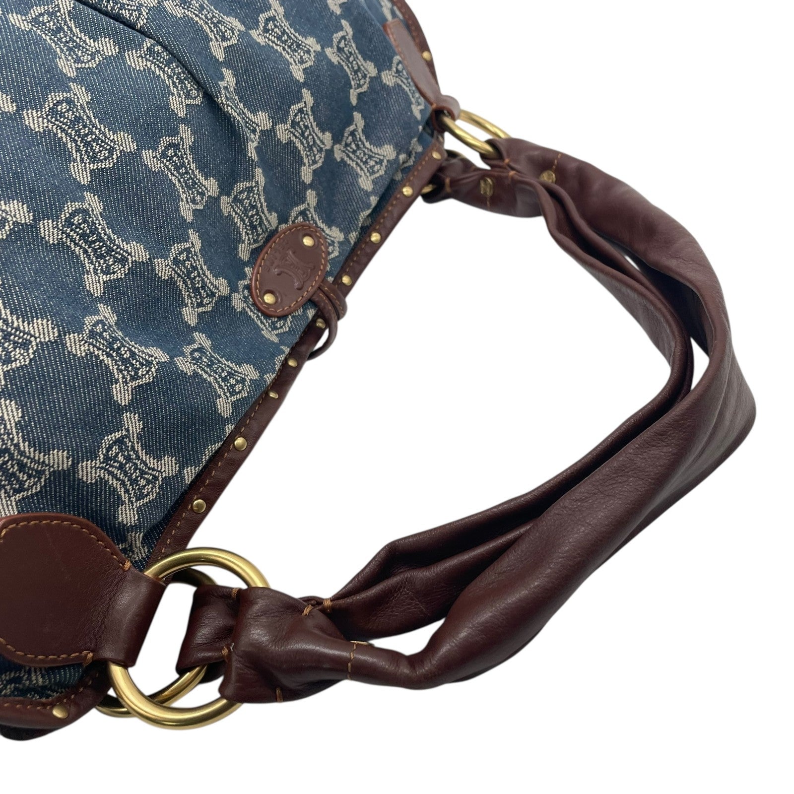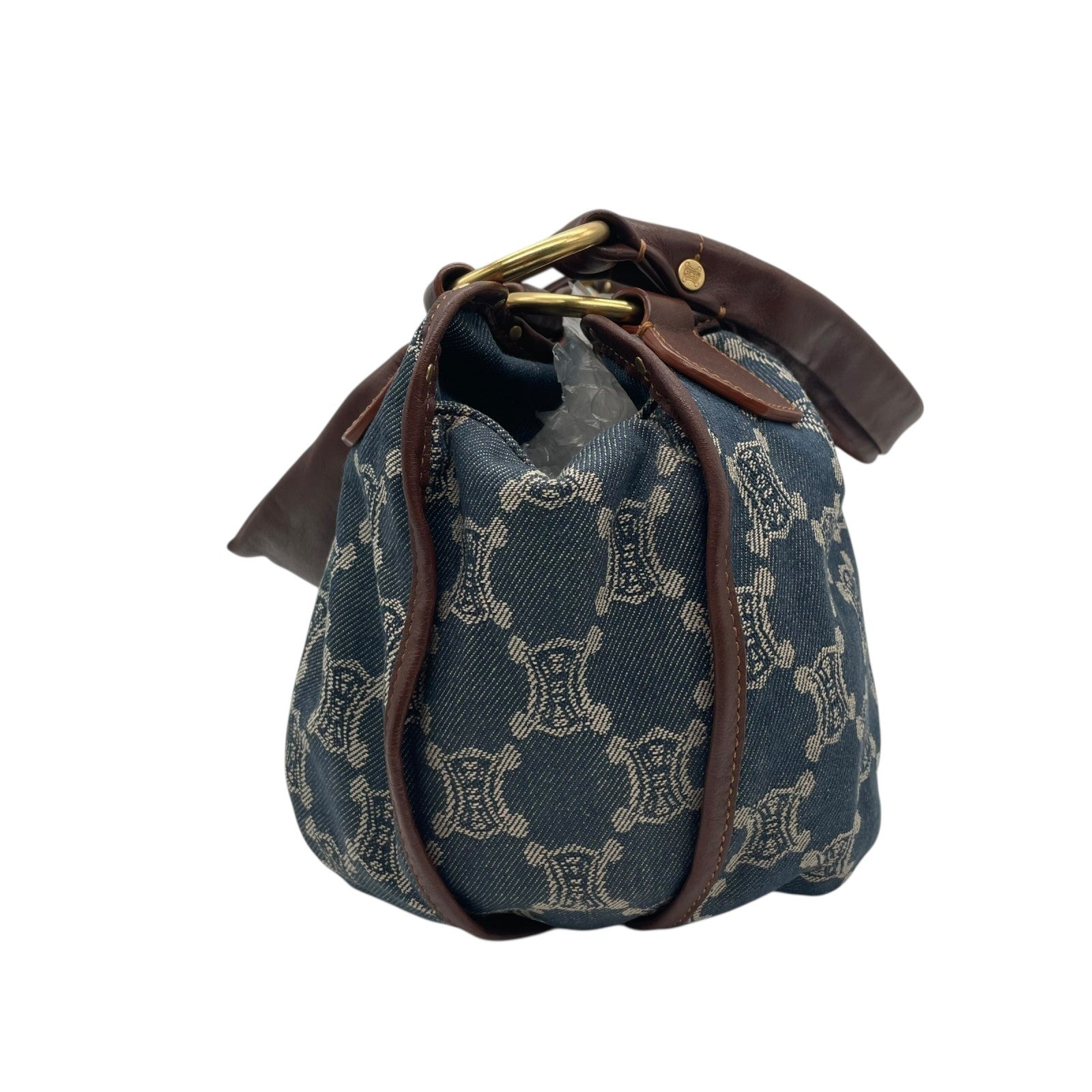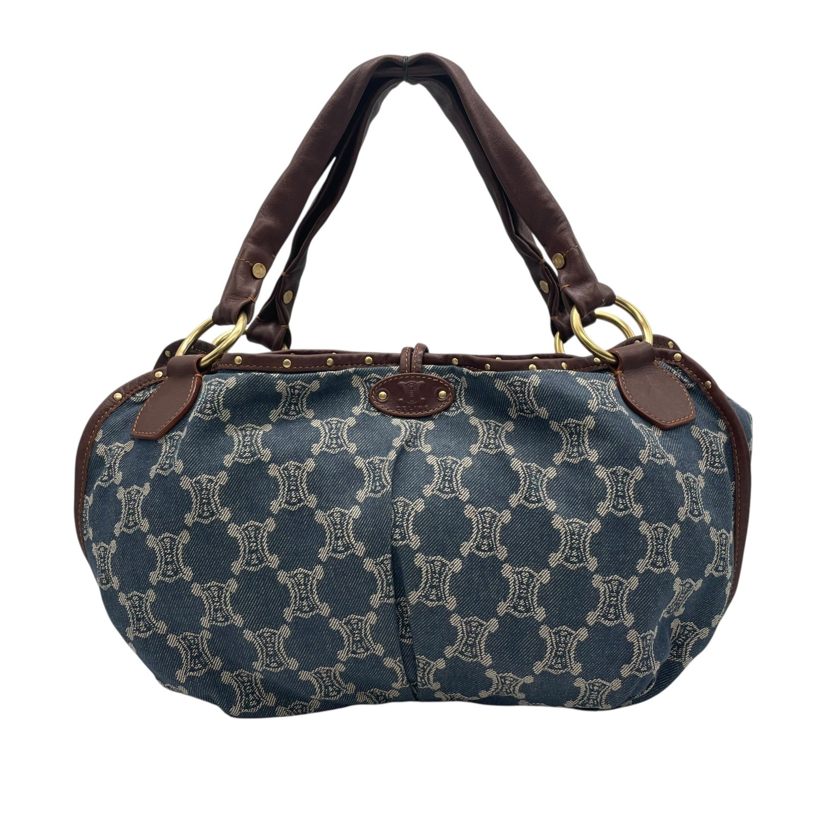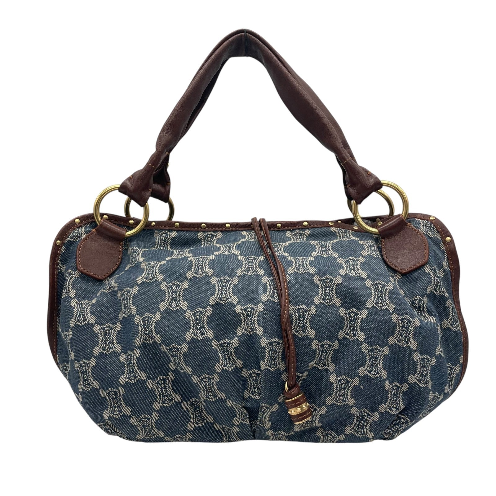Authentic CELINE Pari Macadam Triomphe Denim Leather Handbag Brown Hardware