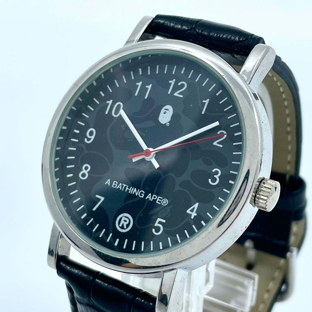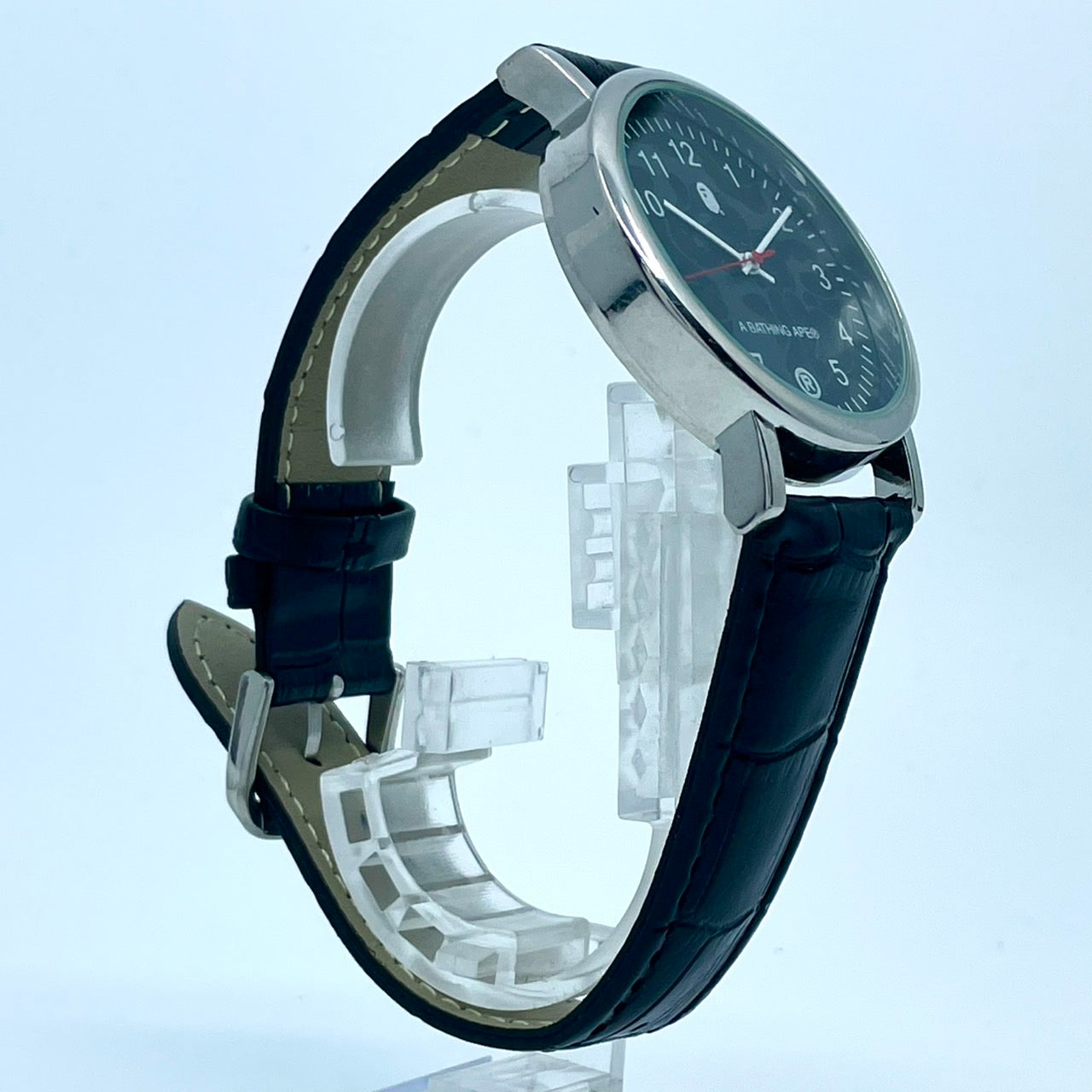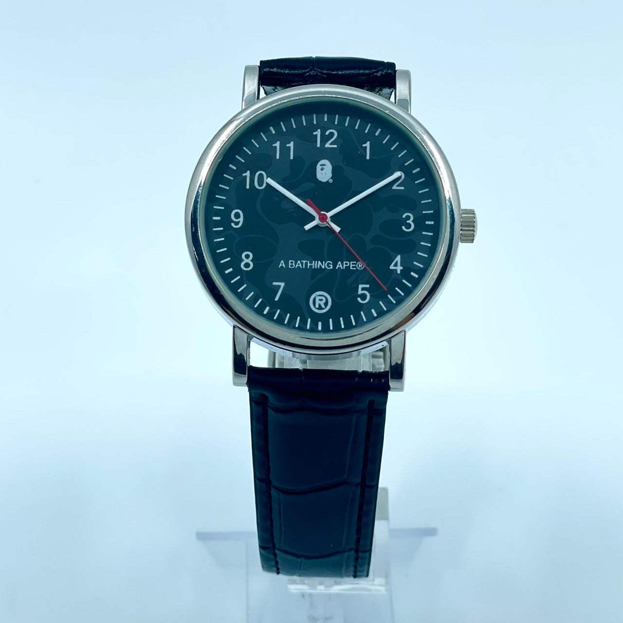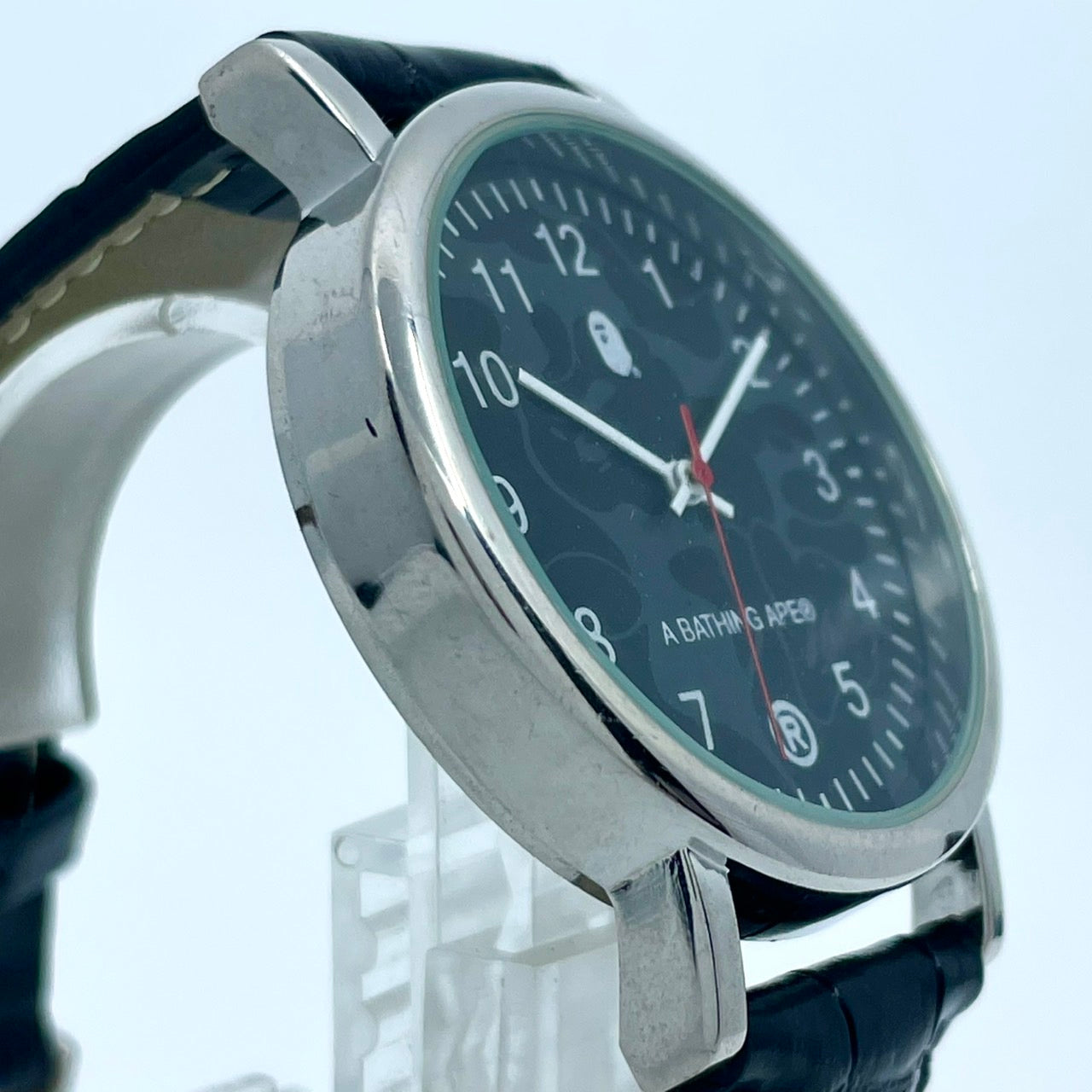 【電池交換済/新品ベルト(社外品)】美品 アベイシングエイプ 腕時計 メンズ クオーツ ブラック文字盤 BAPE CAMO 猿カモ アナログ ストリートファッションウォッチ ラウンド シルバーケース カジュアル 人気モデル クリーニング済み G2