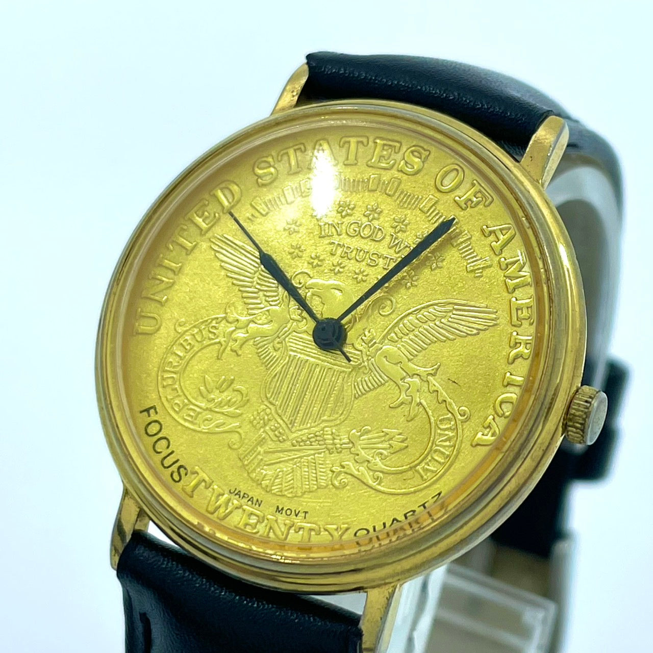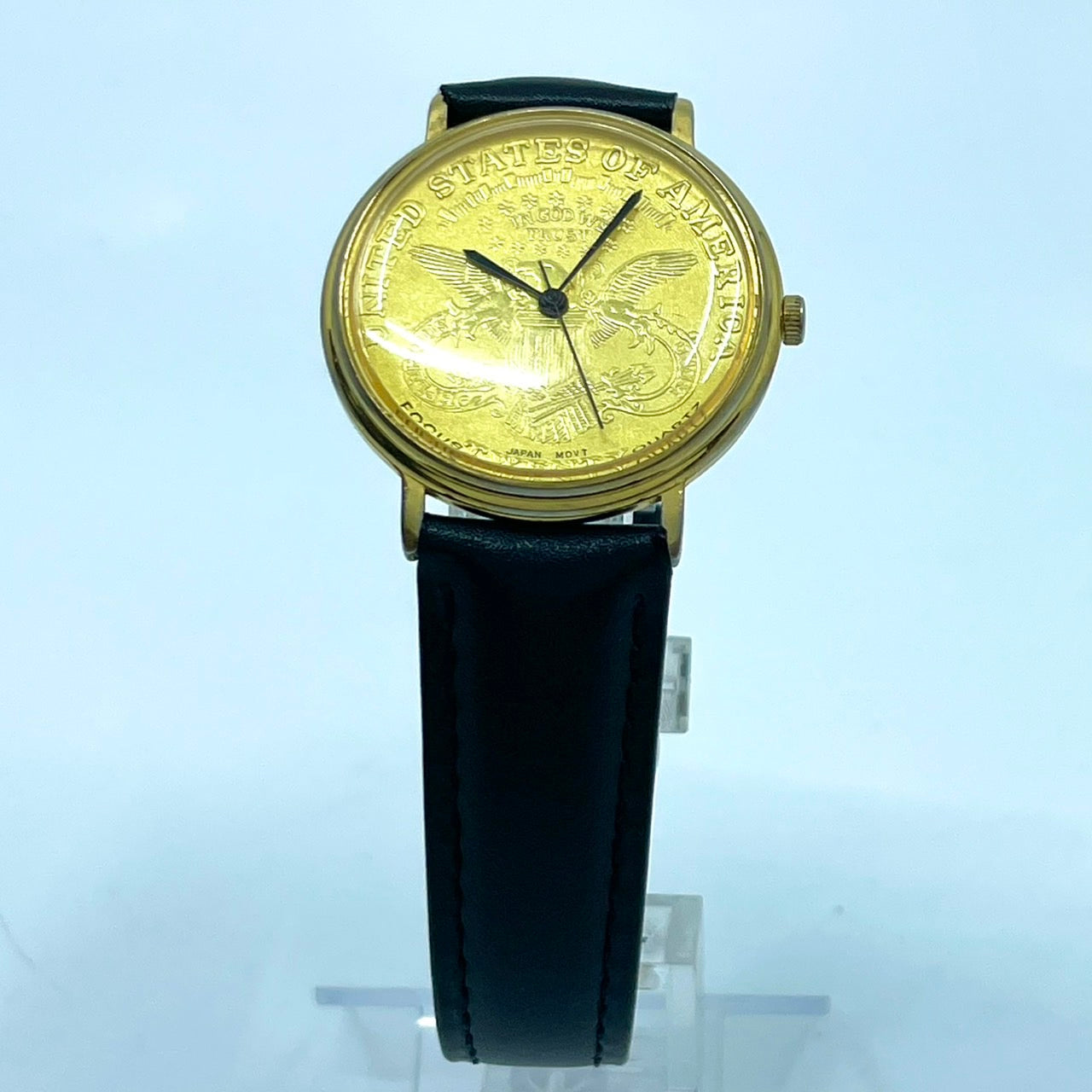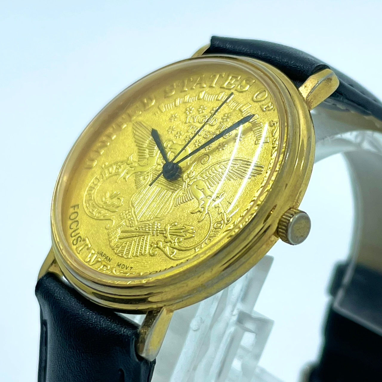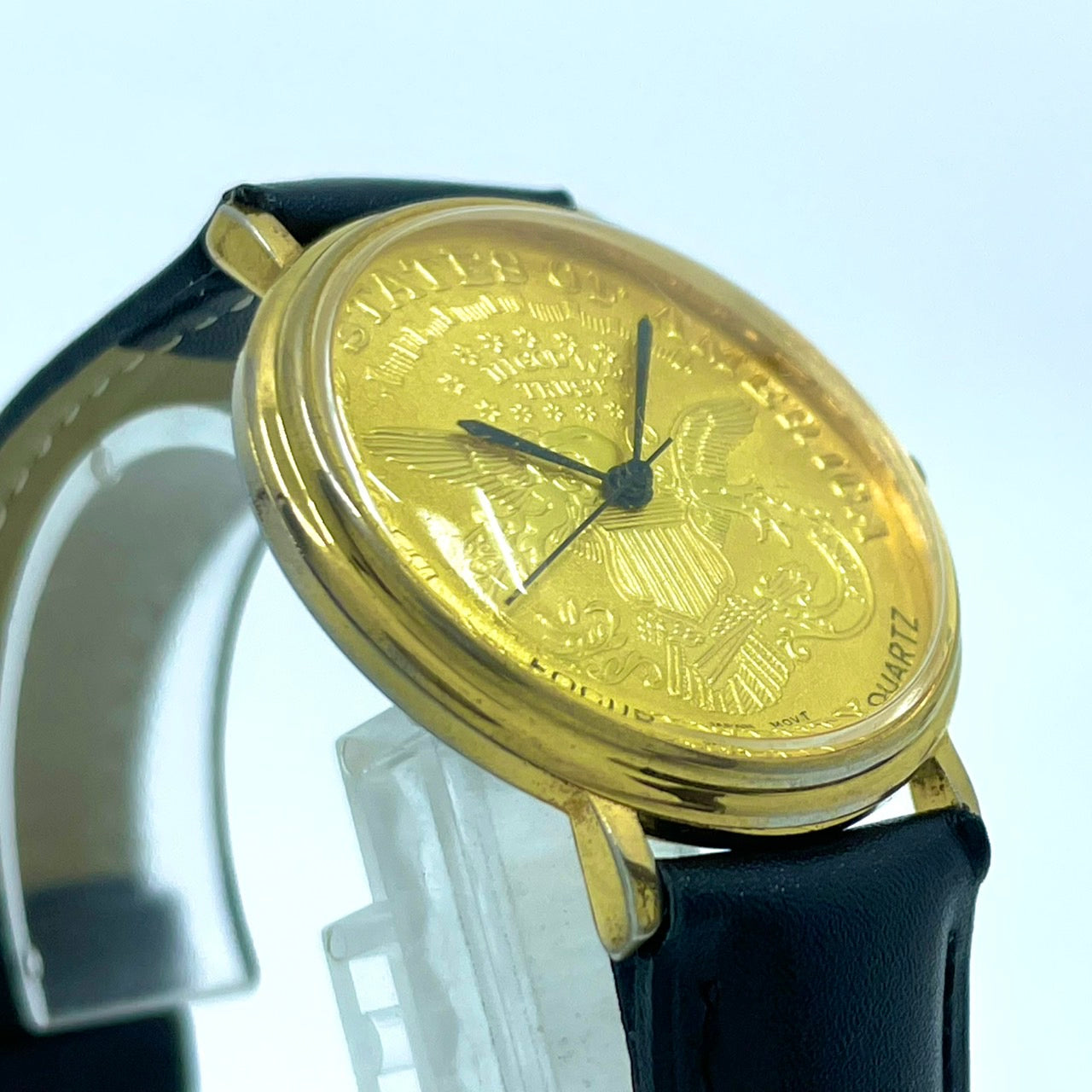 腕時計 メンズ クオーツ コインウォッチ ゴールド文字盤 ブラックレザーベルト アナログ ラウンド アメリカンイーグルデザイン ビンテージ風 ファッションウォッチ 電池交換済 新品ベルト(社外品) クリーニング済 G2