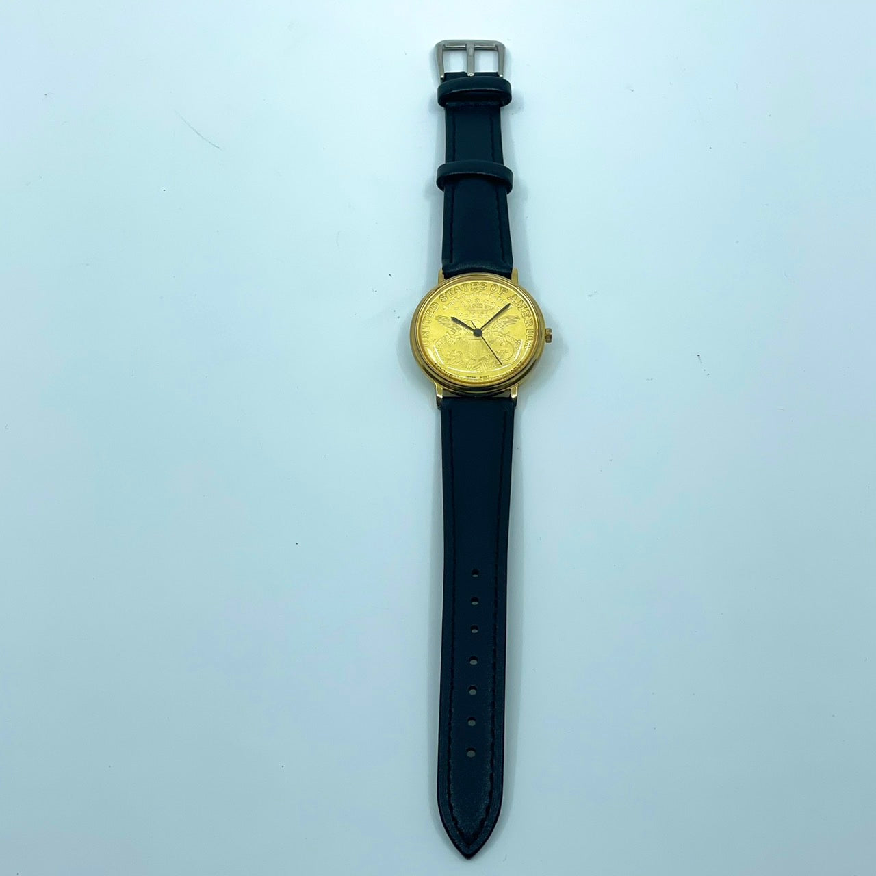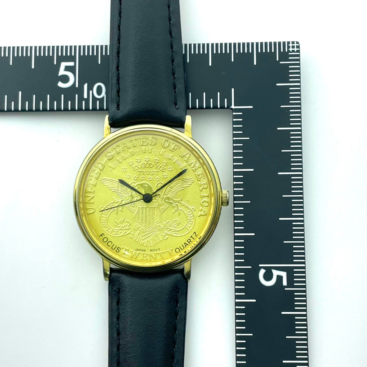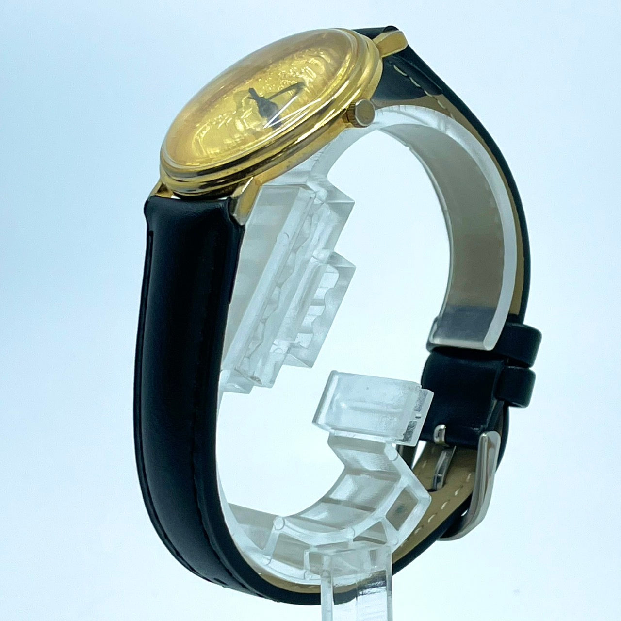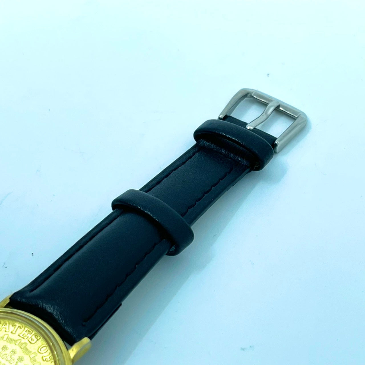 腕時計 メンズ クオーツ コインウォッチ ゴールド文字盤 ブラックレザーベルト アナログ ラウンド アメリカンイーグルデザイン ビンテージ風 ファッションウォッチ 電池交換済 新品ベルト(社外品) クリーニング済 G2