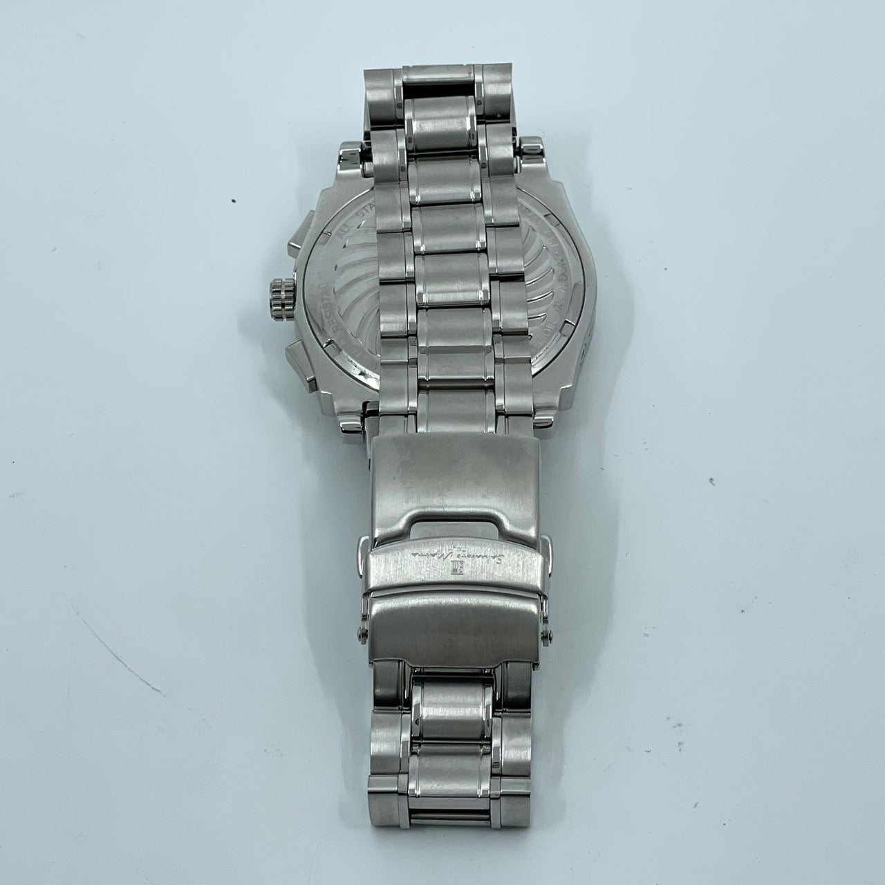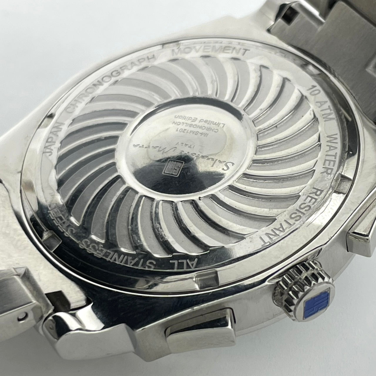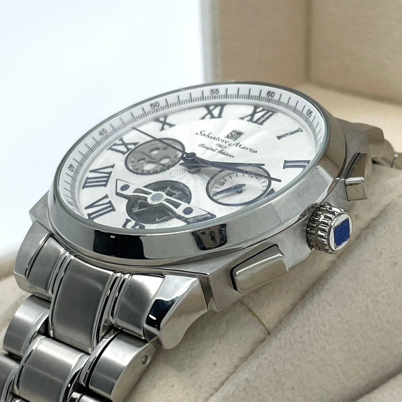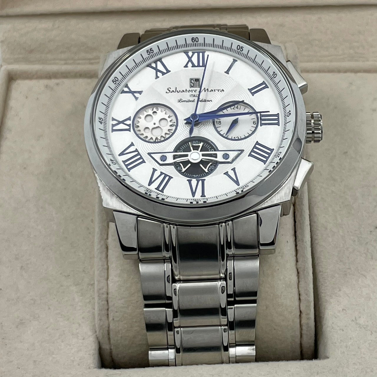 【電池交換済/稼働品/美品】Salvatore Marra サルバトーレマーラ メンズ 腕時計 クロノグラフ 限定モデル シルバー ホワイト文字盤 ブルー針 ローマンインデックス 多機能 クオーツ アナログ クラシック エレガント ビジネス 高級感 G4