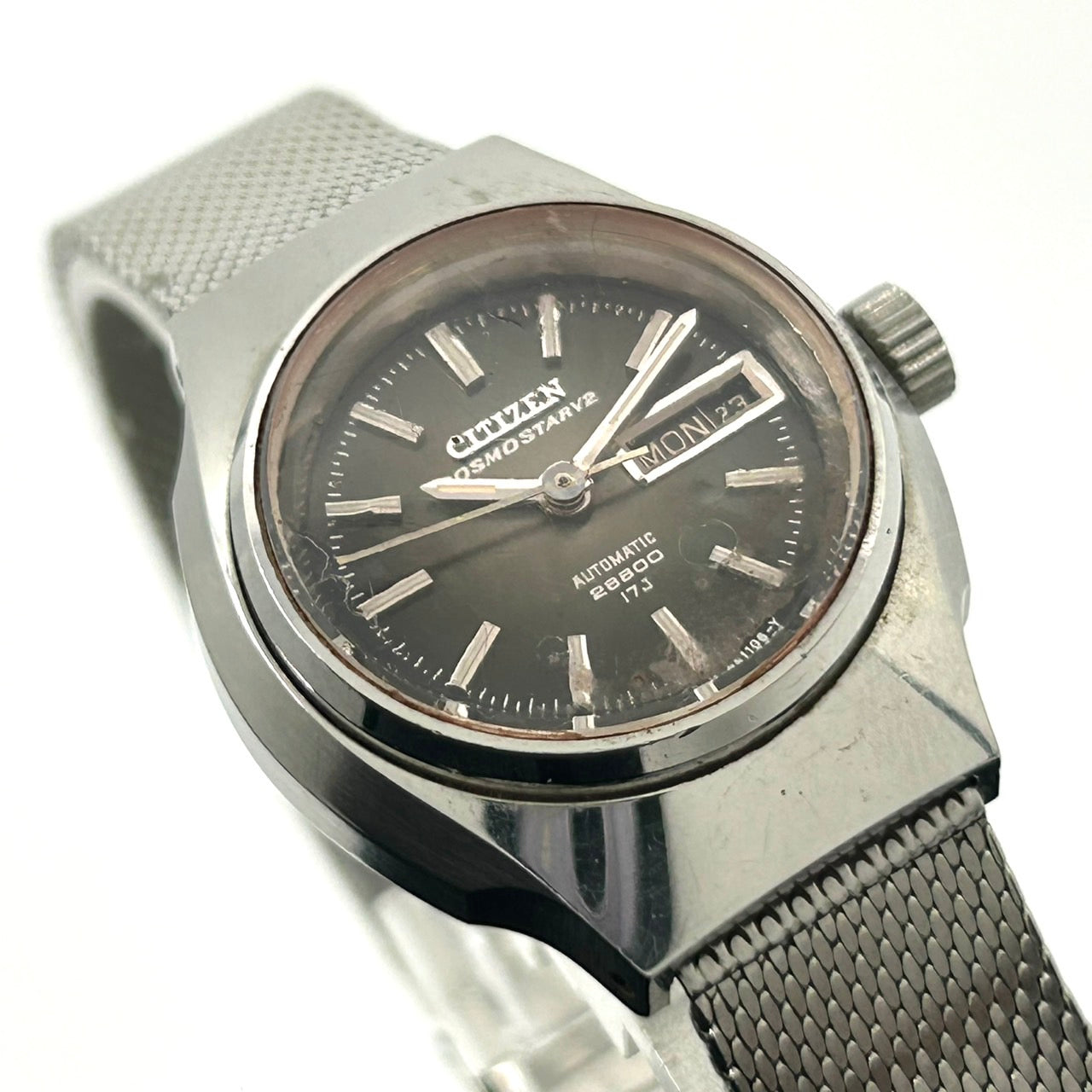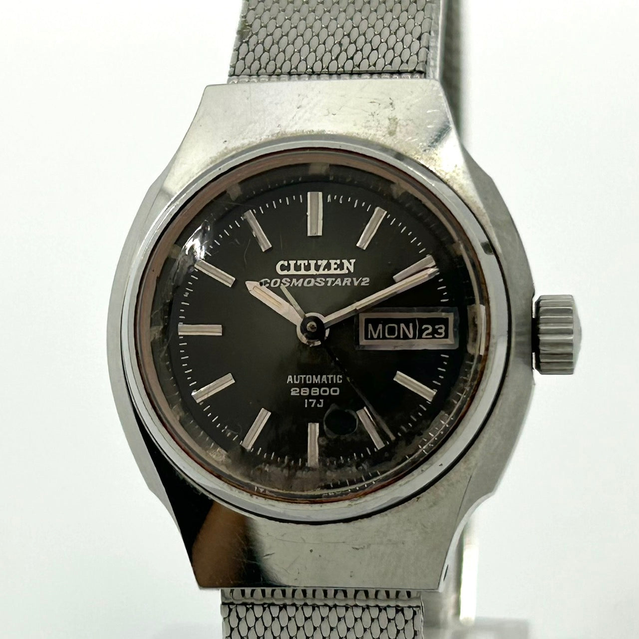 【稼働品】希少 シチズン コスモスターV2 腕時計 4-660536 Y 自動巻き 17石 デイデイト 黒文字盤 メンズ レディース ユニセックス ビンテージ アンティーク クラシック レトロ アナログ ドレスウォッチ シルバー クリーニング済 G5