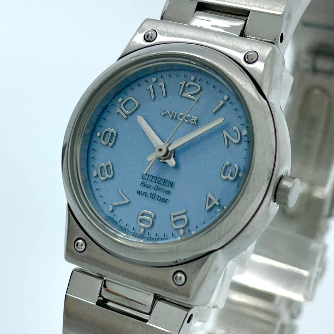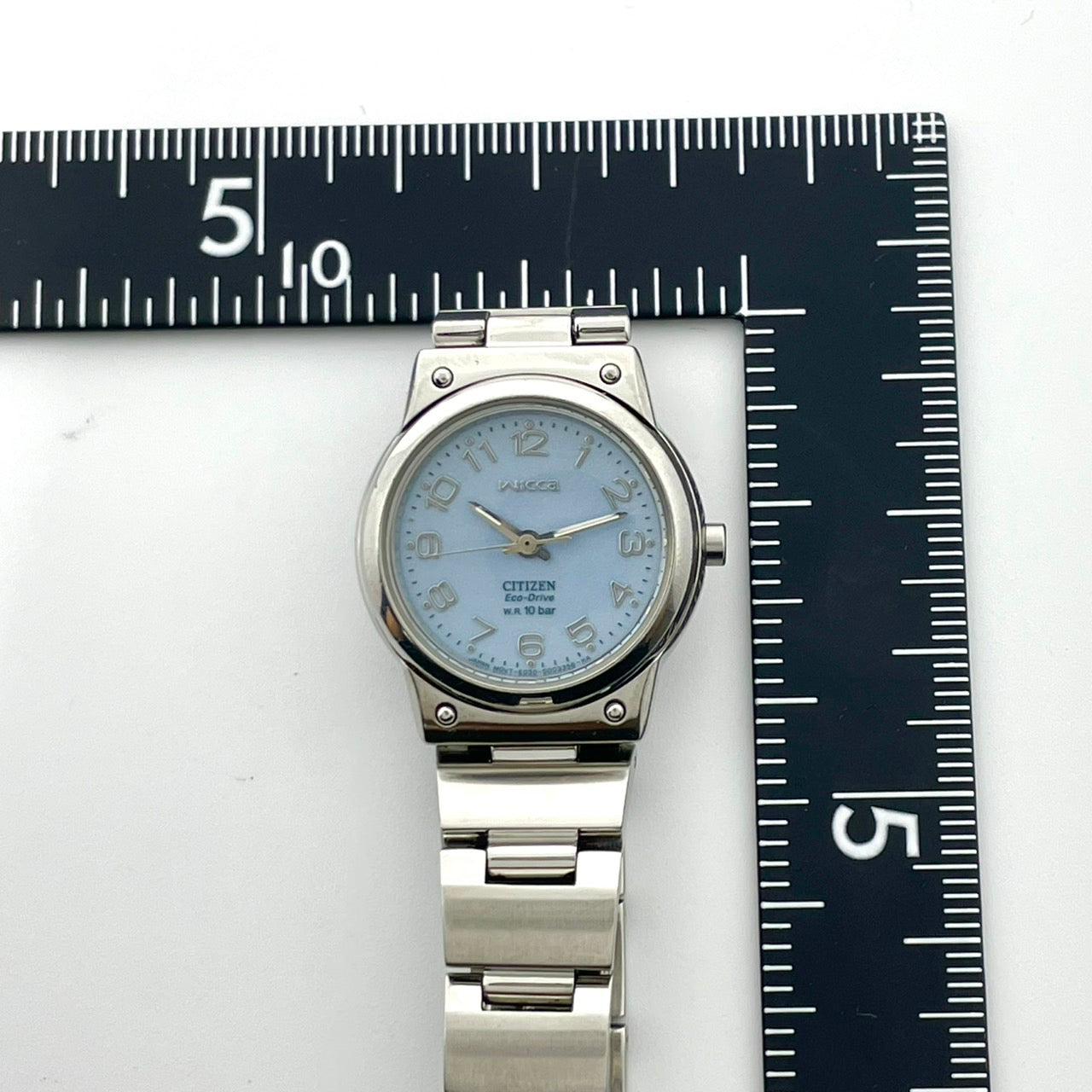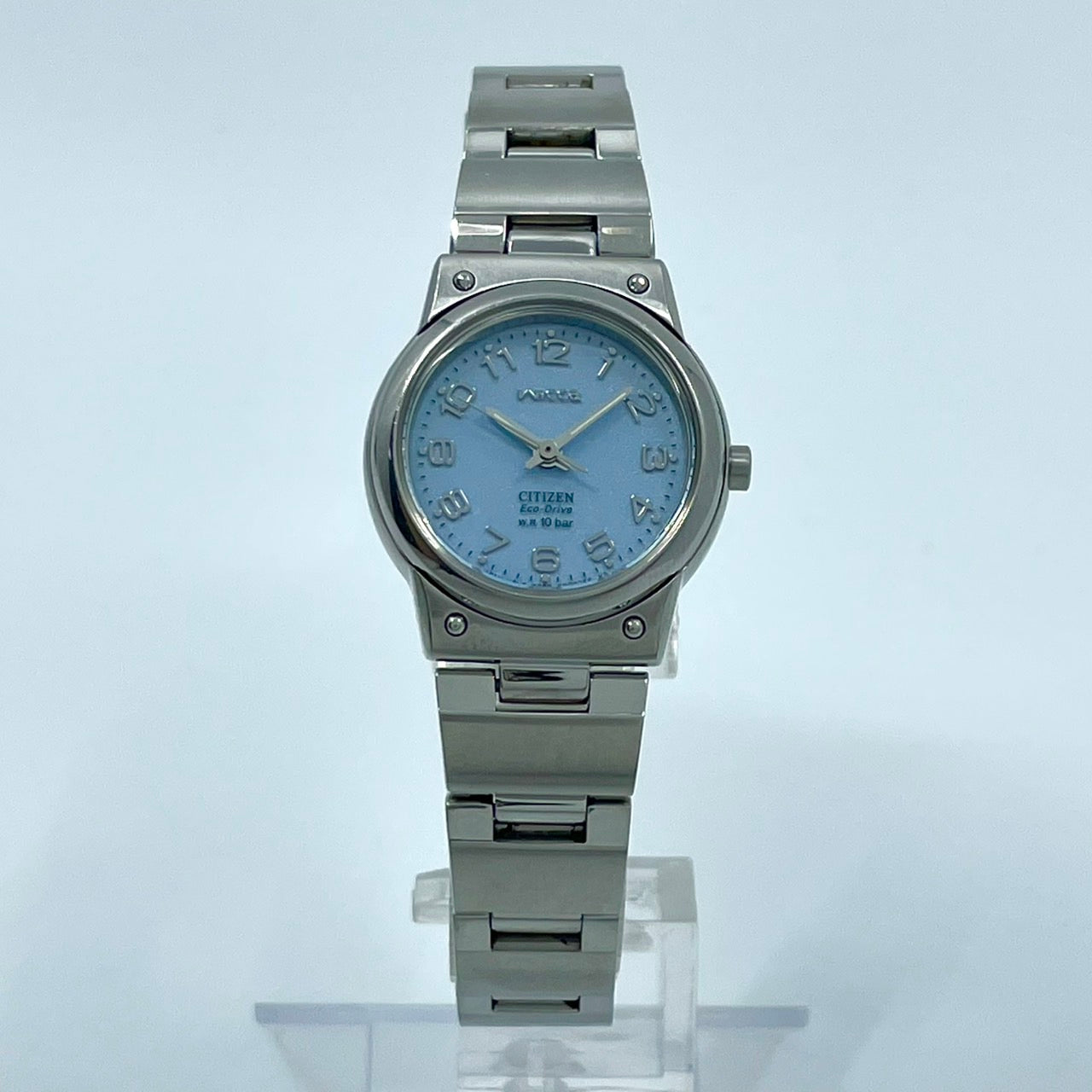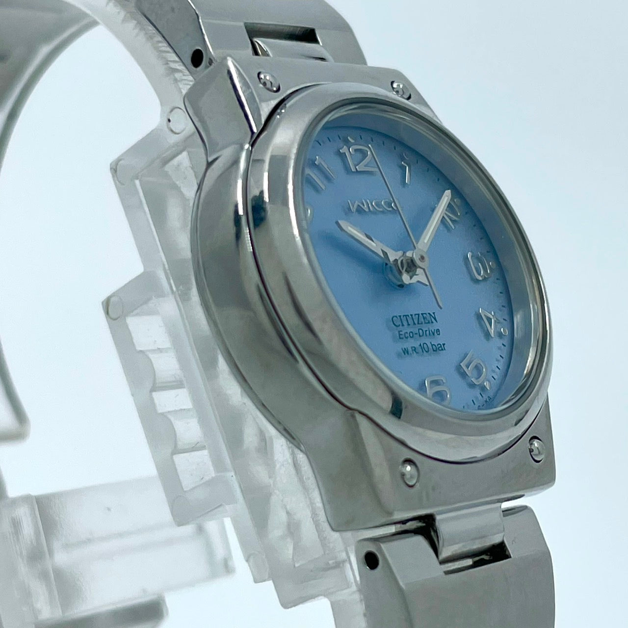 【稼働品】シチズン ウィッカ 腕時計 E030-S001935 エコドライブ レディース ソーラー ブルー文字盤 アナログ かわいい フェミニン カジュアル ビジネス オフィス 人気モデル 10気圧防水 シルバー 洗練デザイン クリーニング済み G4