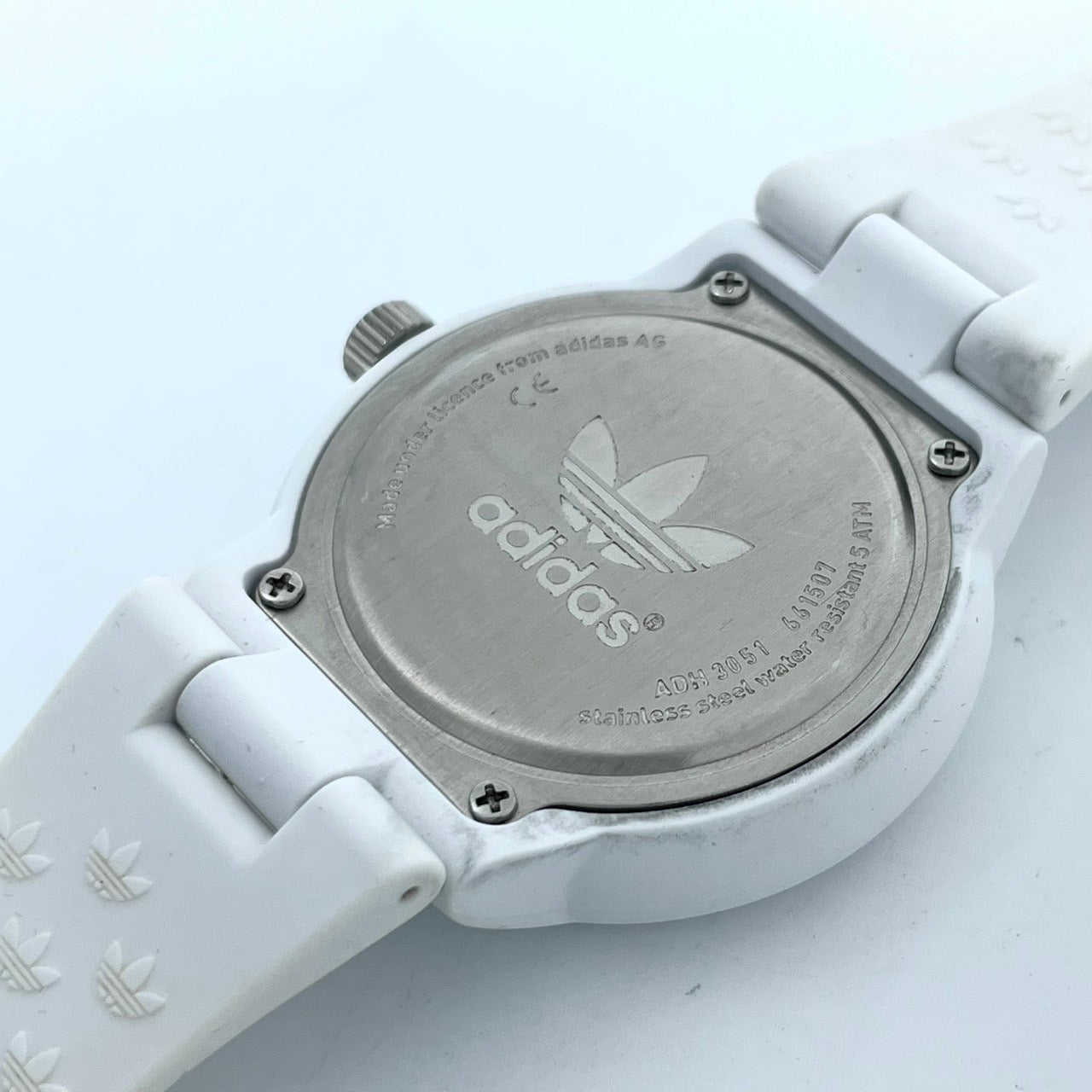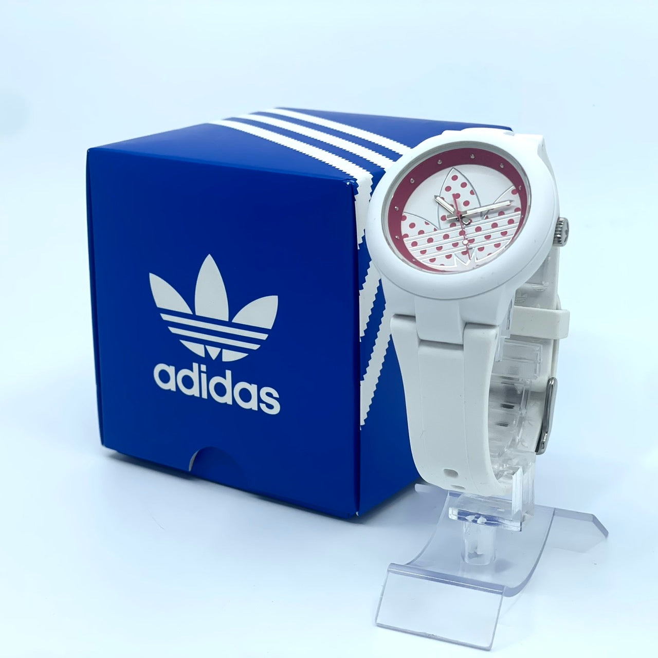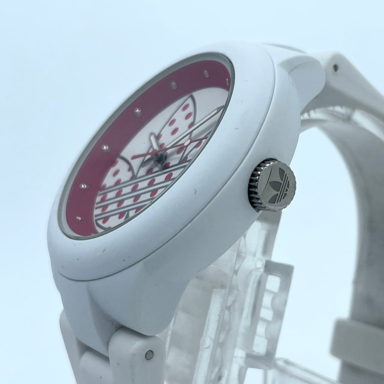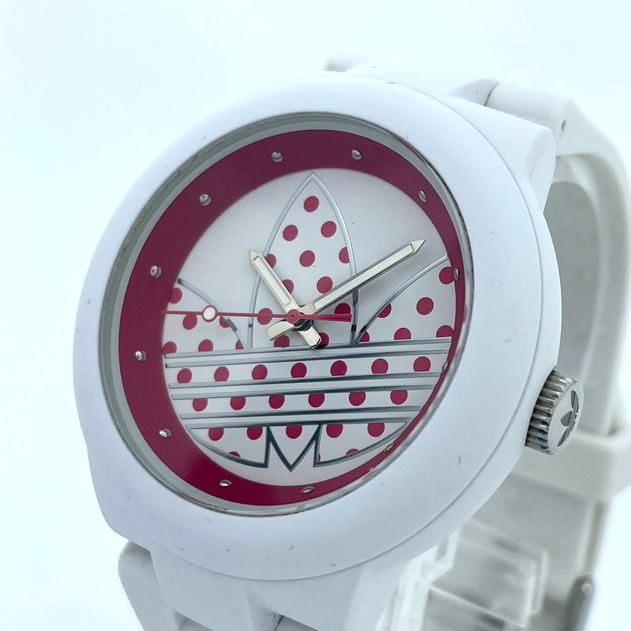 【電池交換済】アディダス 腕時計 ADH3051 ユニセックス クオーツ アナログ ラウンド ホワイト レッド ドット柄 ポップ トレフォイル ビッグロゴ ストリート カジュアル ファッションウォッチ スポーツウォッチ クリーニング済み G