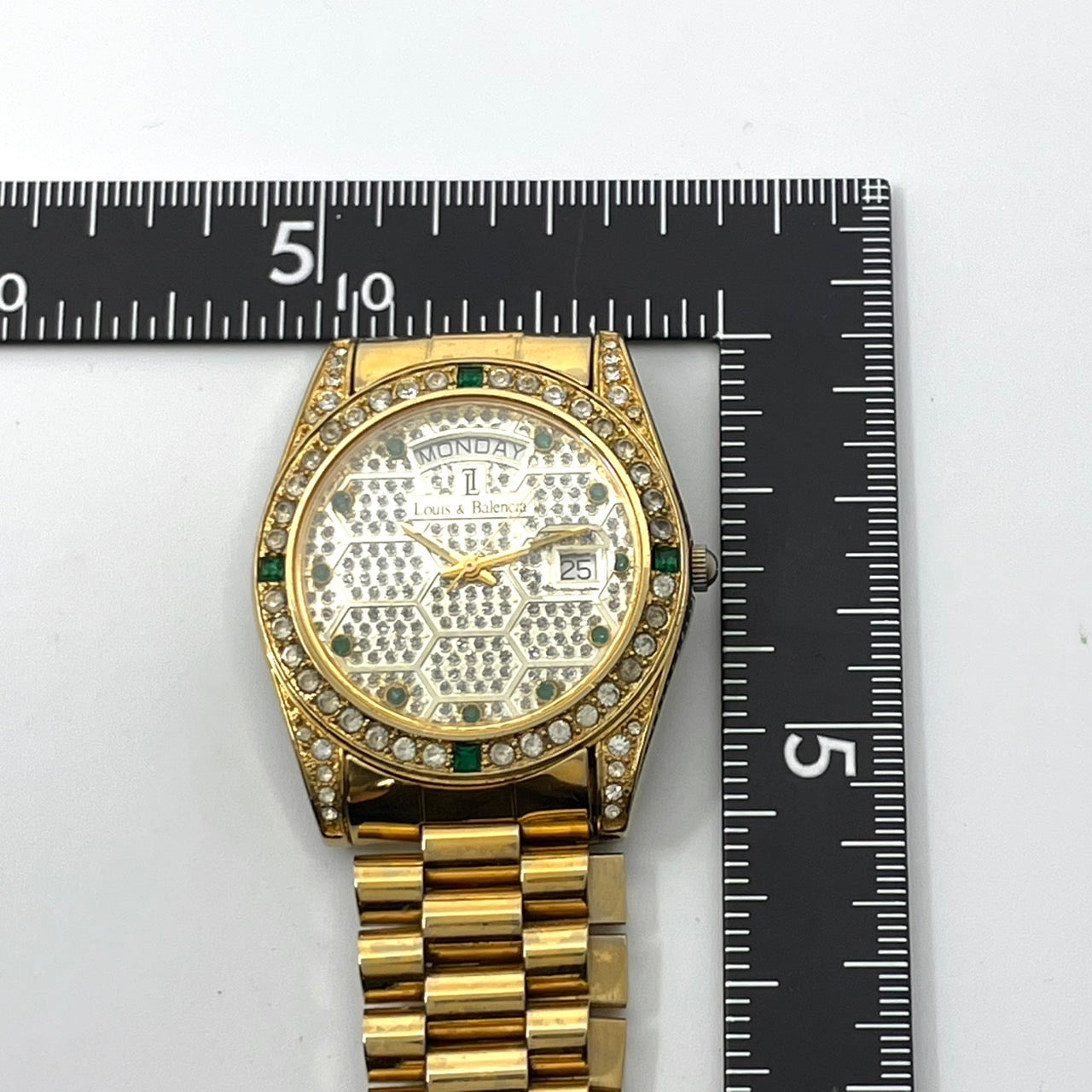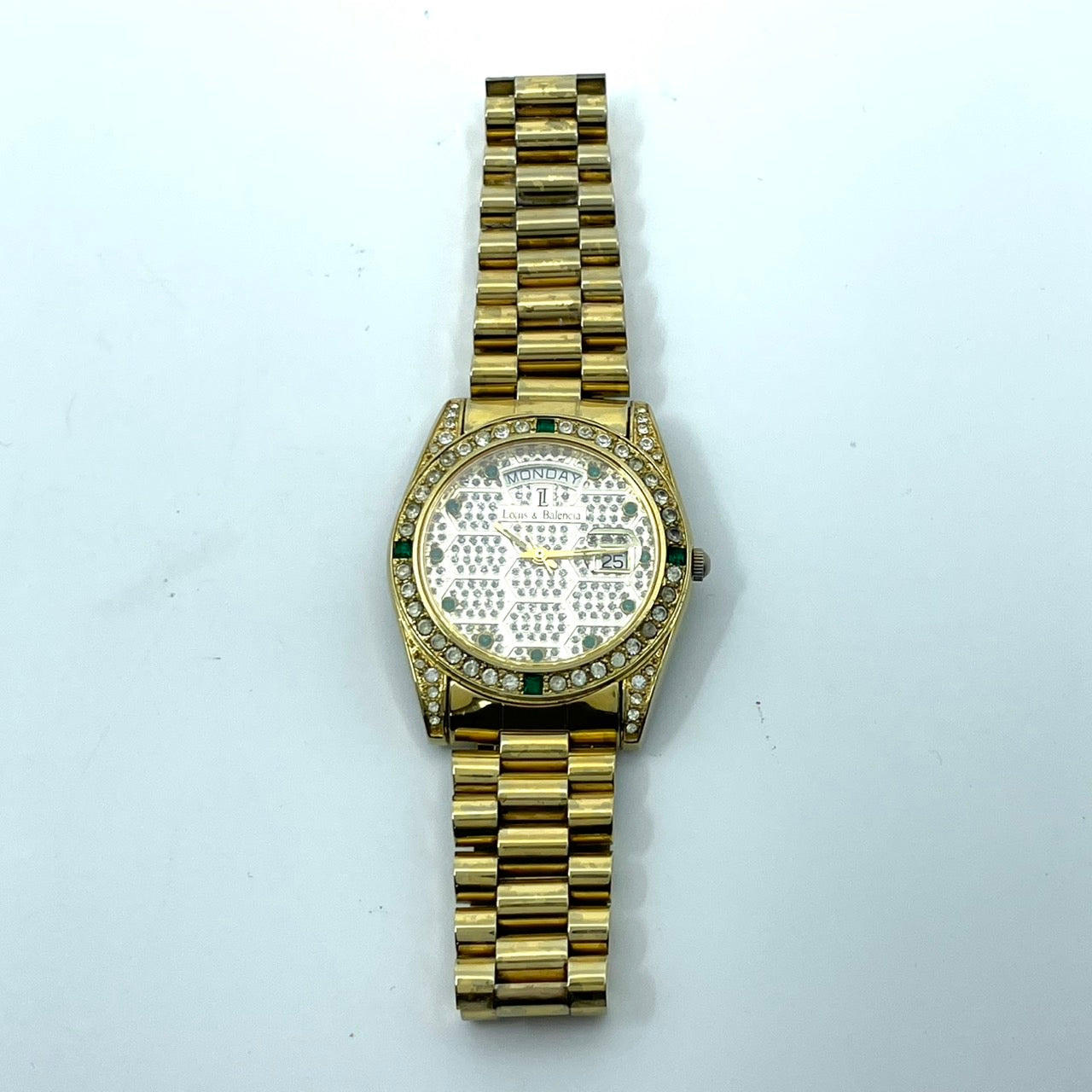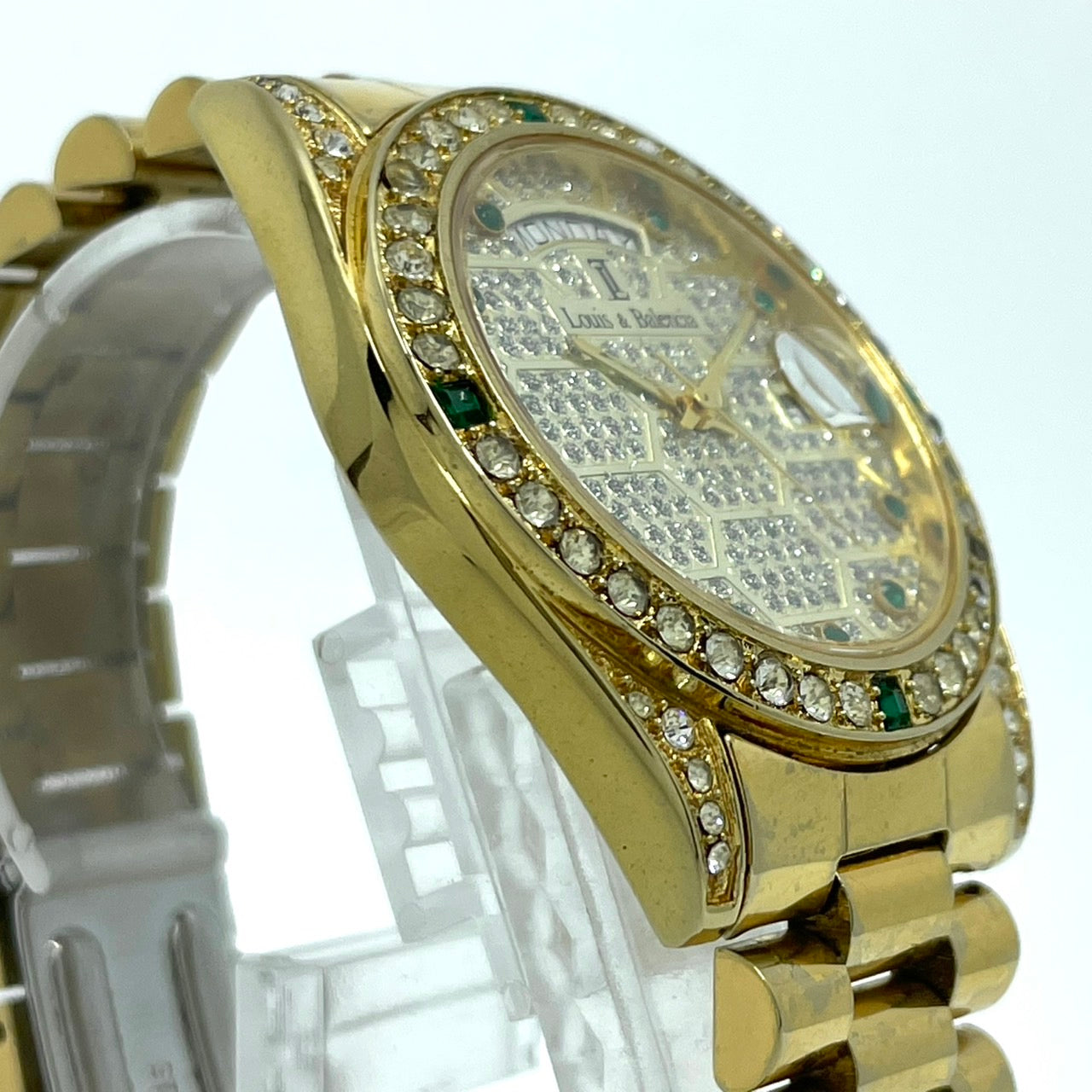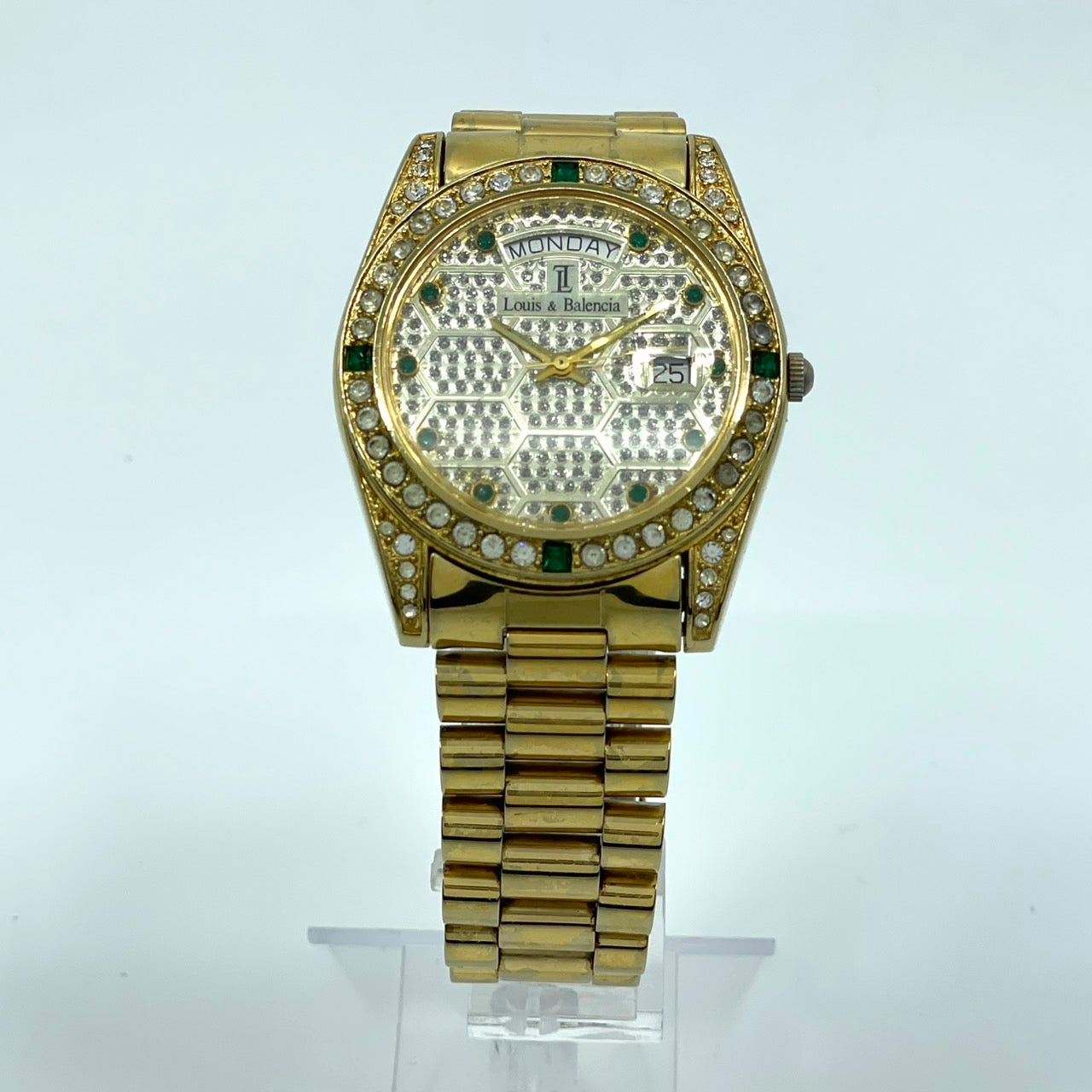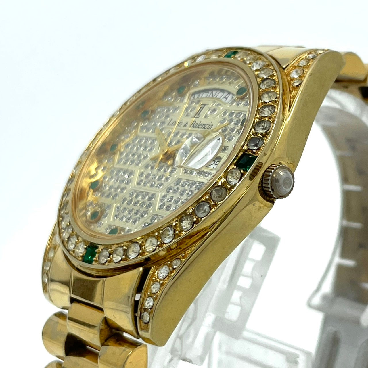 【電池交換済】Louis & Balencia ルイスアンドバレンシア レディース腕時計 クオーツ ゴールド ラインストーン エメラルド ハニカム文字盤 デイデイト カレンダー アナログ ゴージャス エレガント クラシックデザイン クリーニング済 G4