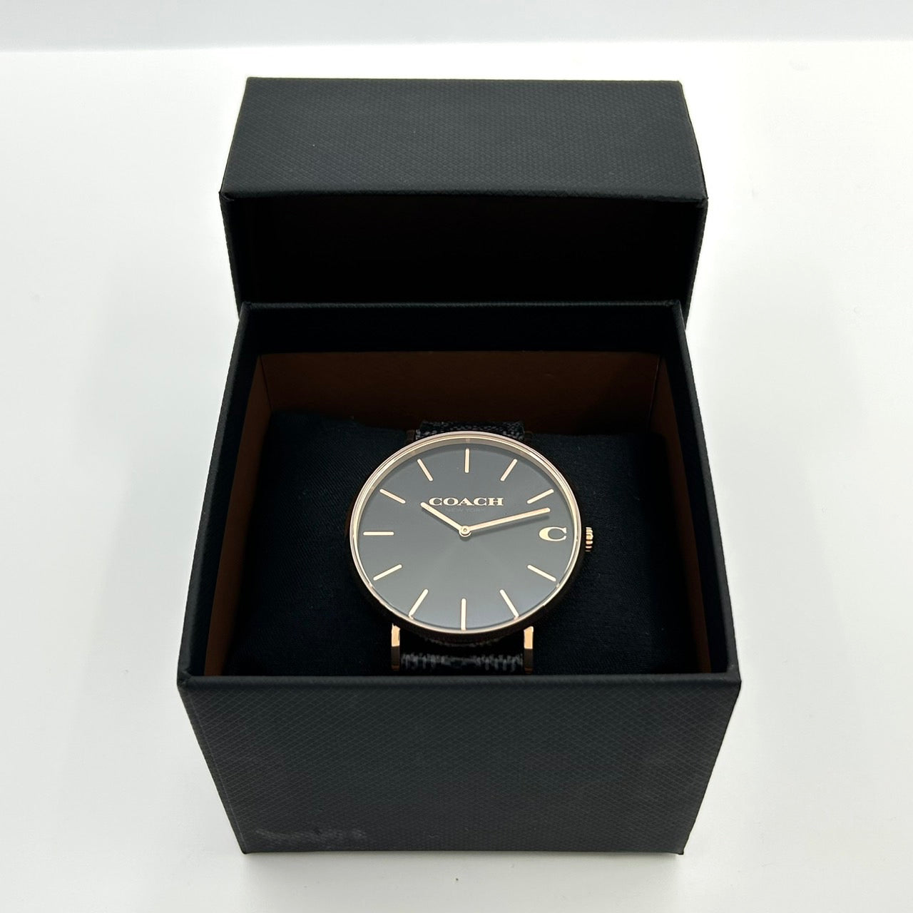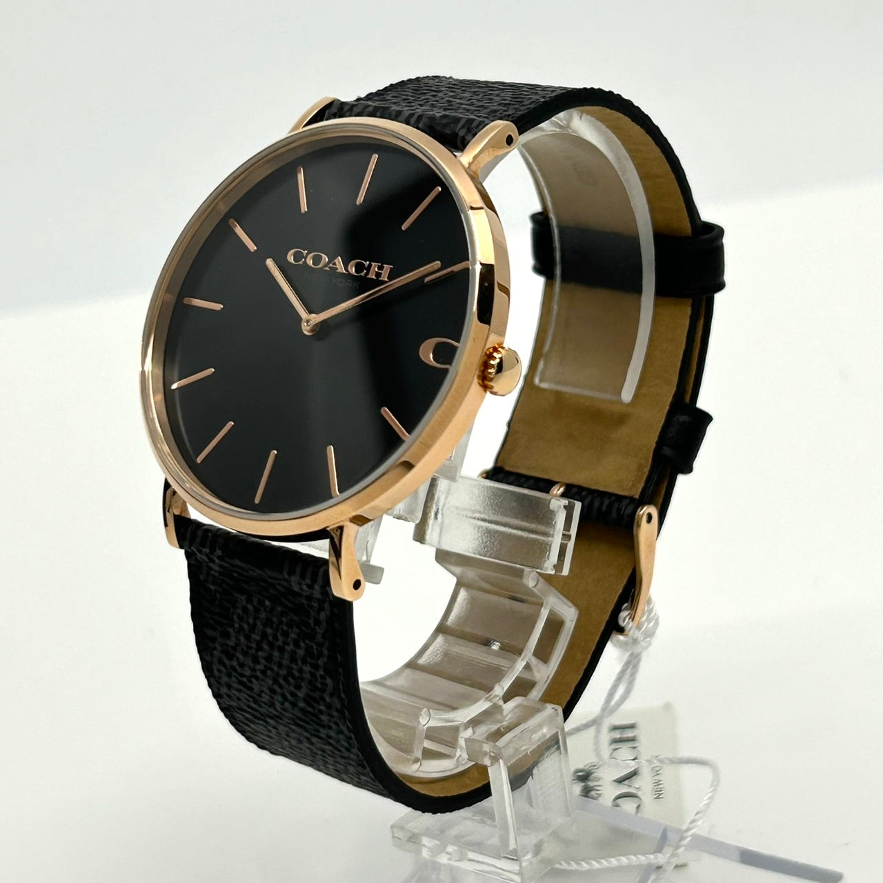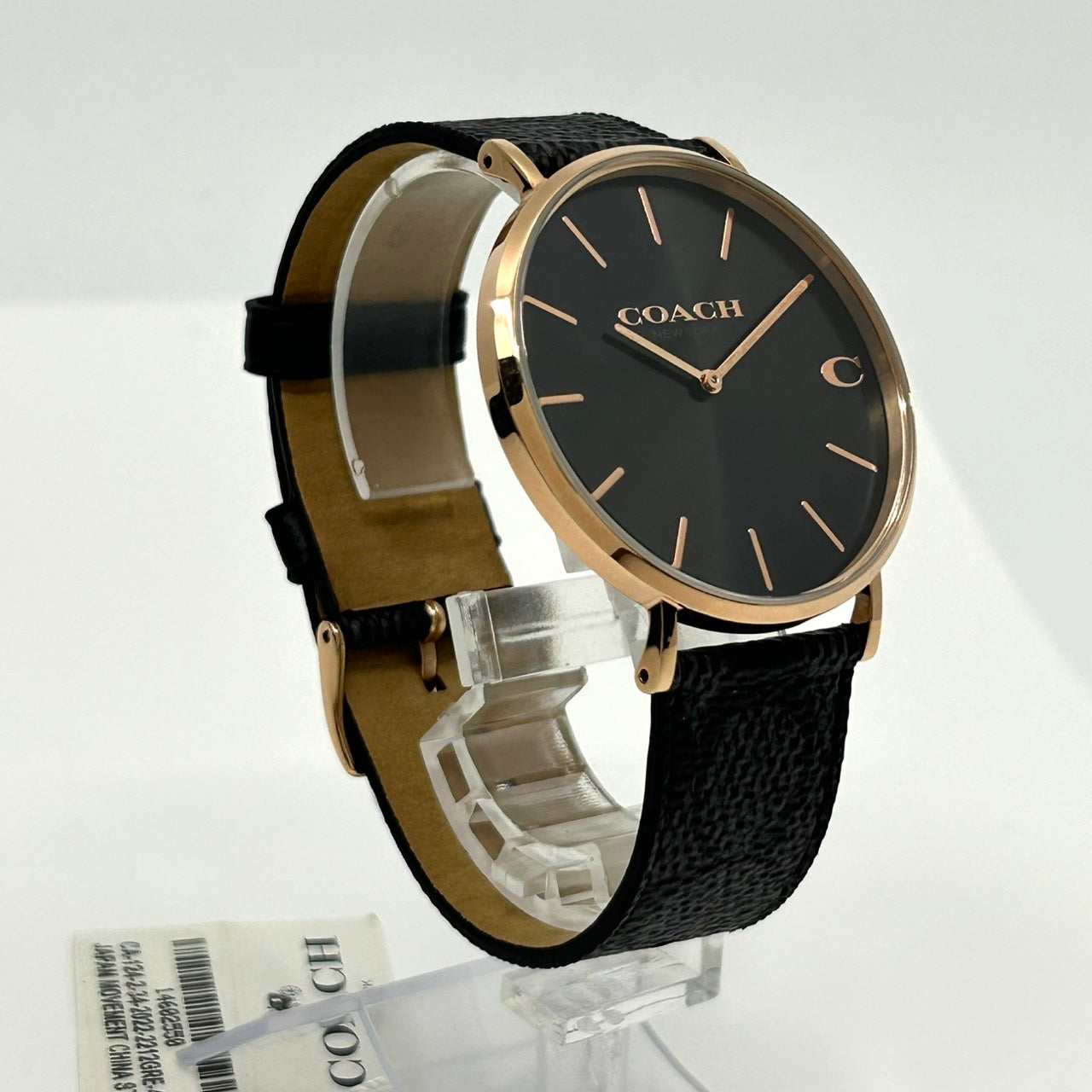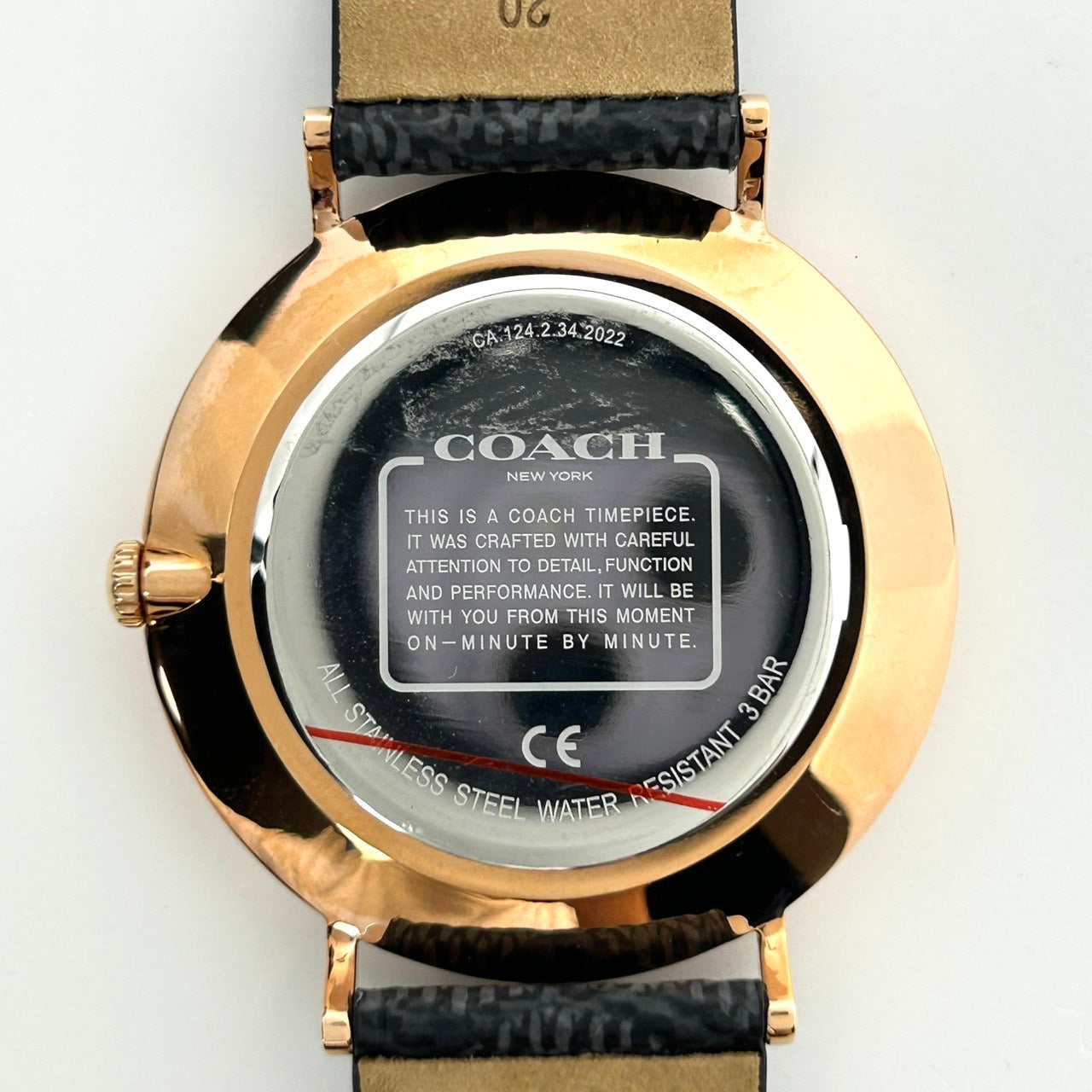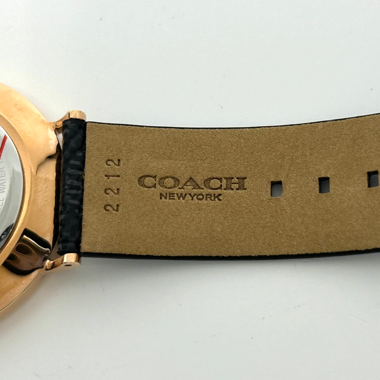 【電池交換済/未使用級/箱付】COACH コーチ PERRY ペリー レディース 腕時計 CA.124.2.34.2022 クオーツ アナログ ブラック文字盤 ローズゴールド 黒革ベルト クラシック ドレスウォッチ ビジネス フォーマル クリーニング済 G