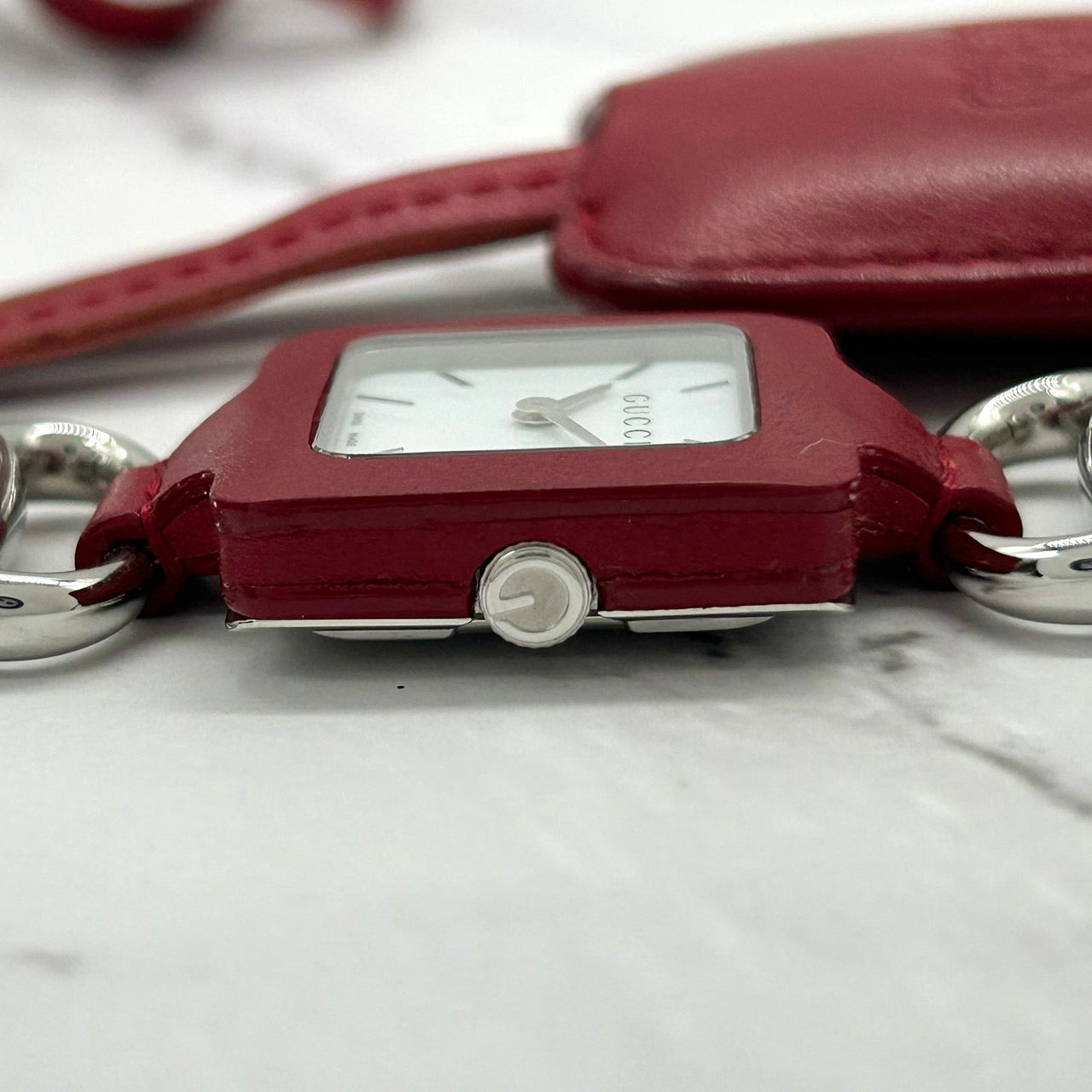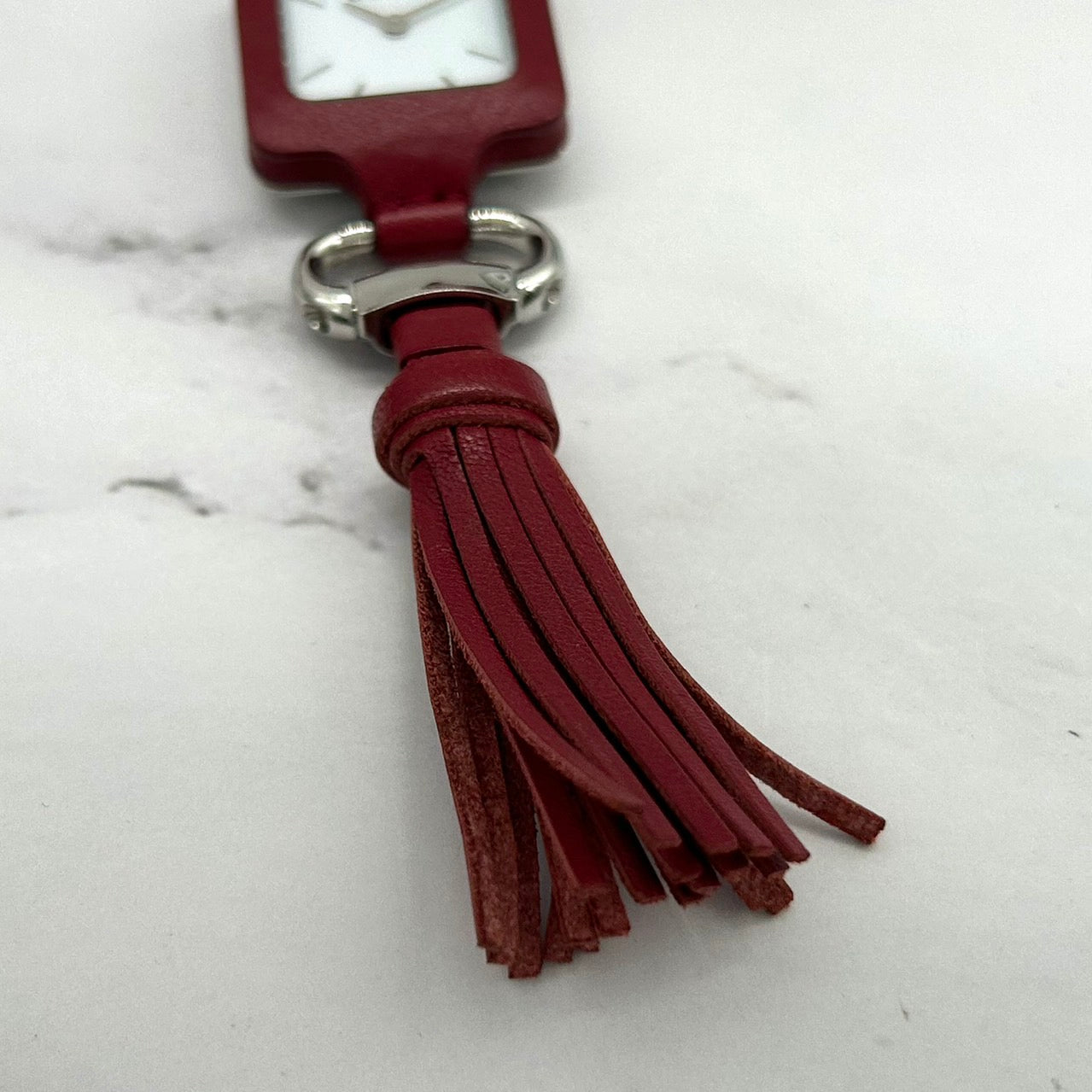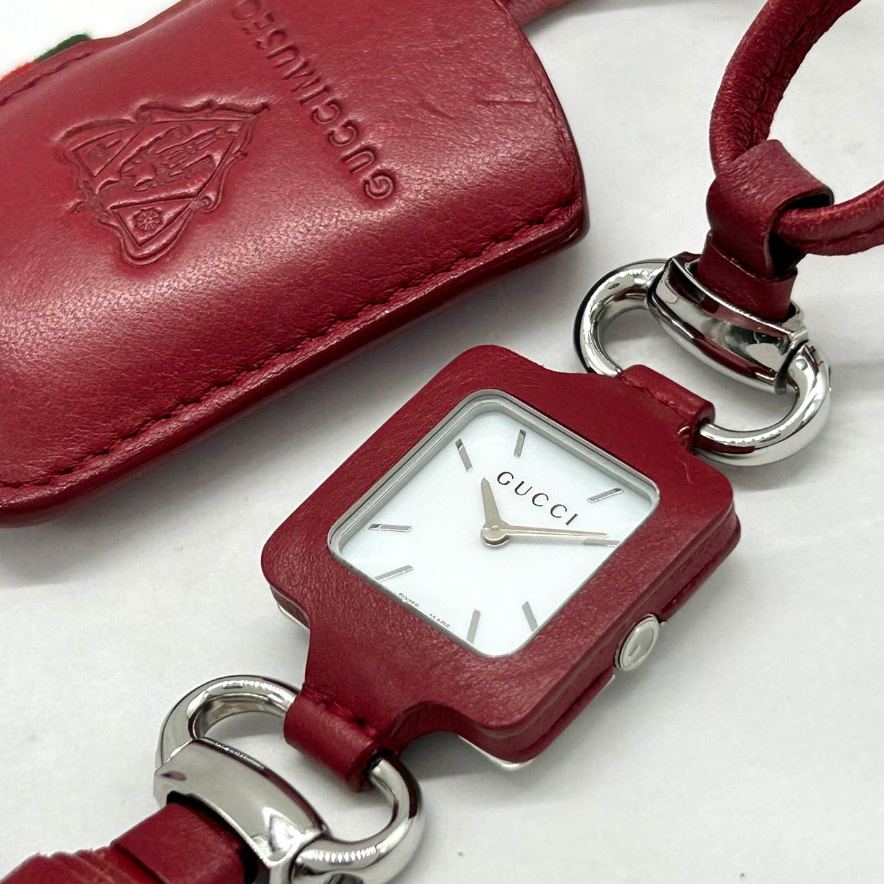極美品 電池交換済 希少 GUCCI グッチ GUCCIMUSEO グッチミュゼオ 130.5 バッグチャームウォッチ レッドレザー スクエア レディース クオーツ 限定モデル エレガント スタイリッシュ ハングウォッチ フリンジ クリーニング済 G6
