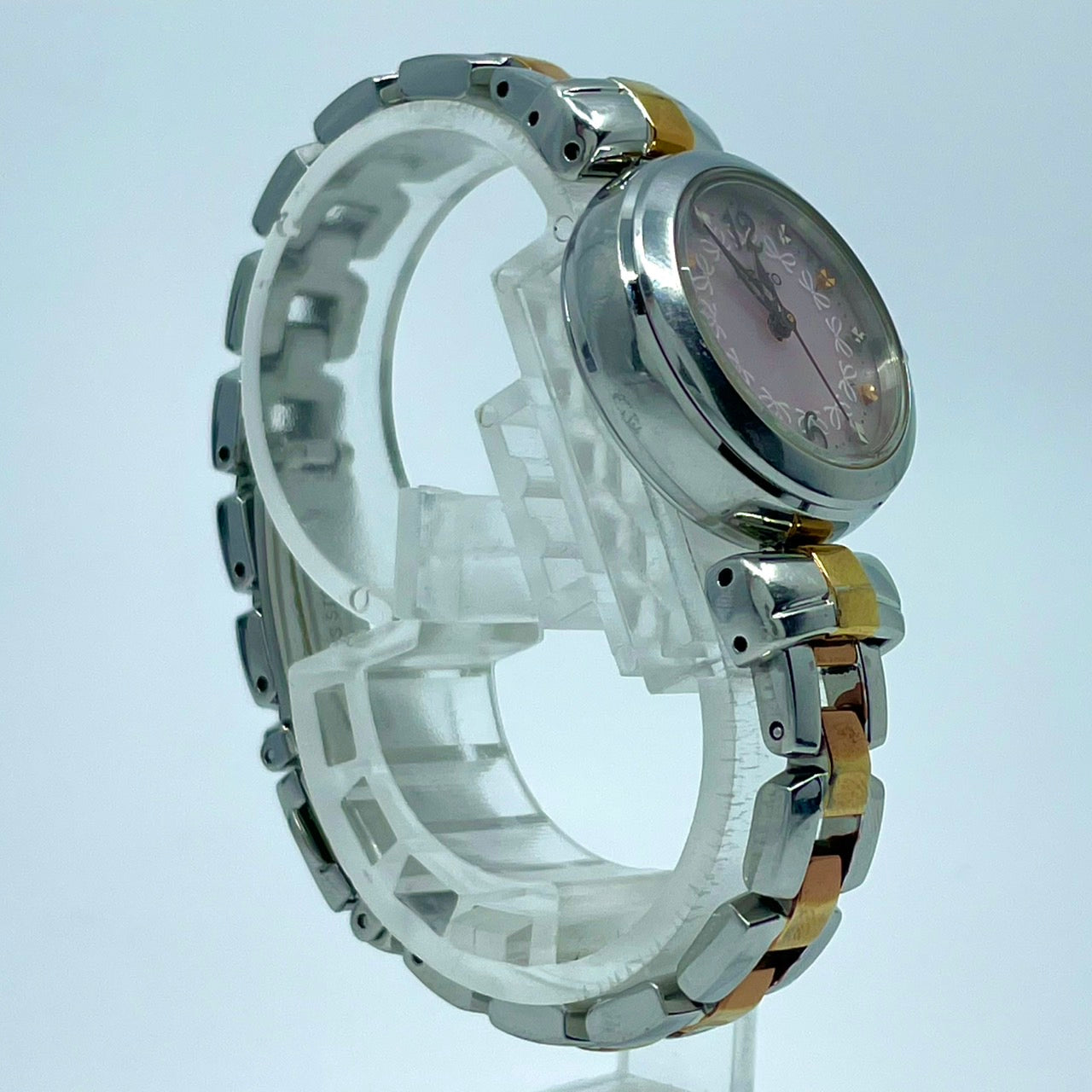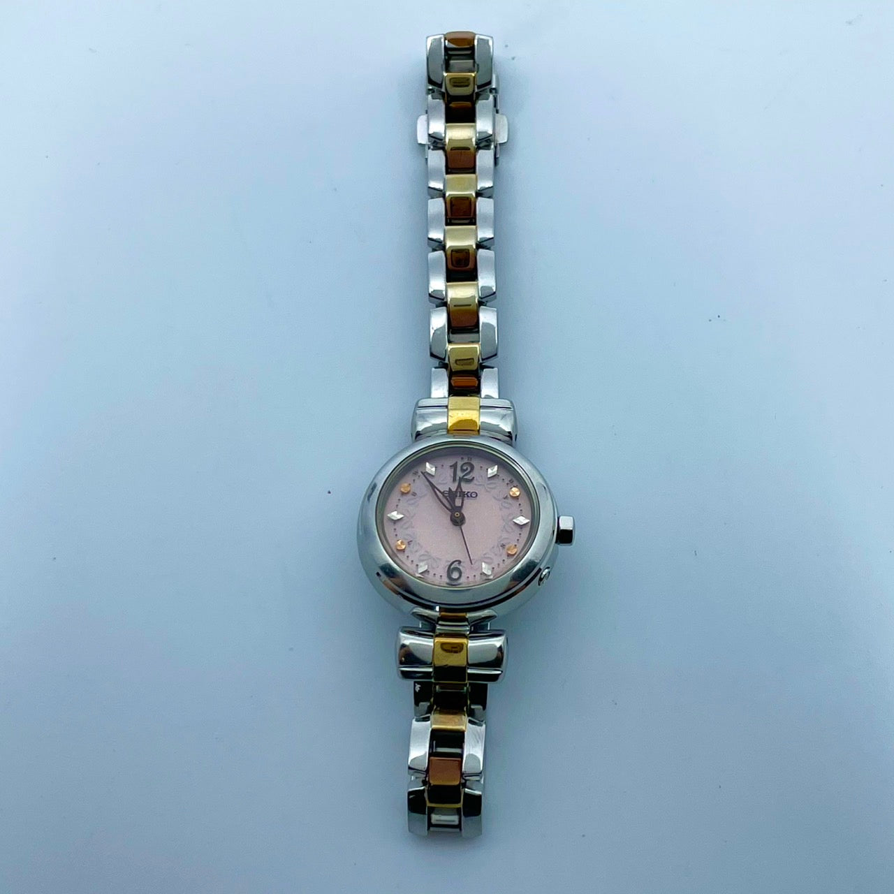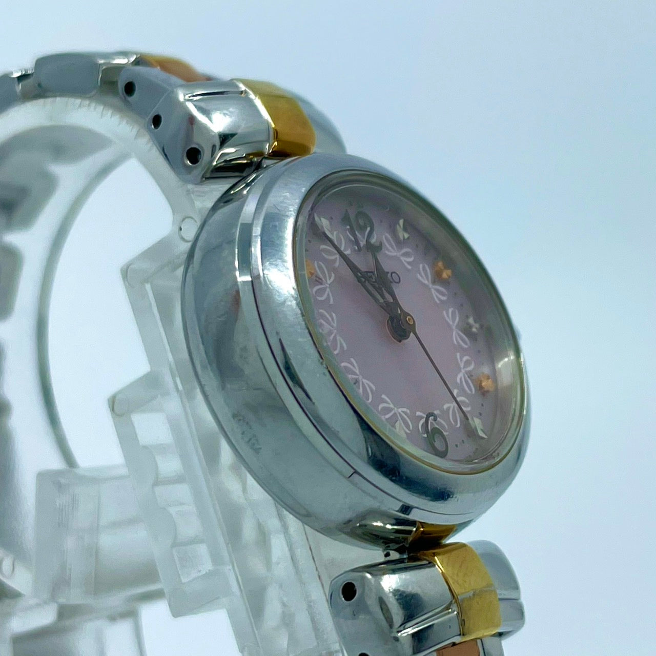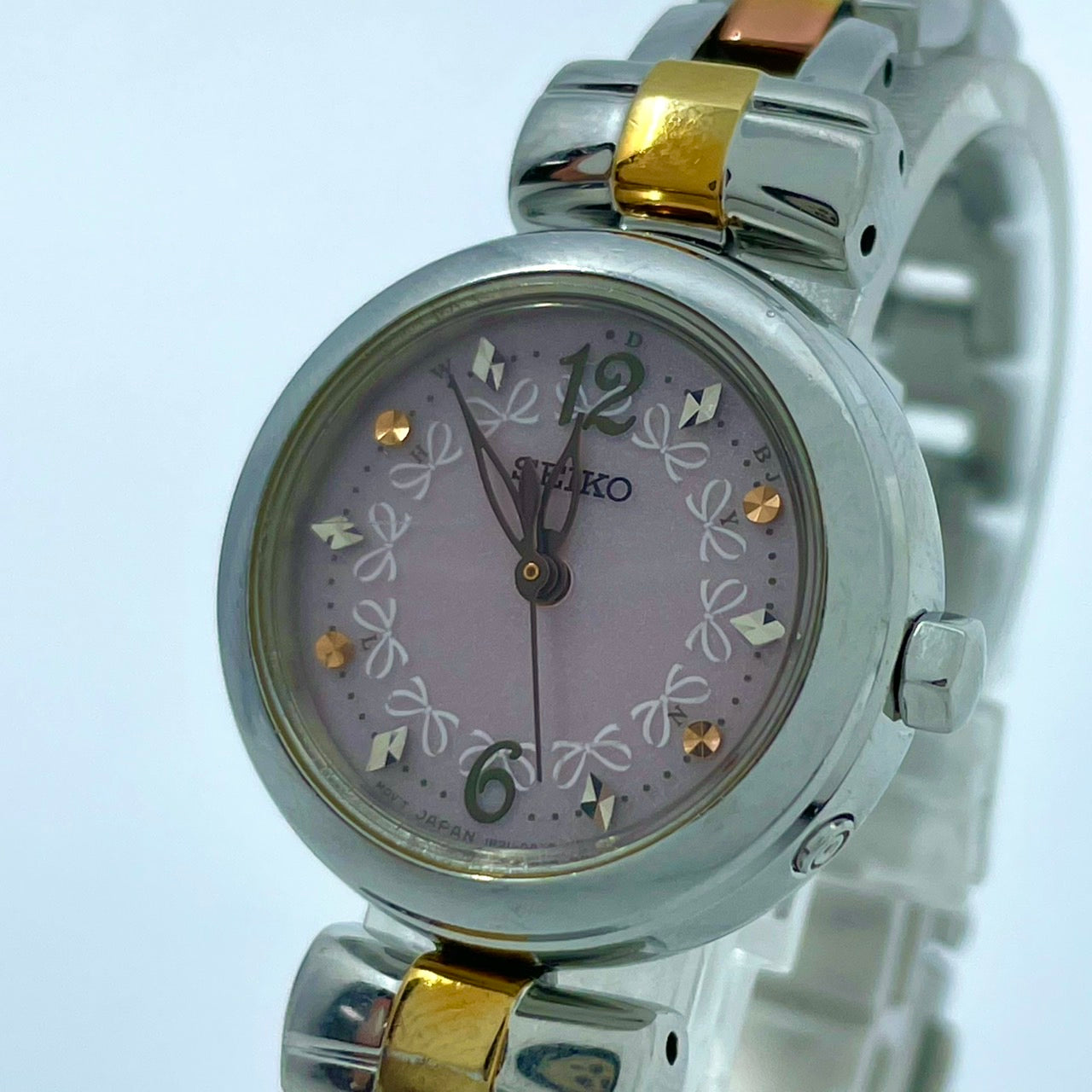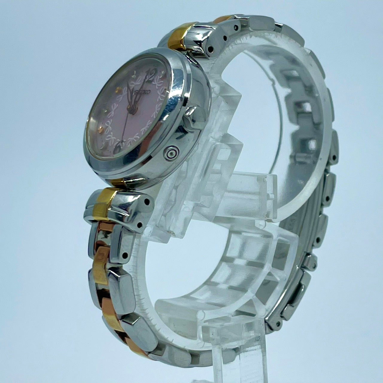 【稼働品/美品】セイコー 腕時計 1B21-0AK0 レディース 電波ソーラー ピンク文字盤 リボン柄 シルバー ゴールド コンビカラー アナログ ラウンド フェミニン エレガント かわいい ビジネス オフィス クリーニング済み G5