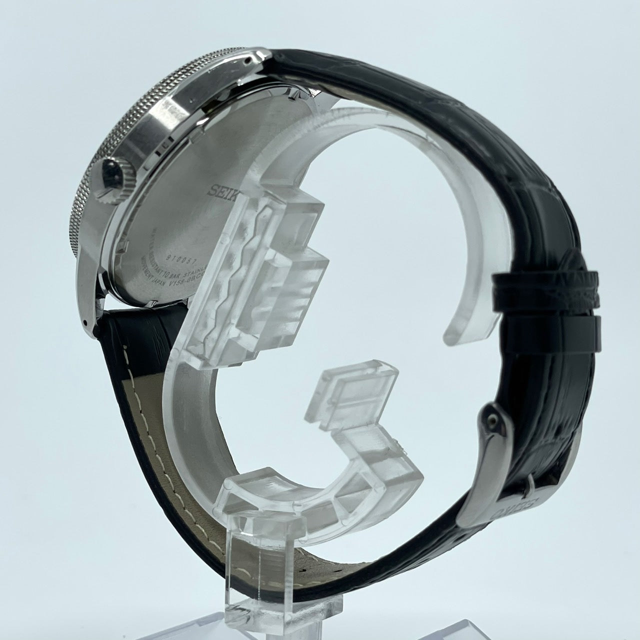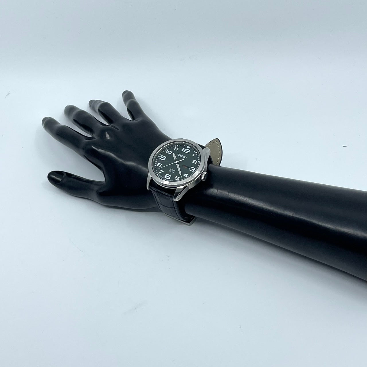 【新品ベルト交換済/稼働品】SEIKO セイコー 腕時計 V158-0BC0 メンズ ソーラー アナログ ラウンド グリーン文字盤 100M防水 デイデイト表示 シルバーケース ブラックレザーベルト(社外品) カジュアル ビジネス クリーニング済み G5