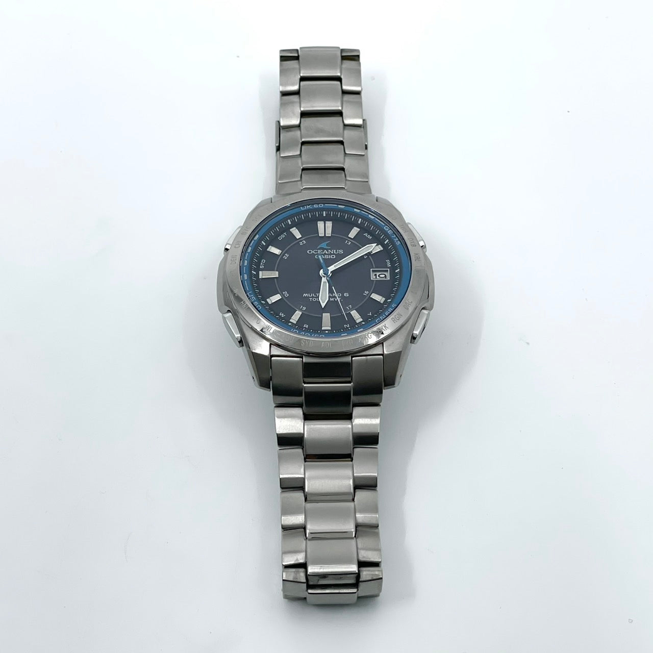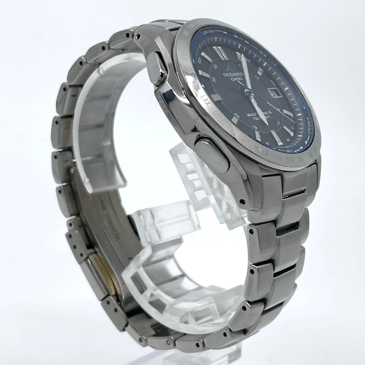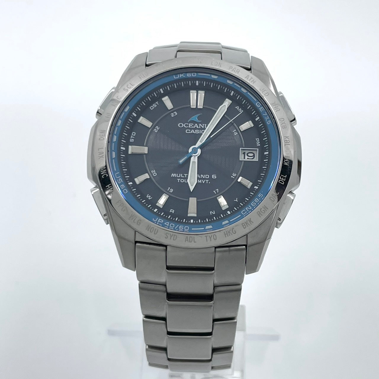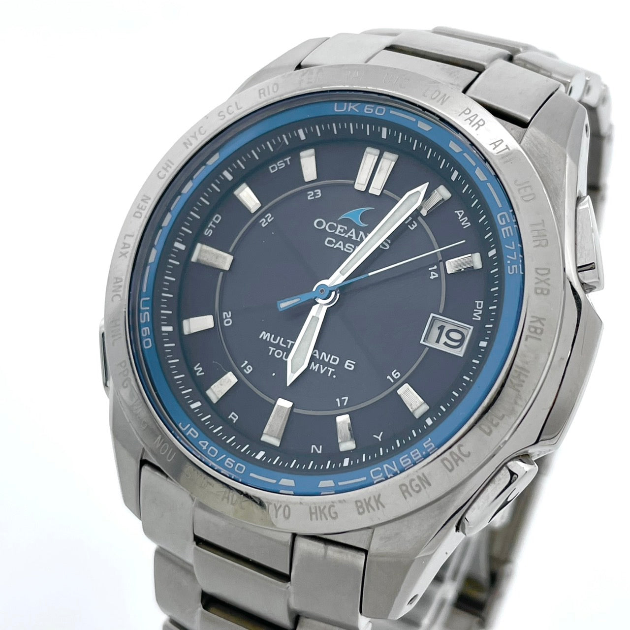 【稼働品/美品】カシオ オシアナス 腕時計 OCW-T100 メンズ 電波ソーラー チタンモデル タフソーラー MULTI BAND 6 アナログ デイト カレンダー シルバー ネイビー文字盤 ブルーベゼル ビジネス 高機能 箱付き クリーニング済み G