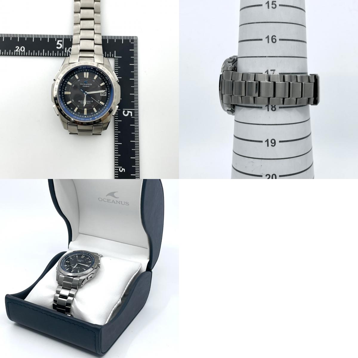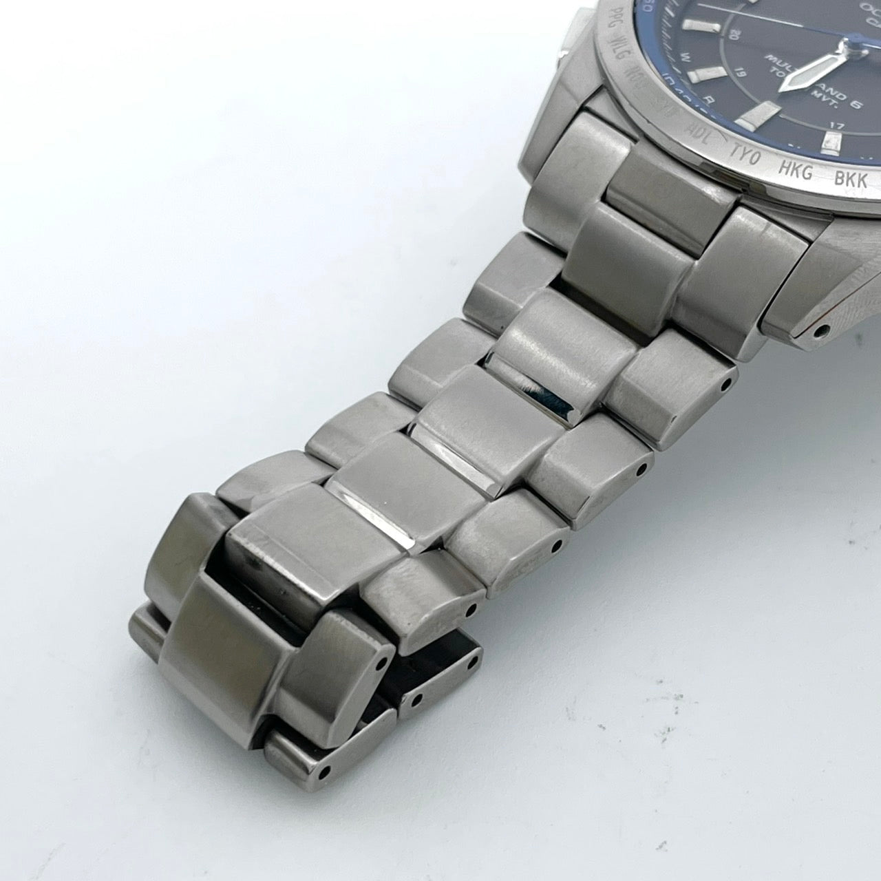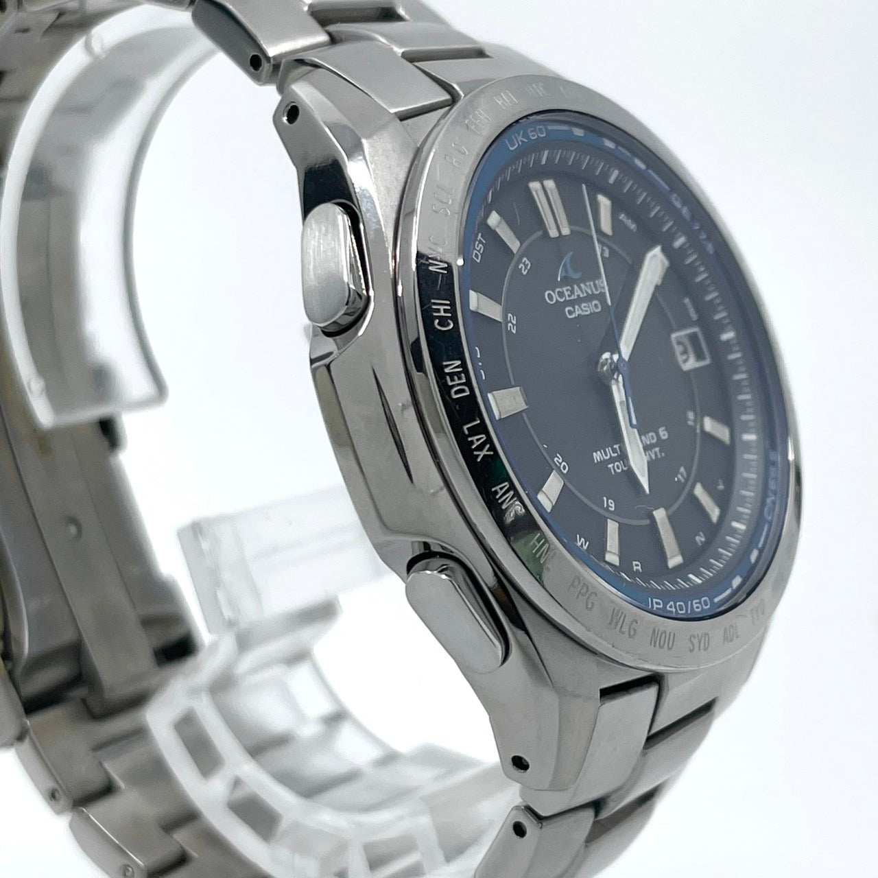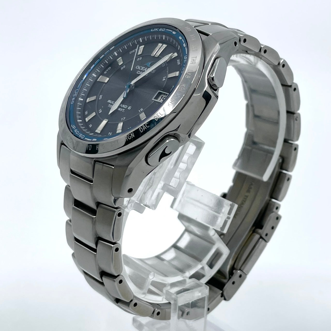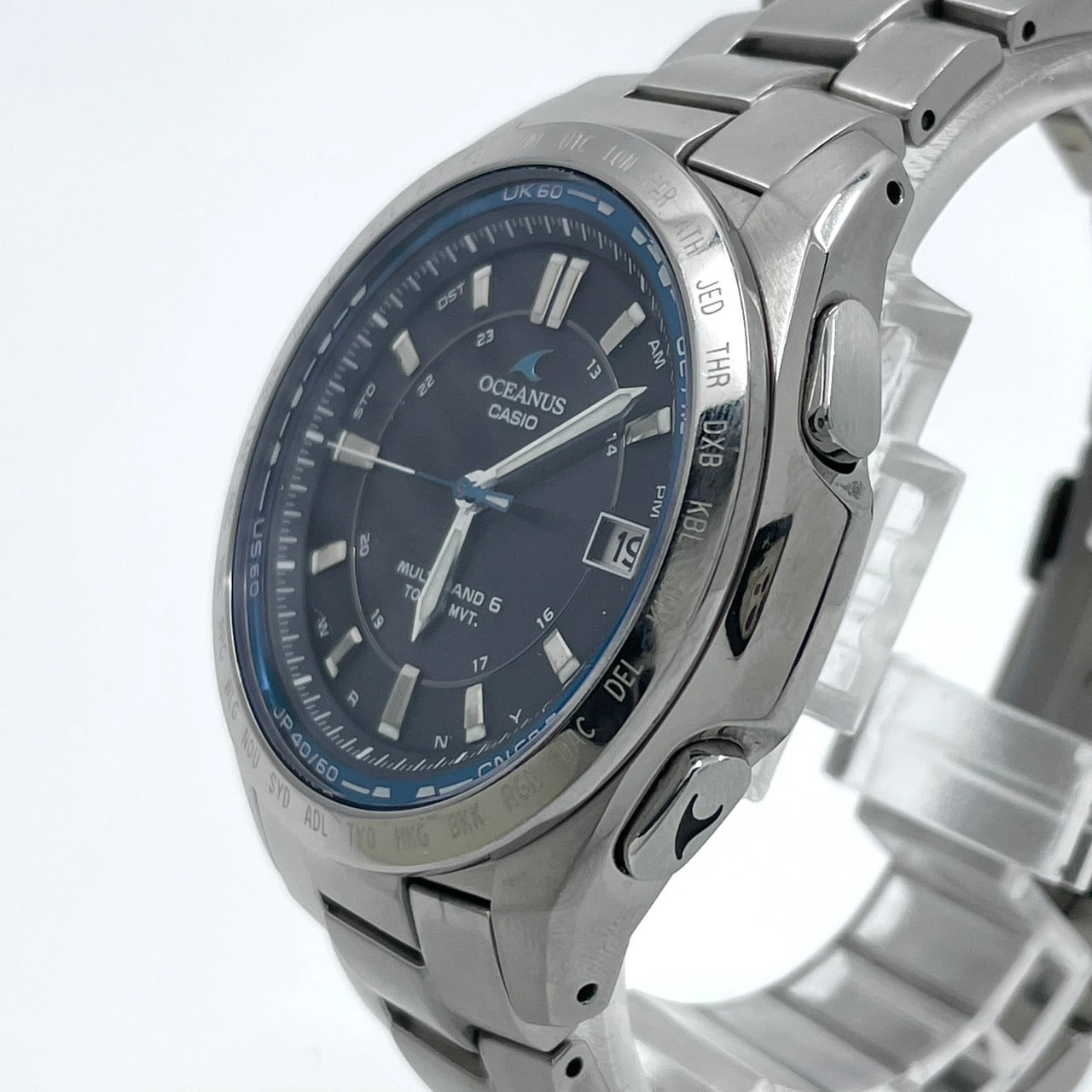 【稼働品/美品】カシオ オシアナス 腕時計 OCW-T100 メンズ 電波ソーラー チタンモデル タフソーラー MULTI BAND 6 アナログ デイト カレンダー シルバー ネイビー文字盤 ブルーベゼル ビジネス 高機能 箱付き クリーニング済み G