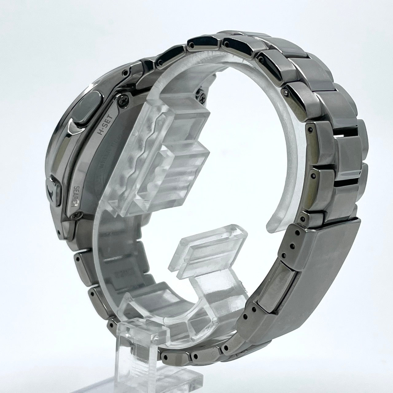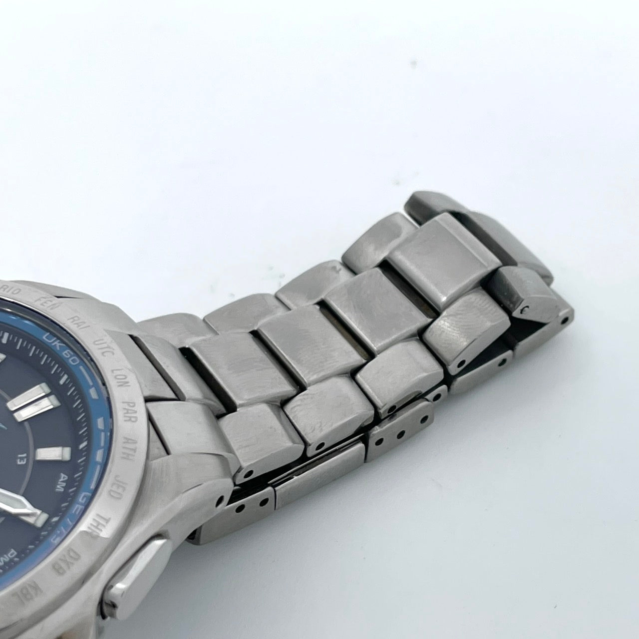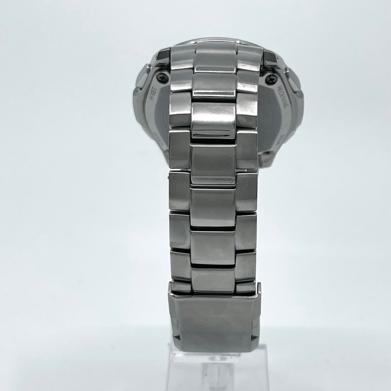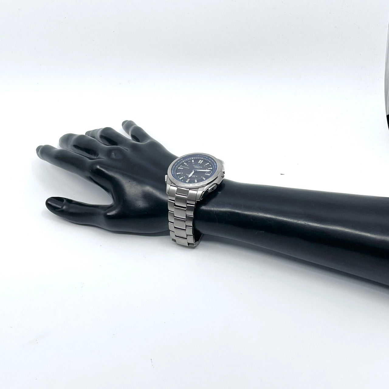 【稼働品/美品】カシオ オシアナス 腕時計 OCW-T100 メンズ 電波ソーラー チタンモデル タフソーラー MULTI BAND 6 アナログ デイト カレンダー シルバー ネイビー文字盤 ブルーベゼル ビジネス 高機能 箱付き クリーニング済み G