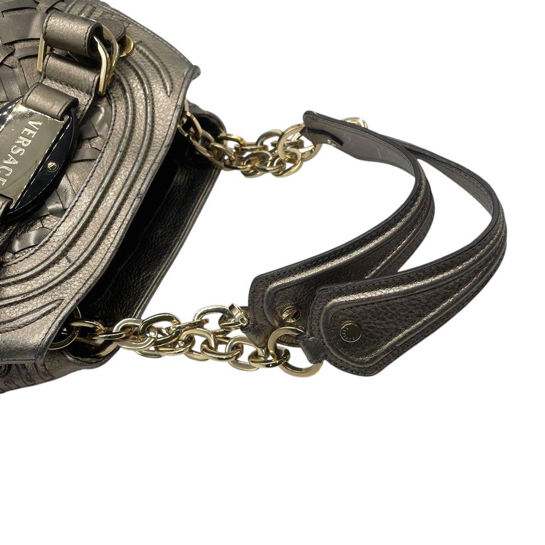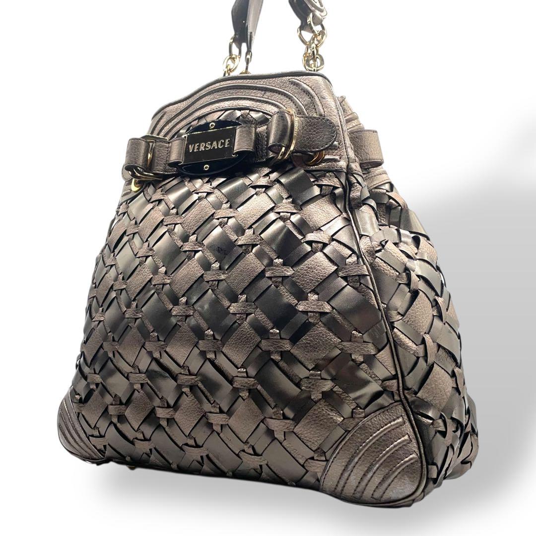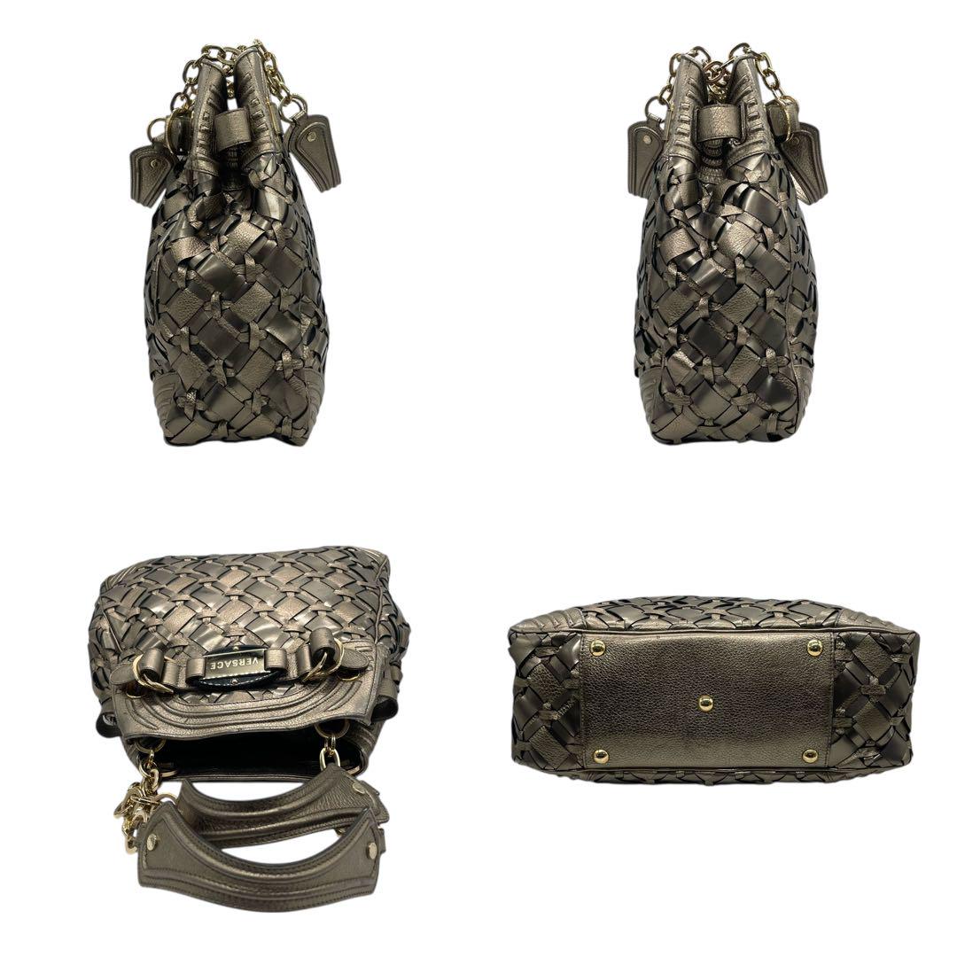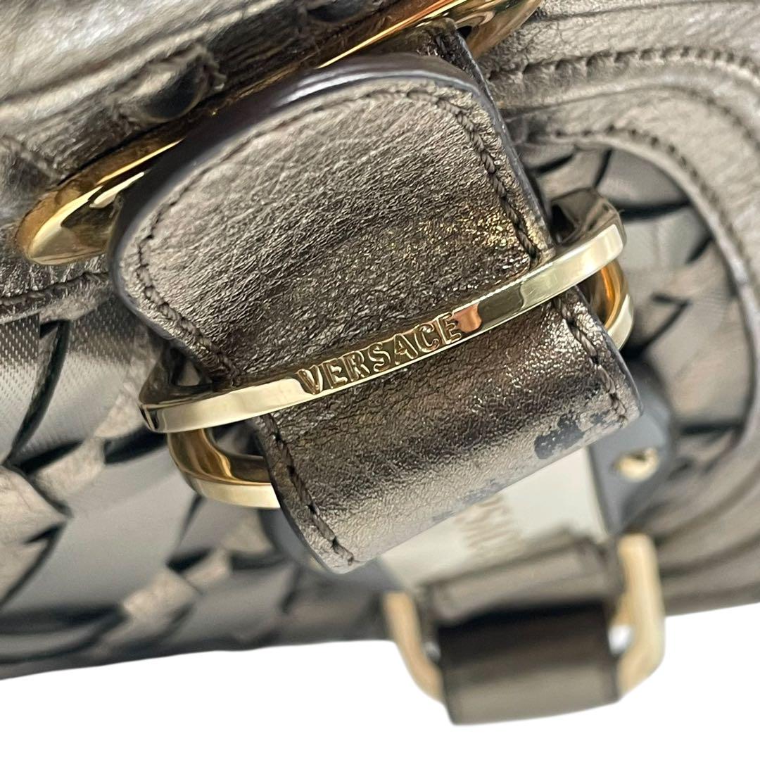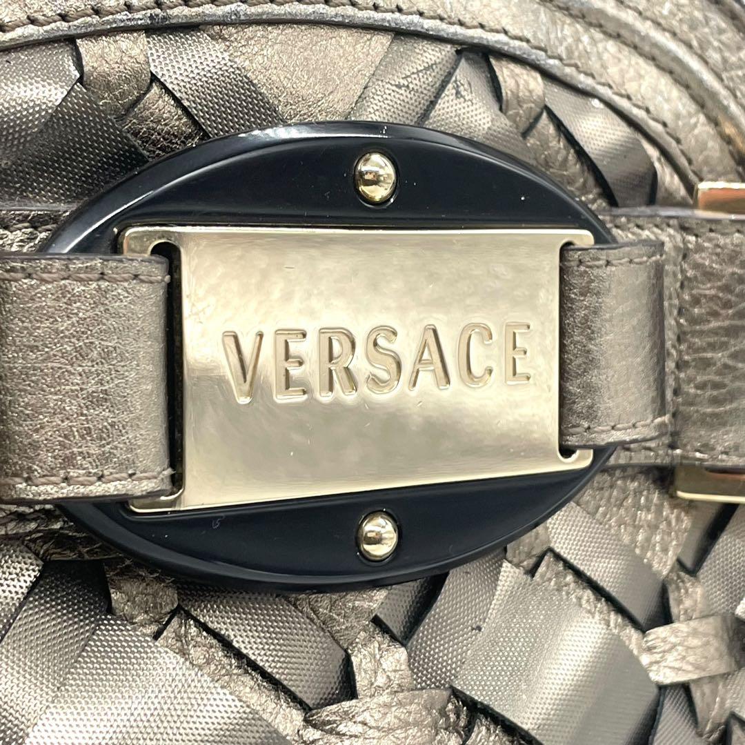 ヴェルサーチ トートバッグ グレー シルバー ブロンズ グラデーションカラー 編み込み レザー T5 肩掛け ワンショルダーバッグ ハンドバッグ ゴールド金具 ロゴ刻印 VERSACE