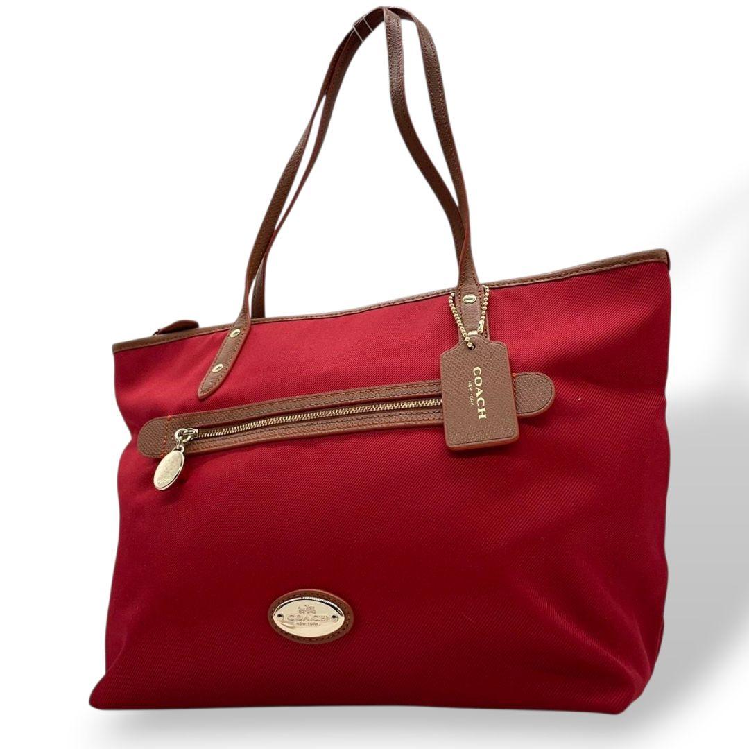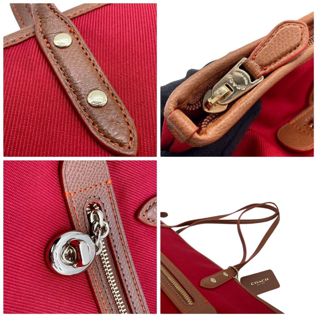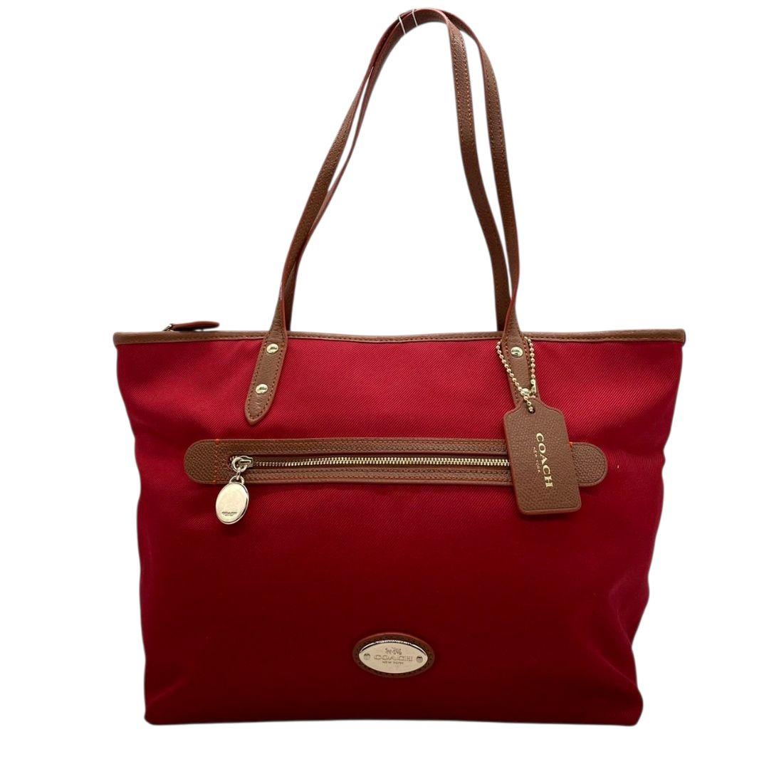 美品 コーチ トートバッグ 赤 A4収納 ワンショルダー キャンバス u16 ハンドバッグ 肩掛け可 肩かけ可 レッド レザー ゴールド金具 ロゴプレート ロゴタグ チャーム付き COACH F37237