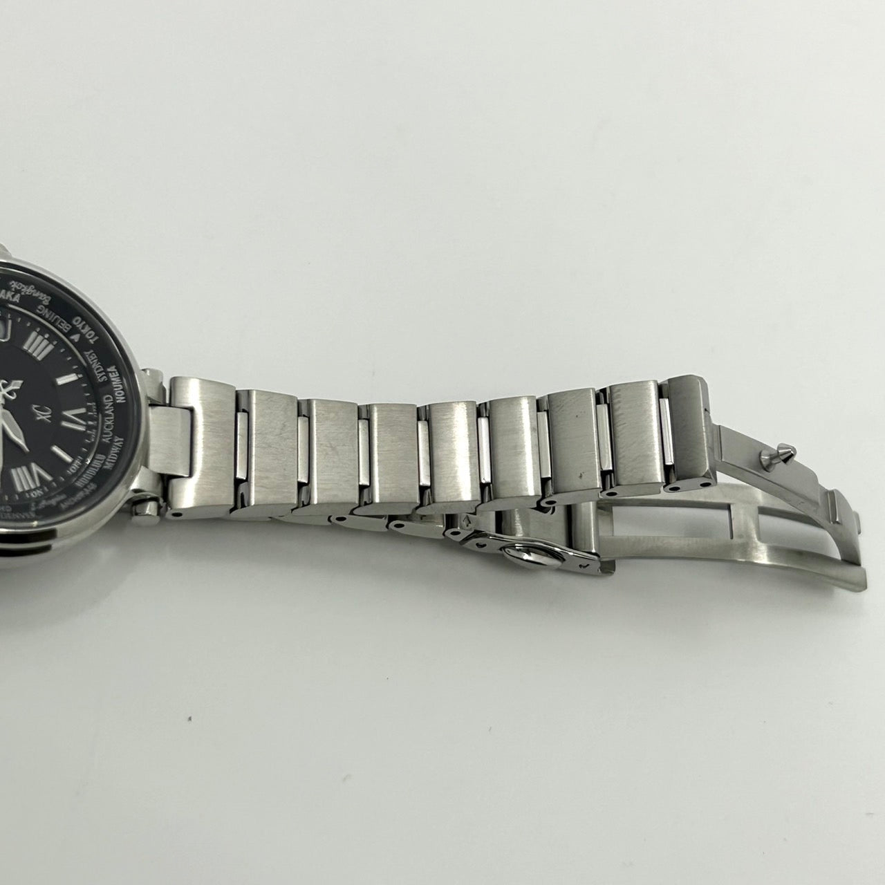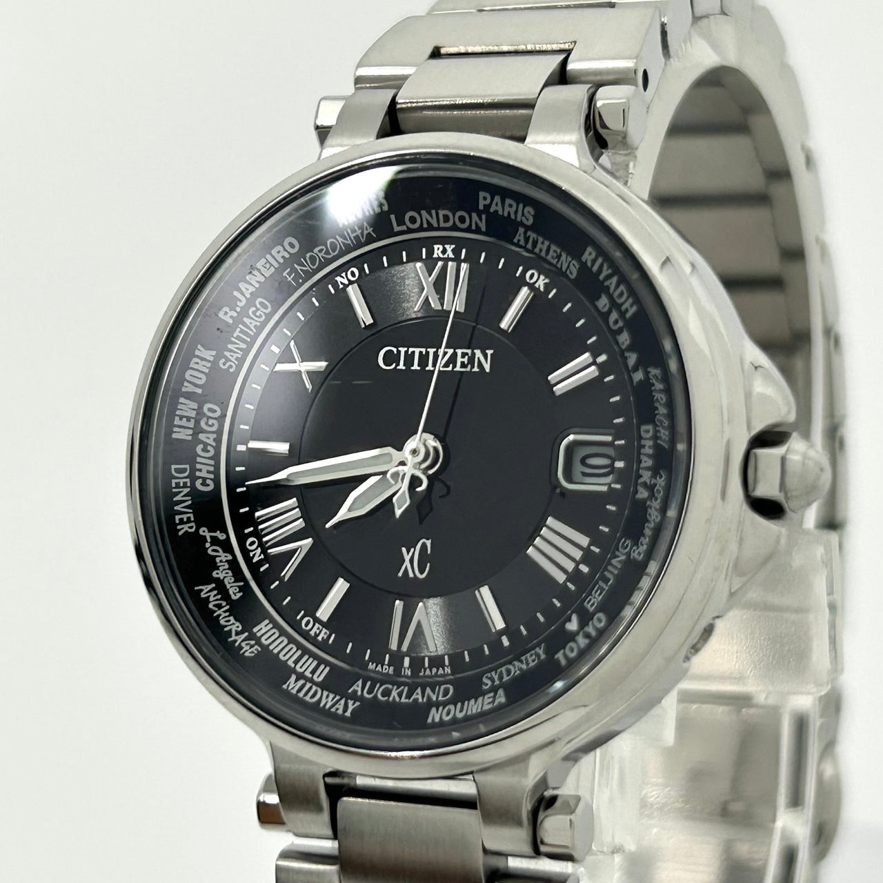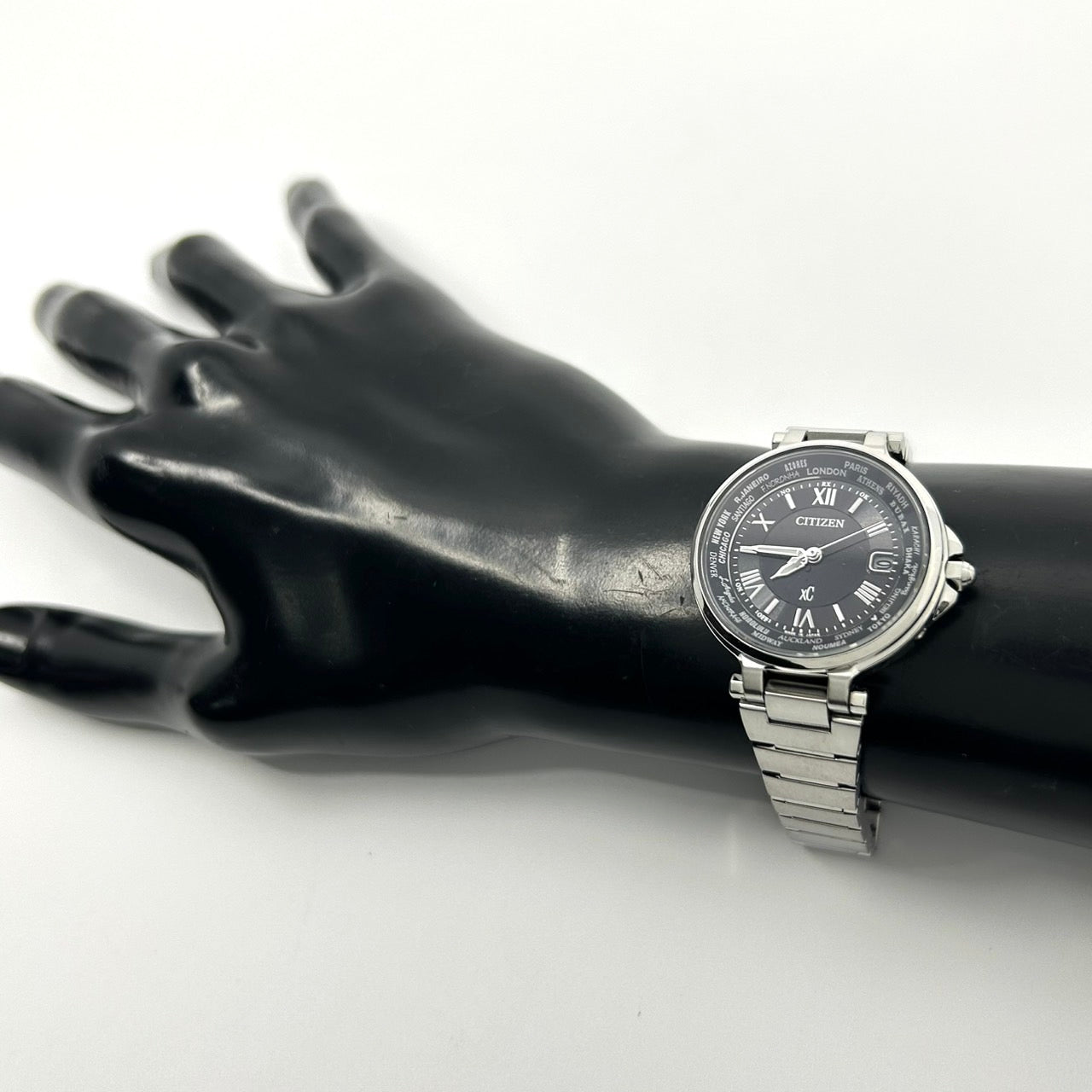 【美品】シチズン クロスシー xC 腕時計 レディース H246-T021820 エコドライブ 電波ソーラー ワールドタイム デイト アナログ 黒文字盤 シルバー ローマ数字 エレガント ビジネス オフィス カジュアル ドレスウォッチ G1