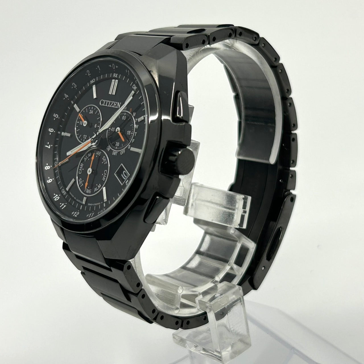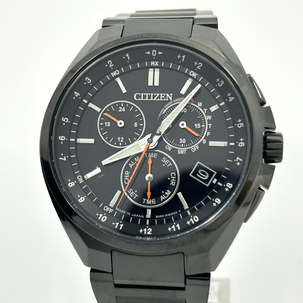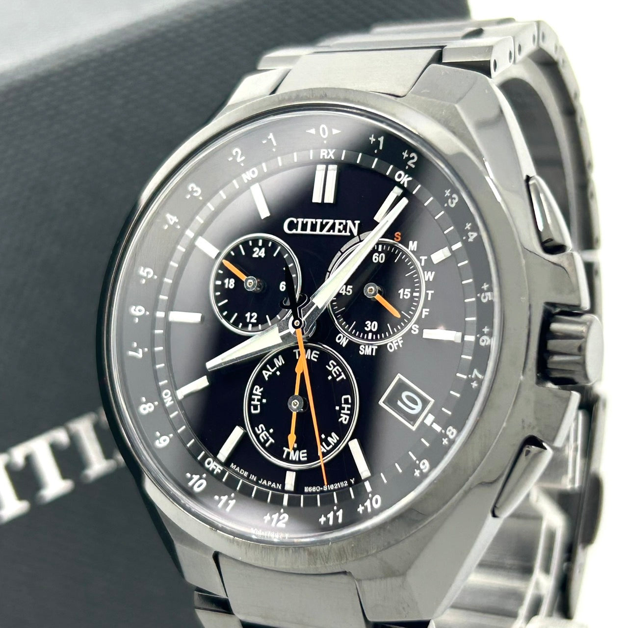 【未使用級/箱付】シチズン アテッサ 腕時計 メンズ E660-S121957 エコドライブ 電波ソーラー クロノグラフ ワールドタイム デイト チタン ブラック文字盤 アナログ ビジネス 高機能 軽量 スタイリッシュ エレガント 高級 クリーニング済 G