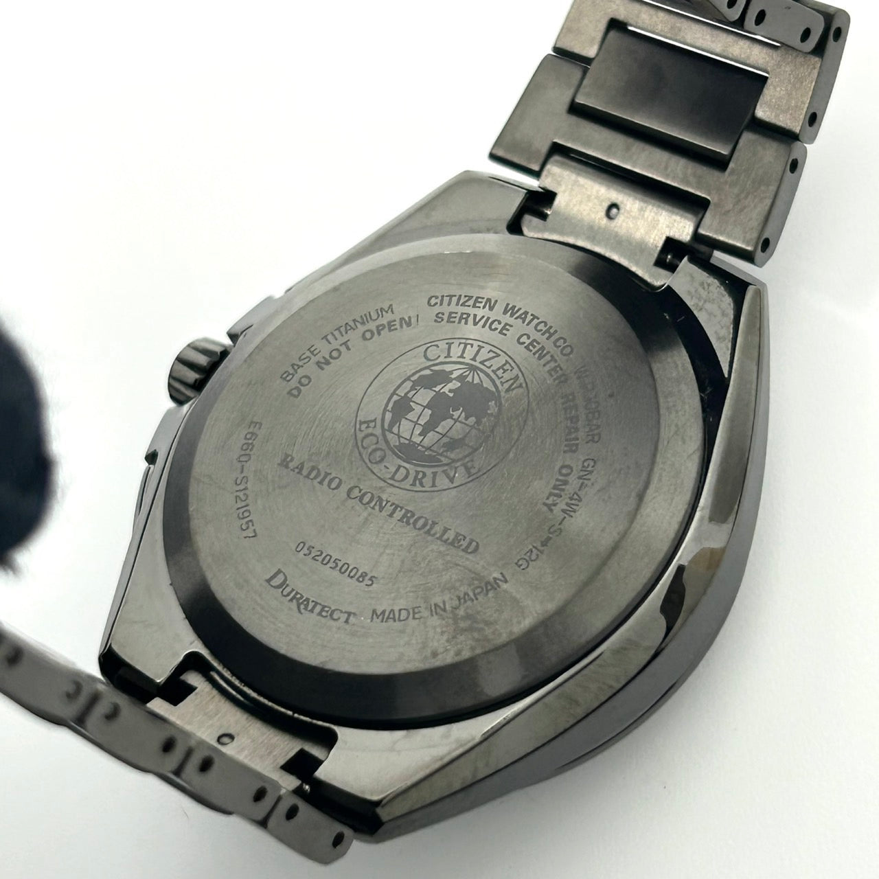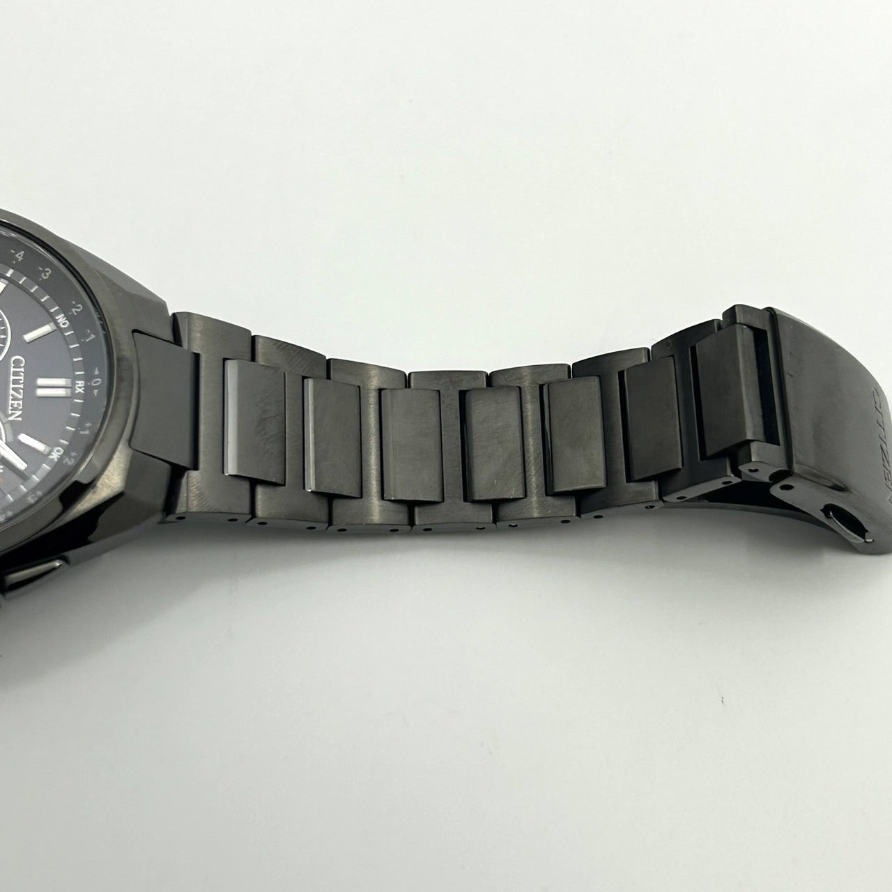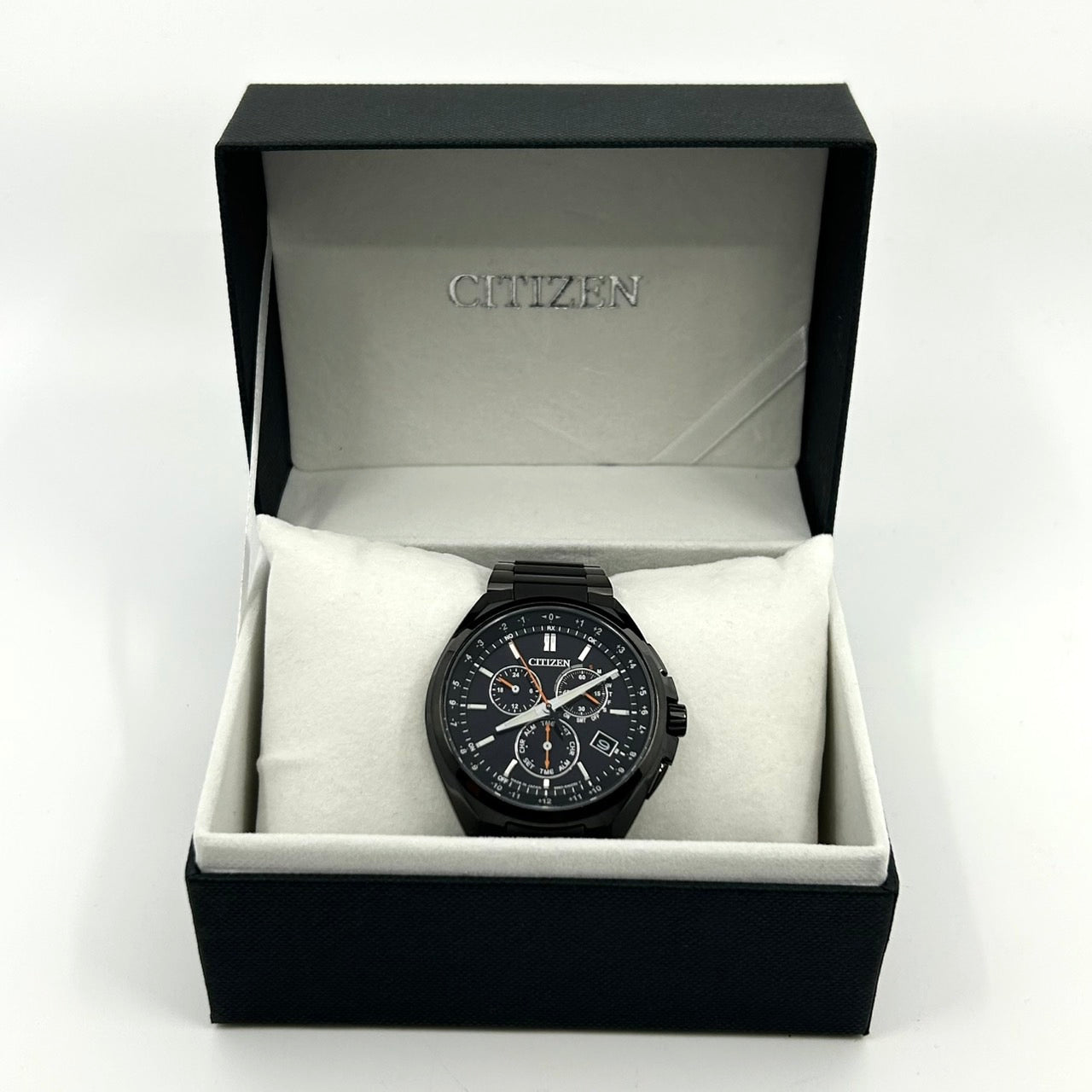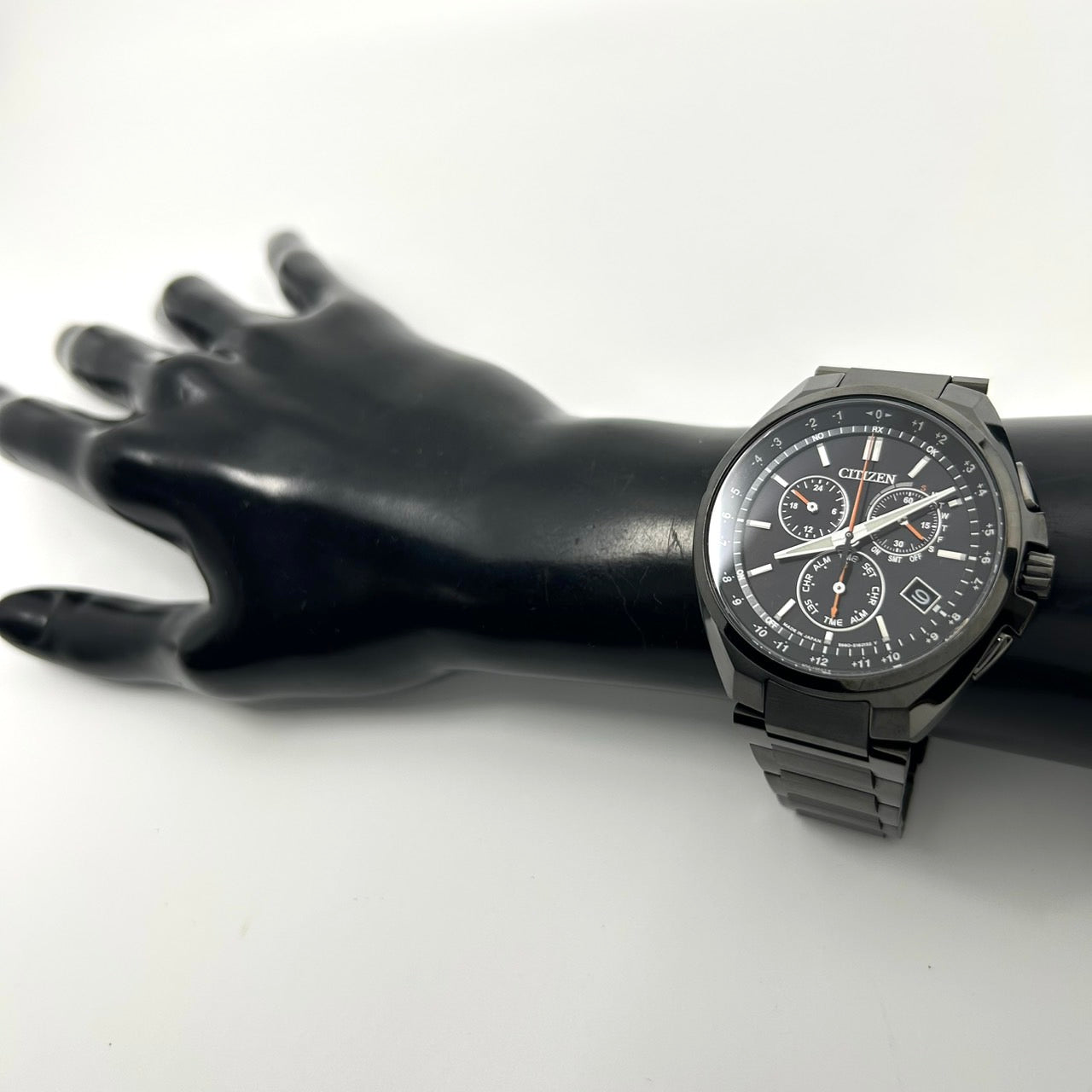 【未使用級/箱付】シチズン アテッサ 腕時計 メンズ E660-S121957 エコドライブ 電波ソーラー クロノグラフ ワールドタイム デイト チタン ブラック文字盤 アナログ ビジネス 高機能 軽量 スタイリッシュ エレガント 高級 クリーニング済 G